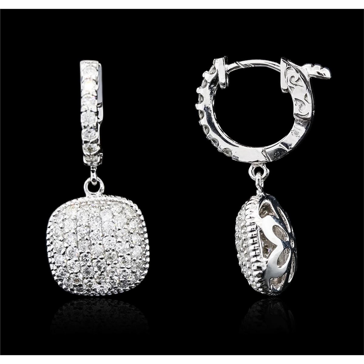 One pair electronically tested 14KT white gold ladies combination cast & assembled diamond earrings with hinged clip backs with a bright polish finish. Identified with markings of "K14". Condition is new. Containing: One Hundred Twelve prong set round brilliant cut diamonds, measuring 1.50 - 1.50 x 0.90mm (depth est.) approximate total weight of 112 Stones = 1.38ct. Clarity: SI-2 to I-1. Color: I - J, Cut is Good. All diamonds are graded in the mounting, unless otherwise stated. Total Weight of Diamonds 1.38ct. Total Weight of Earrings 6.00 grams. GGL Appraised at $5,430.00.