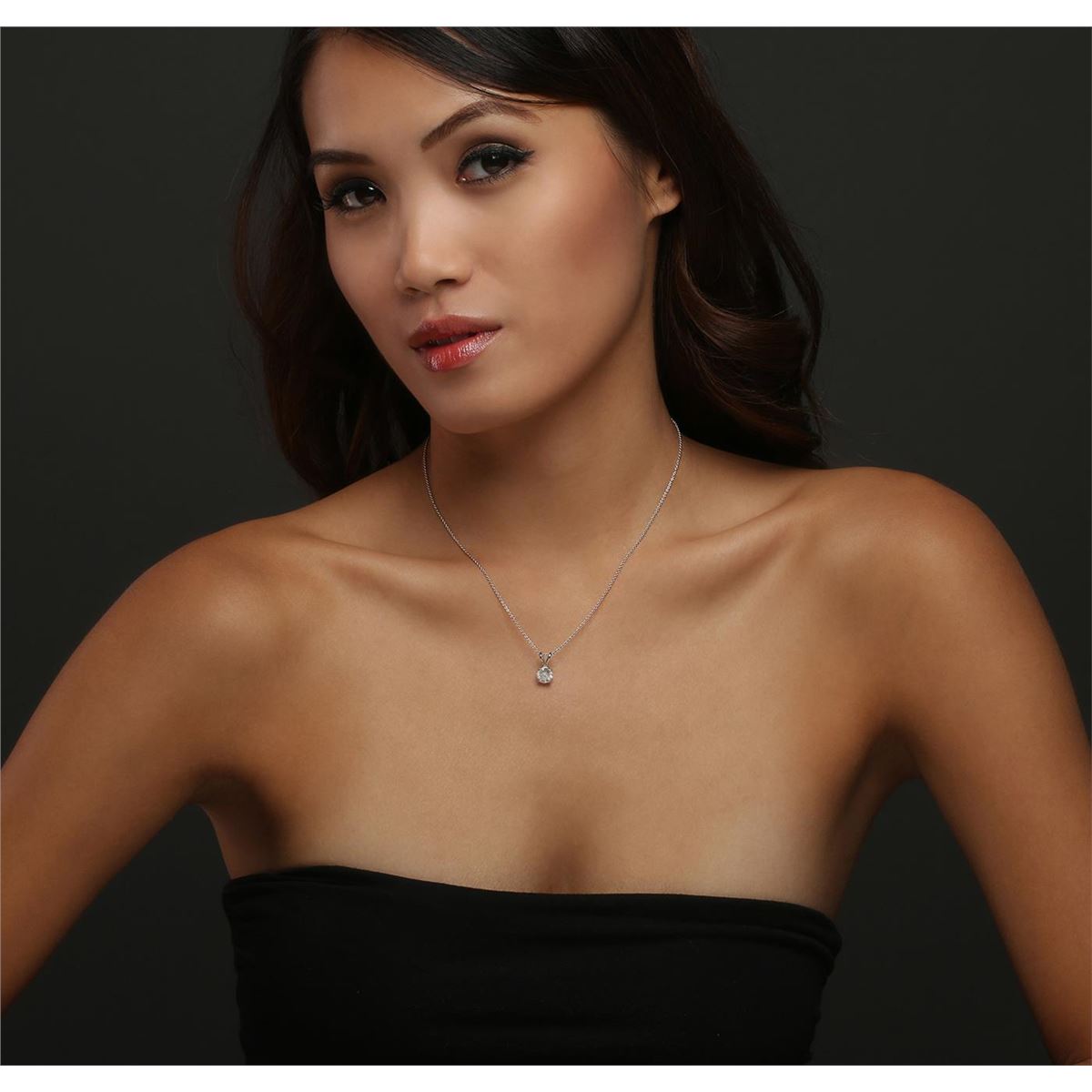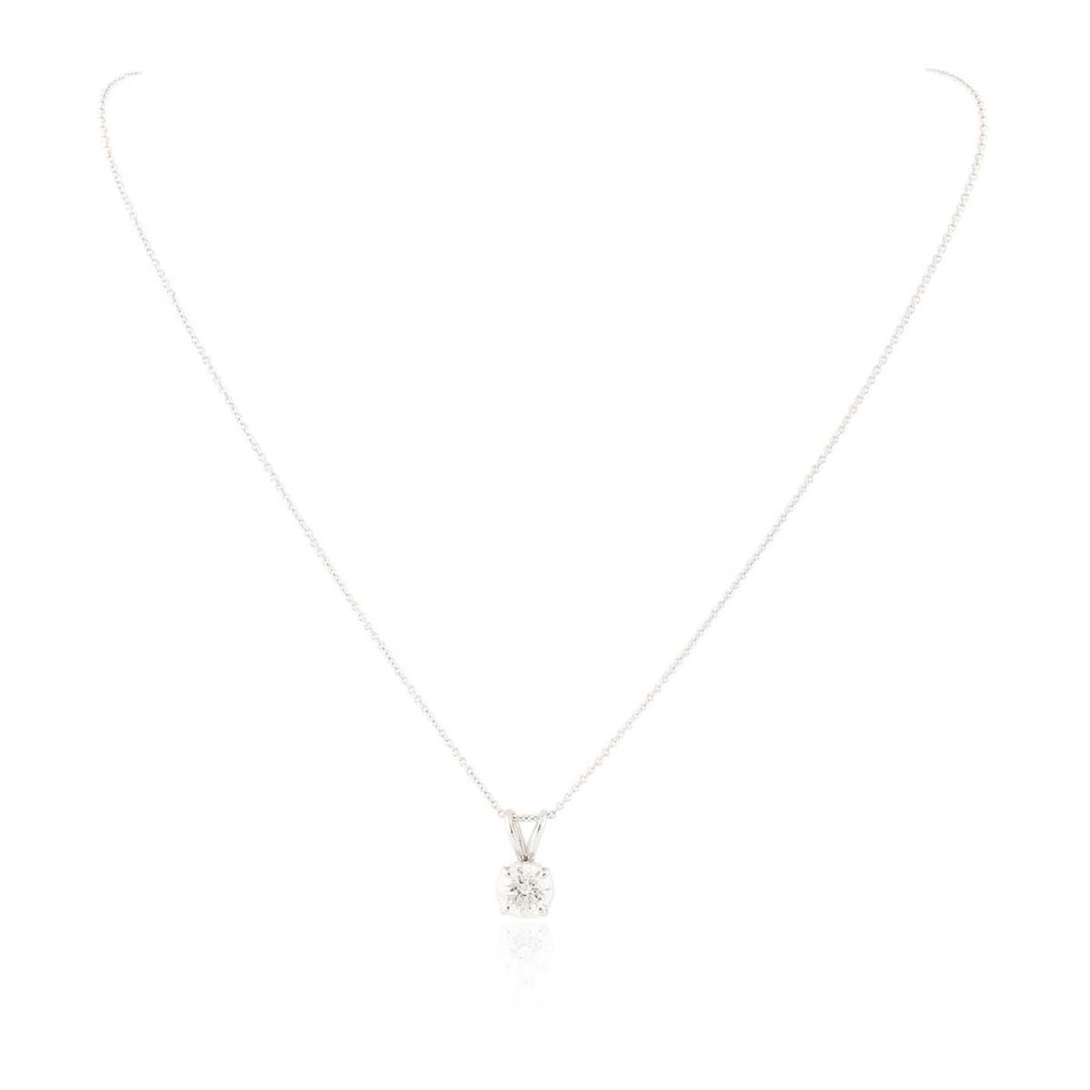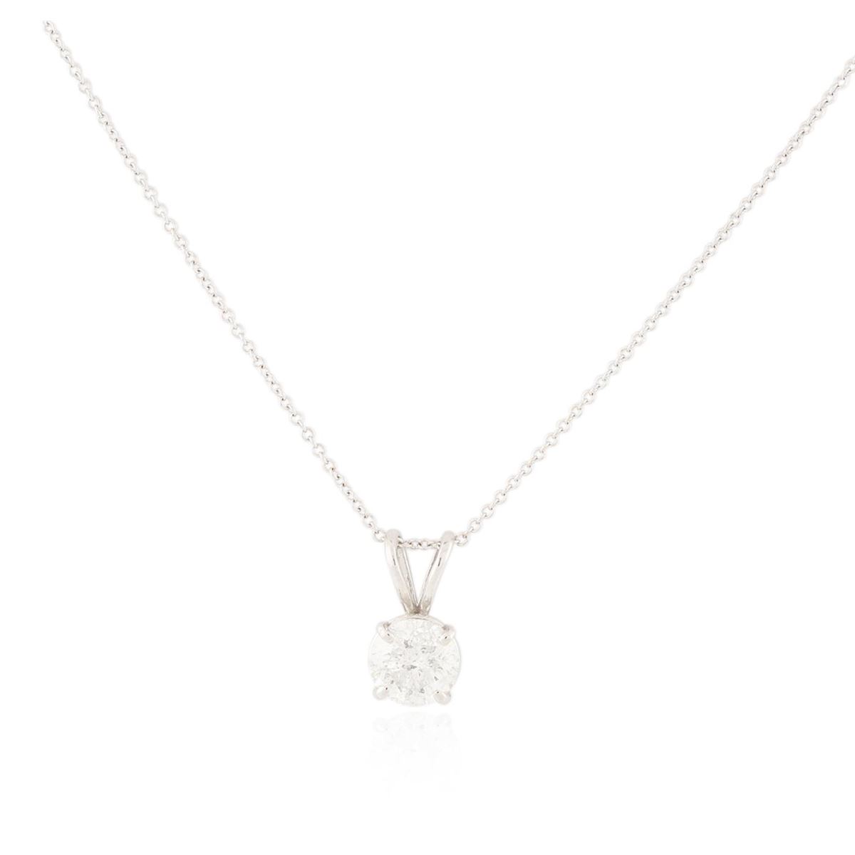One electronically tested 14KT white gold ladies combination cast & die struck solitaire pendant & chain 15.5" long, light cable link with a spring ring clasp with a bright polish finish. Condition is new. Identified with markings of "14K". Containing: One prong set round brilliant cut diamond, measuring 7.00 - 7.00 x 4.60mm (depth est.) approximate weight of 1.38ct. Clarity: I-2. Color: G, Cut is Good. All diamonds are graded in the mounting, unless otherwise stated. Total Weight of Diamonds 1.38ct. Total Weight of Pendant & Chain 2.00 grams. GGL Appraised at $12,915.00.