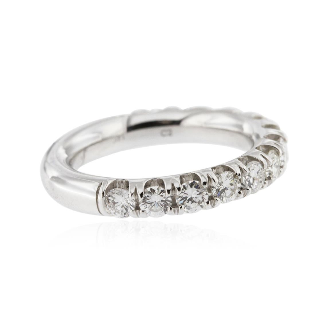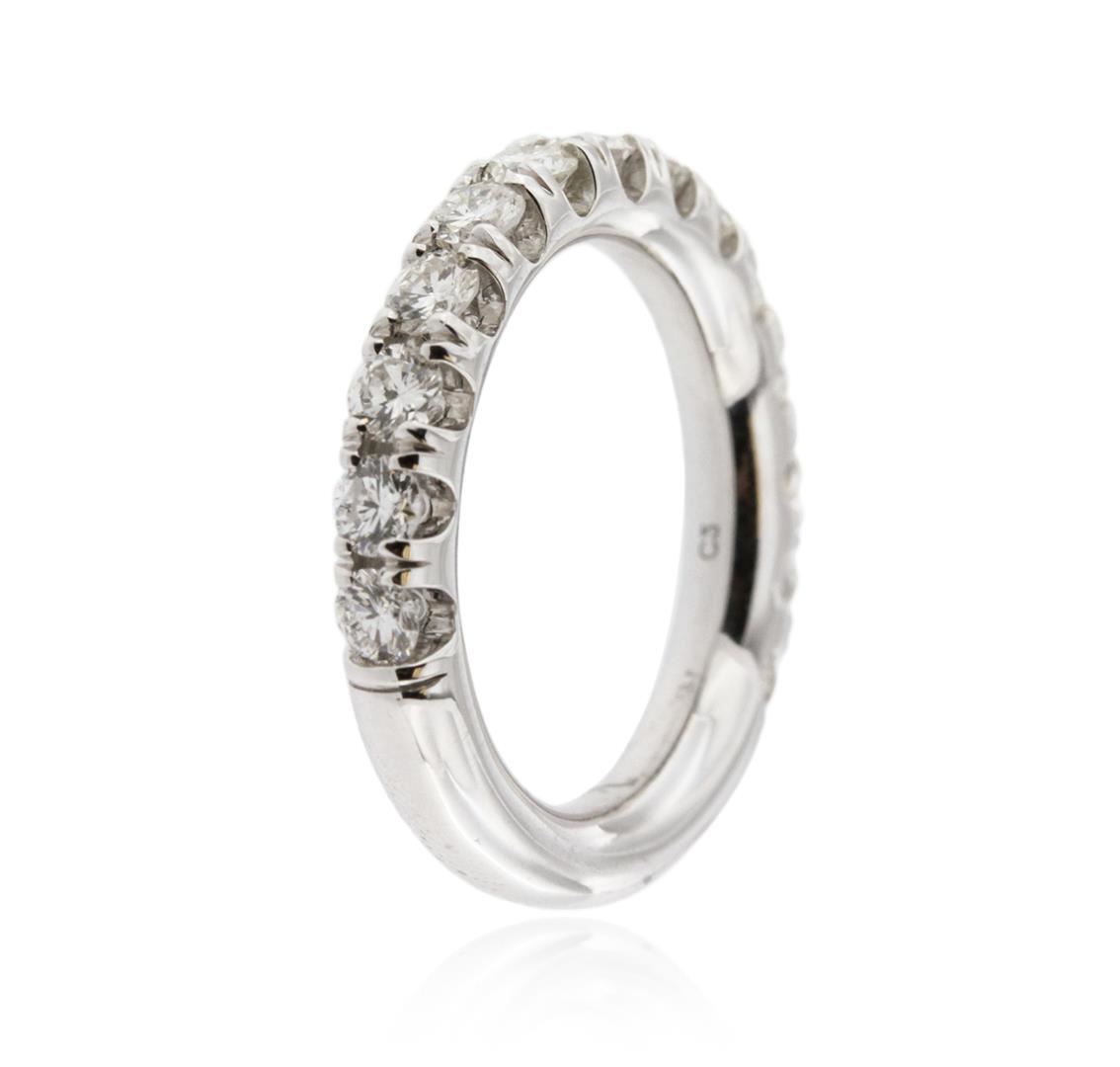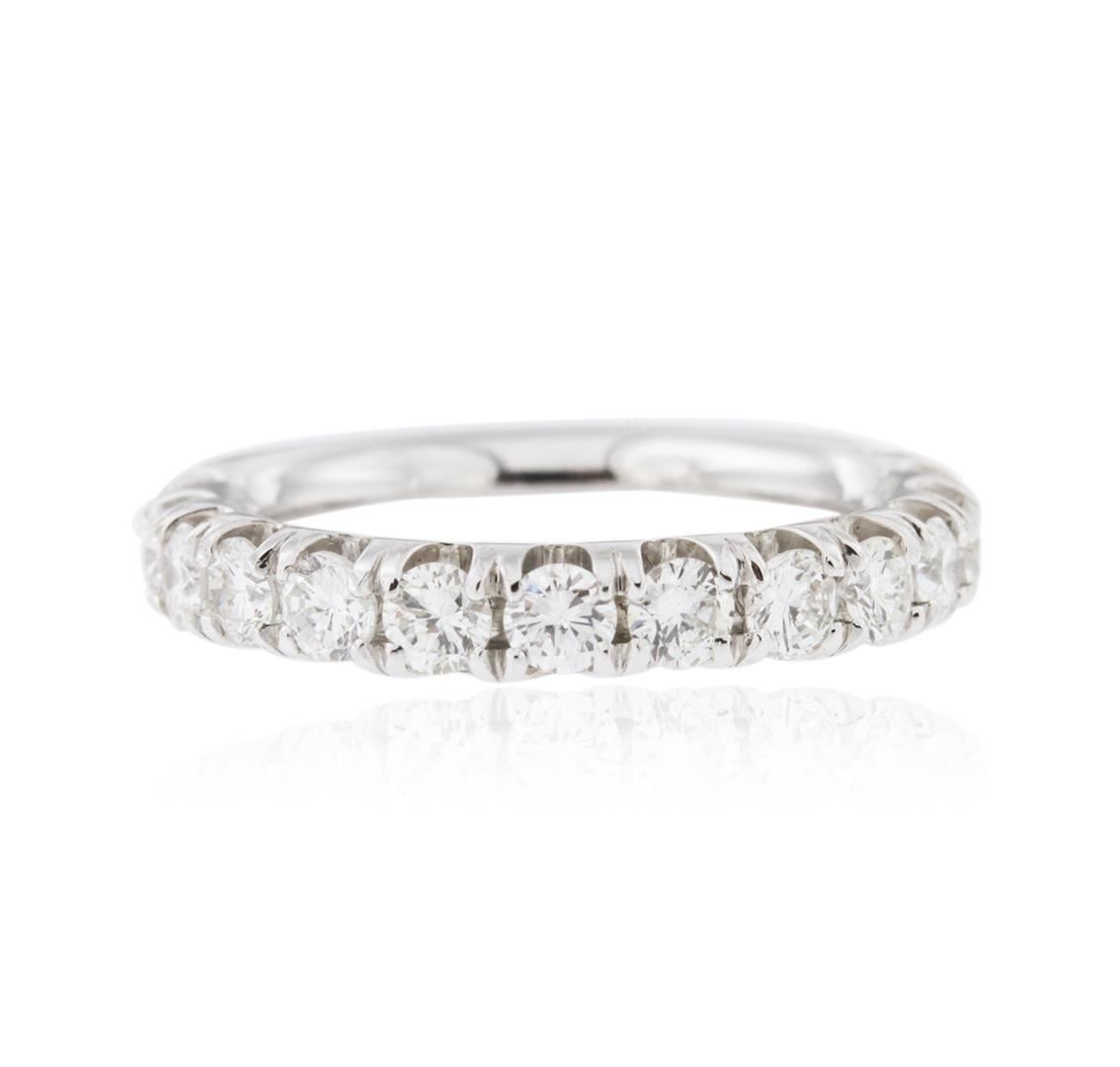 One electronically tested 14KT white gold ladies cast wedding ring with a bright polish finish. Identified with markings of "14K". Condition is new. Containing: Fourteen prong set round brilliant cut diamonds, measuring 3.00 - 3.00 x 1.80mm (depth est.) approximate total weight of 14 Stones = 1.38ct. Clarity: SI-1. Color: J - K, Cut is Good. All diamonds are graded in the mounting, unless otherwise stated. Total Weight of Diamonds 1.38ct. Total Weight of Ring 5.50 grams. GGL Appraised at $4,285.00.