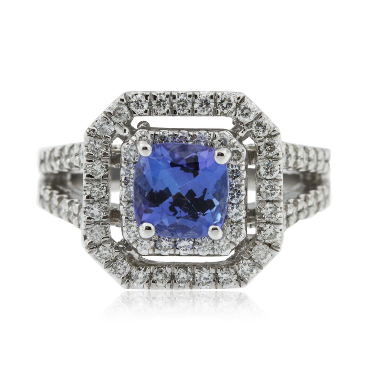 One electronically tested 14KT white gold ladies cast tanzanite and diamond ring with a bright polish finish. Identified with markings of "14KT". Condition is new. Containing: One prong set square cushion modified brilliant cut natural tanzanite, measuring 6.49 x 6.43 x 4.20mm, approximate weight of 1.38ct., clarity is eye clean, type I, medium, very slightly grayish, violet color, (GIA V 5/3), cut is very good. Seventy-Two prong set round brilliant cut diamonds, measuring 1.30 - 1.30 x 0.78mm (depth est.) approximate total weight of 72 Stones = 0.58ct. Clarity: SI-1 to SI-2. Color: J - K, Cut is Good. Colored gemstones are presumed to have been subjected to commonly used enhancement processes. All diamonds and colored gemstones are graded in the mounting, unless otherwise stated. Total Weight of Colored Stones 1.38ct. Total Weight of Diamonds 0.58ct. Total Weight of Ring 7.90 grams. GGL Appraised at $4,575.00.