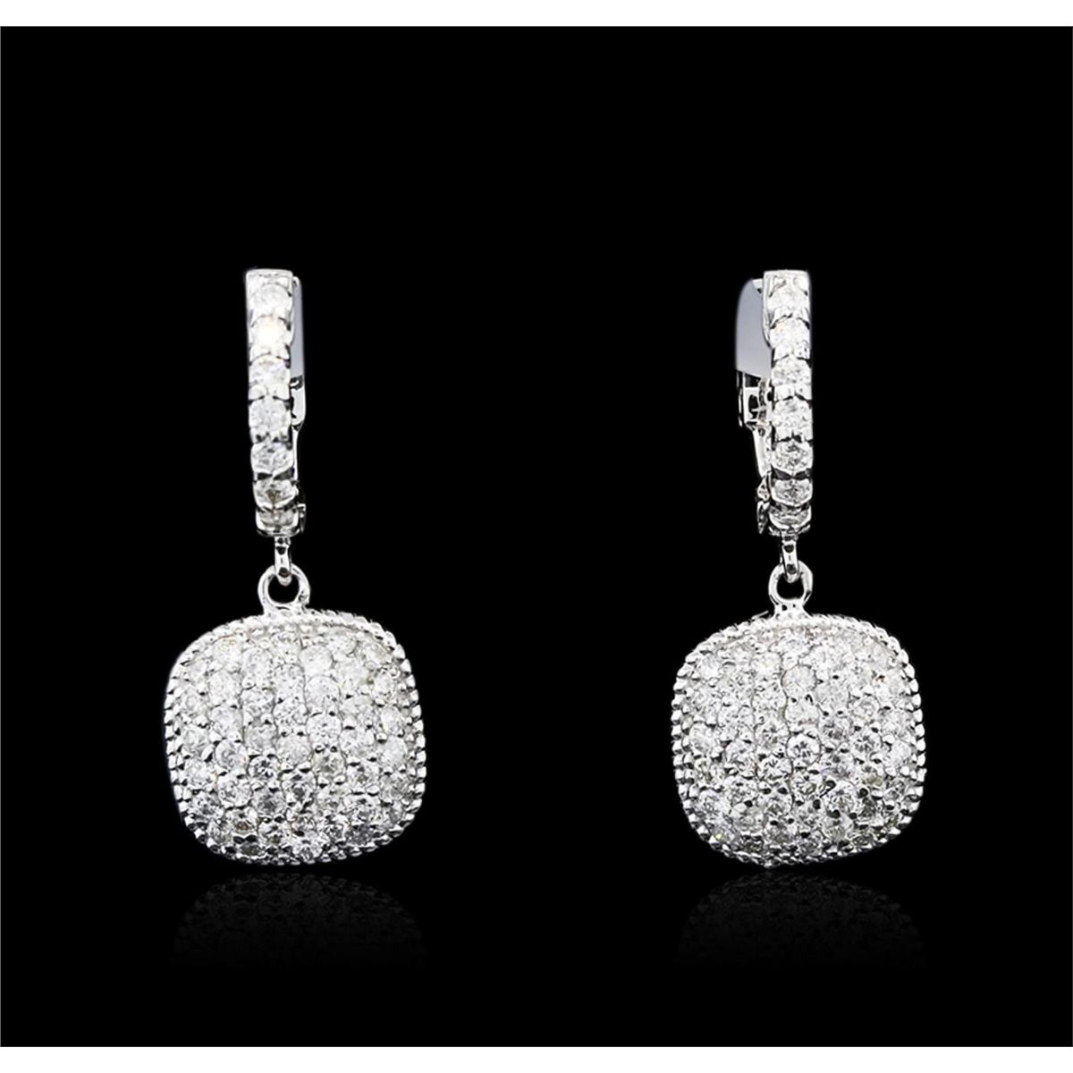 One pair electronically tested 14KT white gold ladies combination cast & assembled diamond earrings with hinged clip backs with a bright polish finish. Identified with markings of "K14". Condition is new. Containing: One Hundred Twelve prong set round brilliant cut diamonds, measuring 1.50 - 1.50 x 0.90mm (depth est.) approximate total weight of 112 Stones = 1.38ct. Clarity: SI-2 to I-1. Color: I - J, Cut is Good. All diamonds are graded in the mounting, unless otherwise stated. Total Weight of Diamonds 1.38ct. Total Weight of Earrings 6.00 grams. GGL Appraised at $5,430.00.
