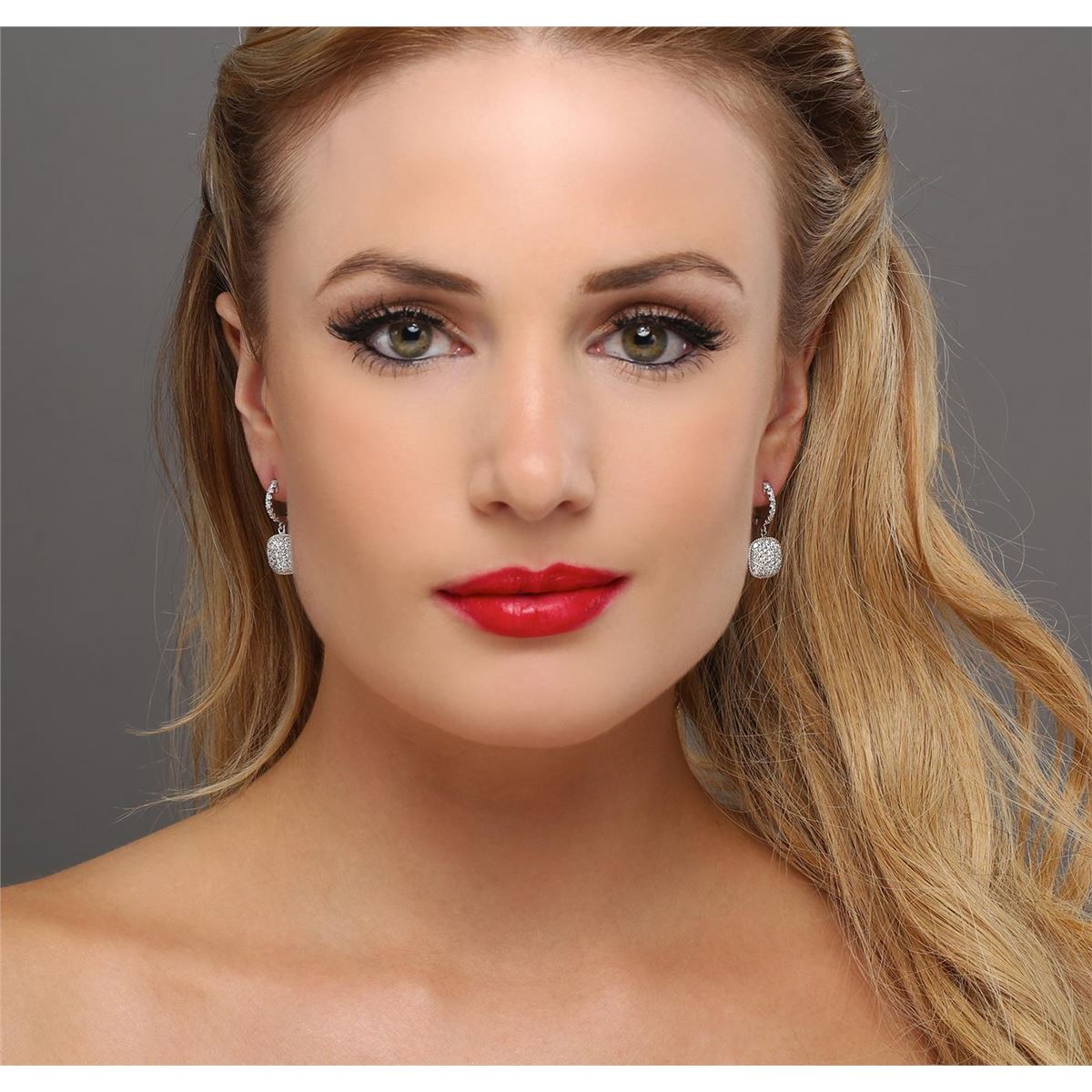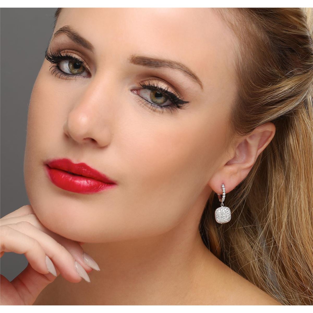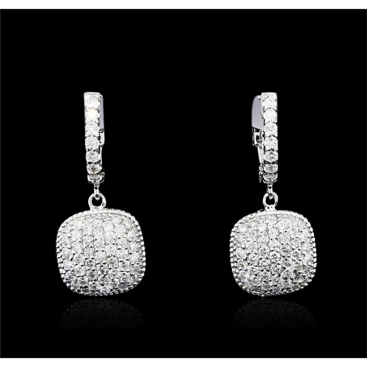 One pair electronically tested 14KT white gold ladies combination cast & assembled diamond earrings with hinged clip backs with a bright polish finish. Identified with markings of "K14". Condition is new. Containing: One Hundred Twelve prong set round brilliant cut diamonds, measuring 1.50 - 1.50 x 0.90mm (depth est.) approximate total weight of 112 Stones = 1.38ct. Clarity: SI-2 to I-1. Color: I - J, Cut is Good. All diamonds are graded in the mounting, unless otherwise stated. Total Weight of Diamonds 1.38ct. Total Weight of Earrings 6.00 grams. GGL Appraised at $5,430.00.