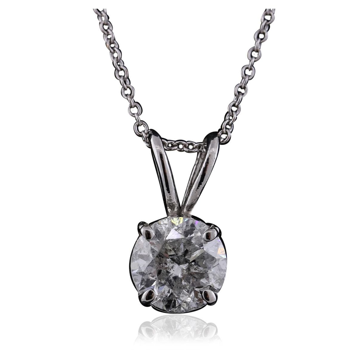 One electronically tested 14KT white gold ladies combination cast & die struck solitaire pendant & chain 15.5" long, light cable link with a spring ring clasp with a bright polish finish. Condition is new. Identified with markings of "14K". Containing: One prong set round brilliant cut diamond, measuring 7.00 - 7.00 x 4.60mm (depth est.) approximate weight of 1.38ct. Clarity: I-2. Color: G, Cut is Good. All diamonds are graded in the mounting, unless otherwise stated. Total Weight of Diamonds 1.38ct. Total Weight of Pendant & Chain 2.00 grams. GGL Appraised at $12,915.00.
