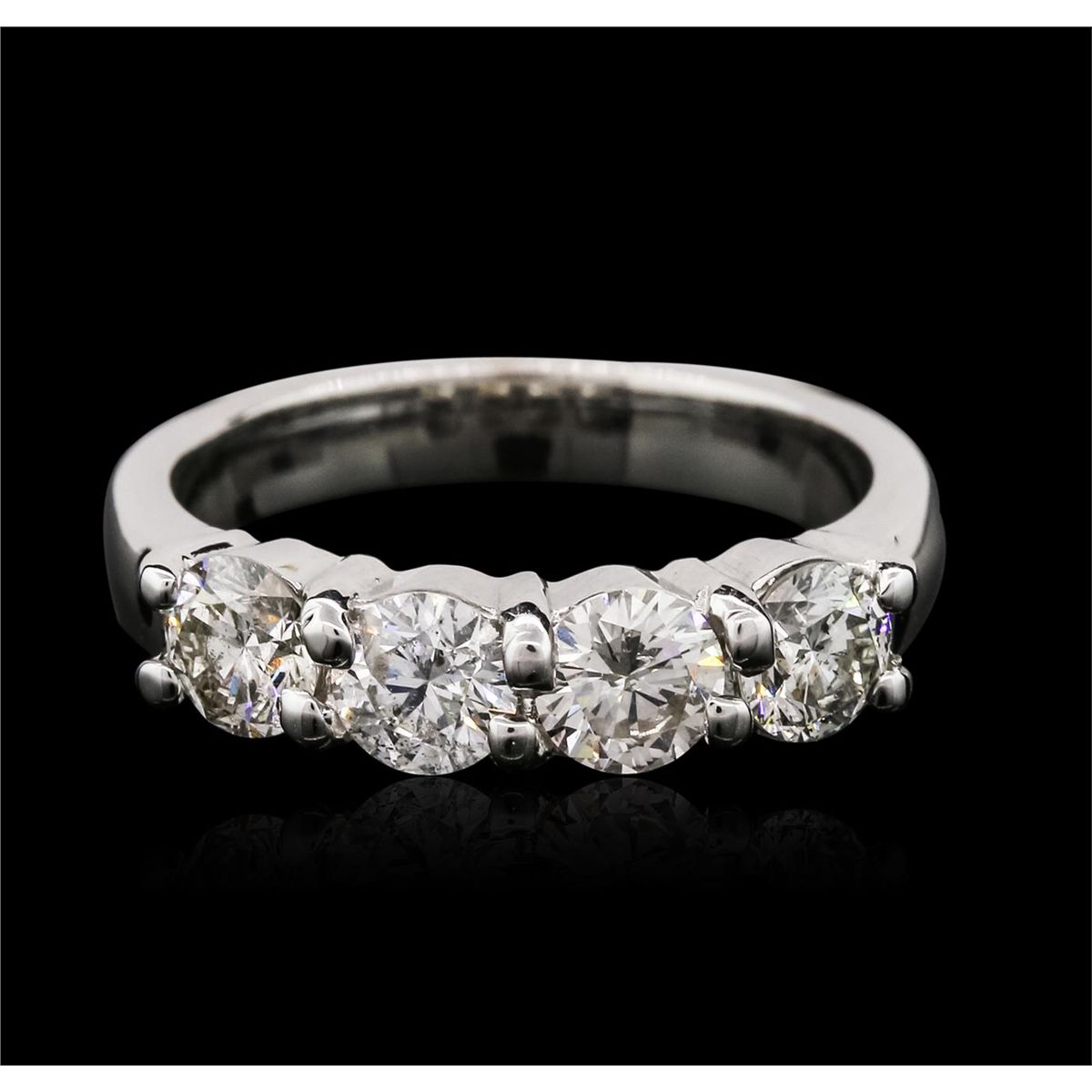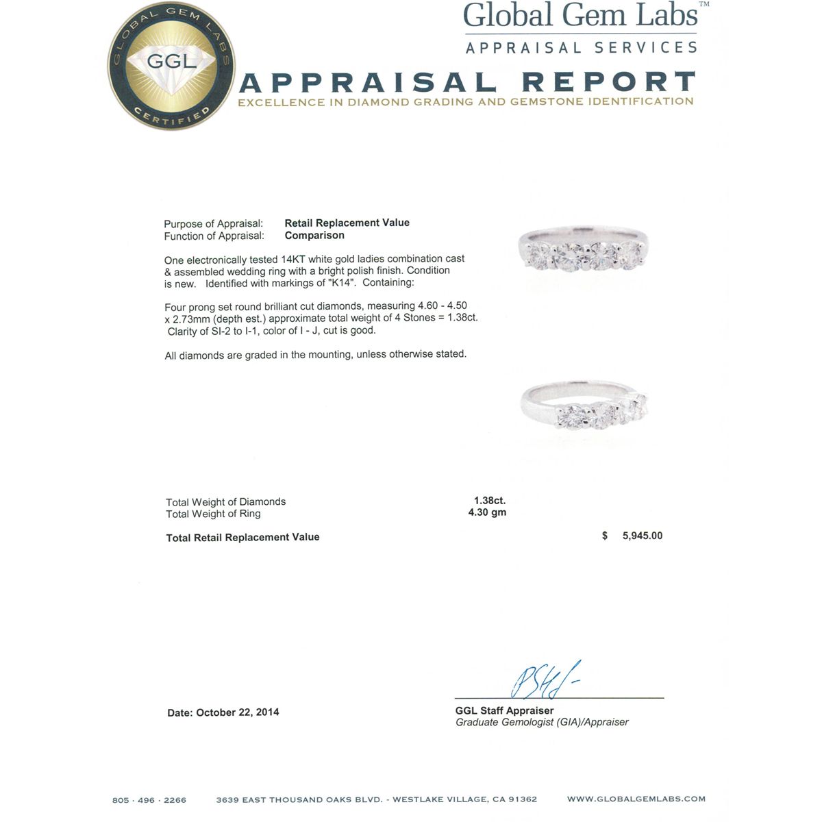 One electronically tested 14KT white gold ladies combination cast & assembled wedding ring with a bright polish finish. Identified with markings of "K14". Condition is new. Containing: Four prong set round brilliant cut diamonds, measuring 4.60 - 4.50 x 2.73mm (depth est.) approximate total weight of 4 Stones = 1.38ct. Clarity: SI-2 to I-1. Color: I - J, Cut is Good. All diamonds are graded in the mounting, unless otherwise stated. Total Weight of Diamonds 1.38ct. Total Weight of Ring 4.30 grams. GGL Appraised at $5,945.00.