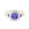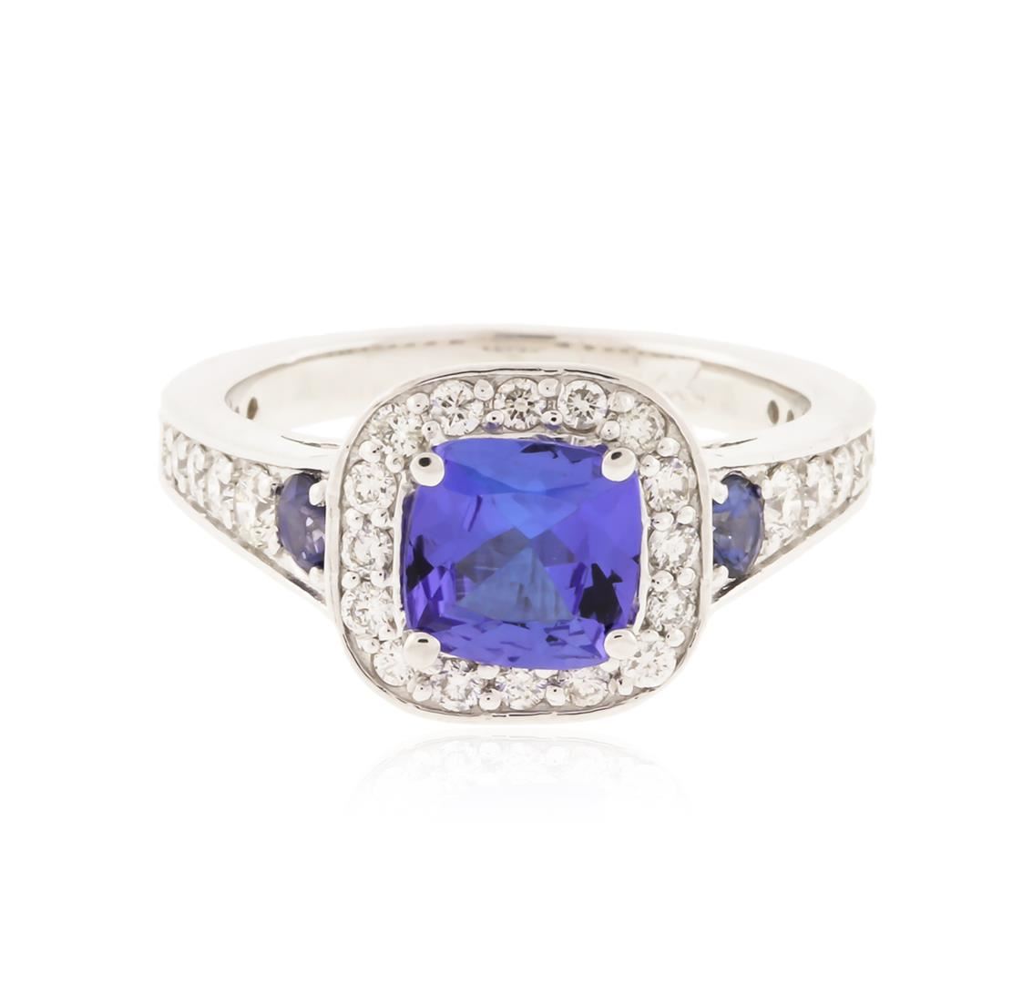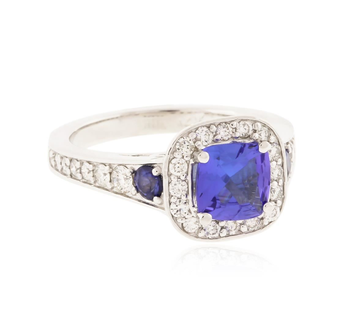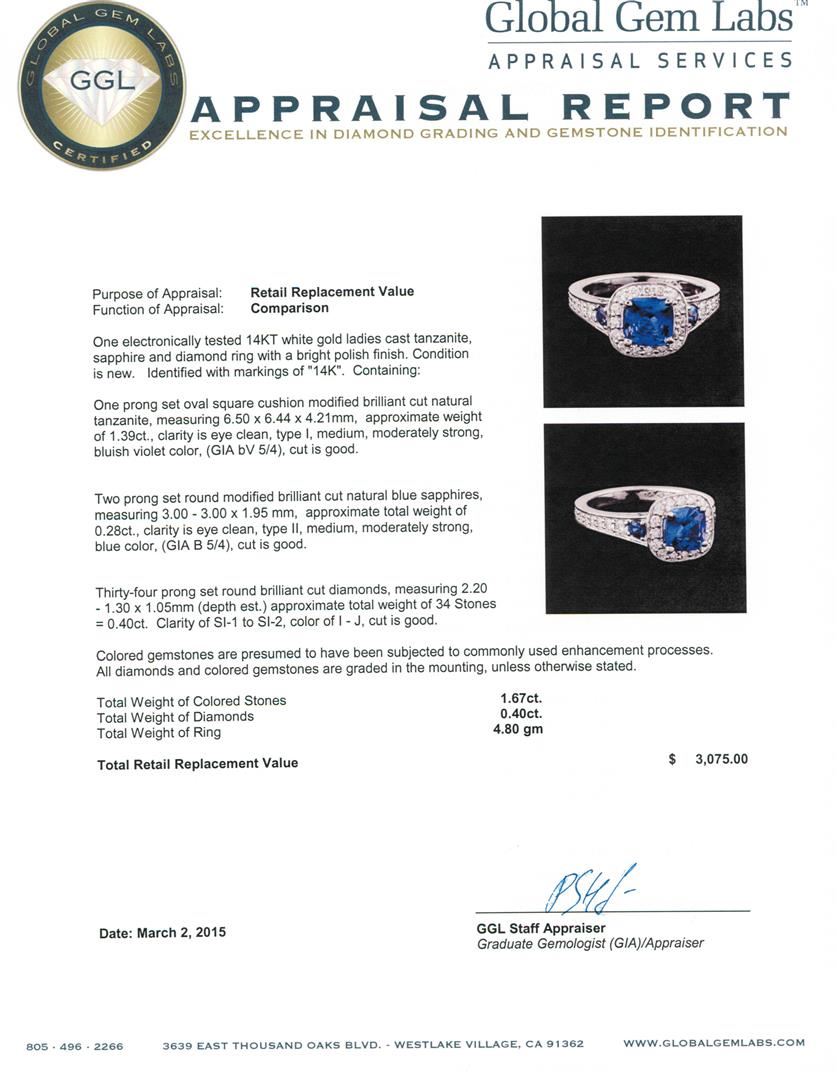 One electronically tested 14KT white gold ladies cast tanzanite, sapphire and diamond ring with a bright polish finish. Identified with markings of "14K". Condition is new. Containing: One prong set oval square cushion modified brilliant cut natural tanzanite, measuring 6.50 x 6.44 x 4.21mm, approximate weight of 1.39ct., clarity is eye clean, type I, medium, moderately strong, bluish violet color, (GIA bV 5/4), cut is good. Two prong set round modified brilliant cut natural blue sapphires, measuring 3.00 - 3.00 x 1.95 mm, approximate total weight of 0.28ct., clarity is eye clean, type II, medium, moderately strong, blue color, (GIA B 5/4), cut is good. Thirty-Four prong set round brilliant cut diamonds, measuring 2.20 - 1.30 x 1.05mm (depth est.) approximate total weight of 34 Stones = 0.40ct. Clarity: SI-1 to SI-2. Color: I - J, Cut is Good. Colored gemstones are presumed to have been subjected to commonly used enhancement processes. All diamonds and colored gemstones are graded in the mounting, unless otherwise stated. Total Weight of Colored Stones 1.67ct. Total Weight of Diamonds 0.40ct. Total Weight of Ring 4.80 grams. GGL Appraised at $3,075.00.