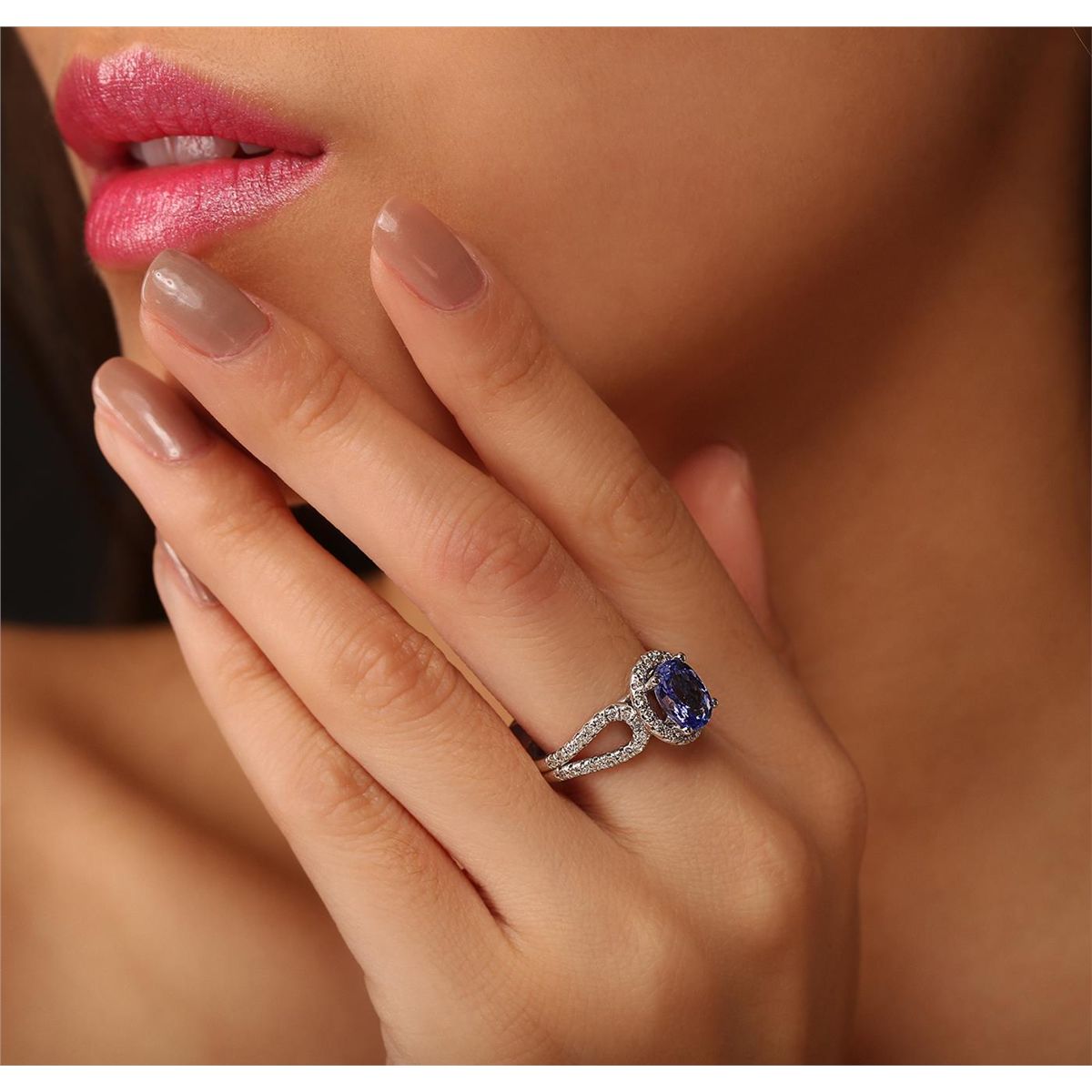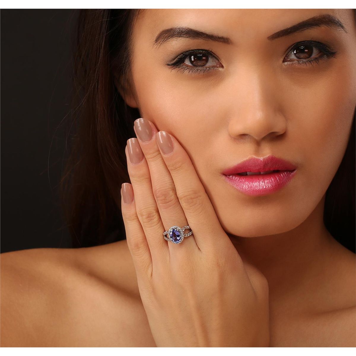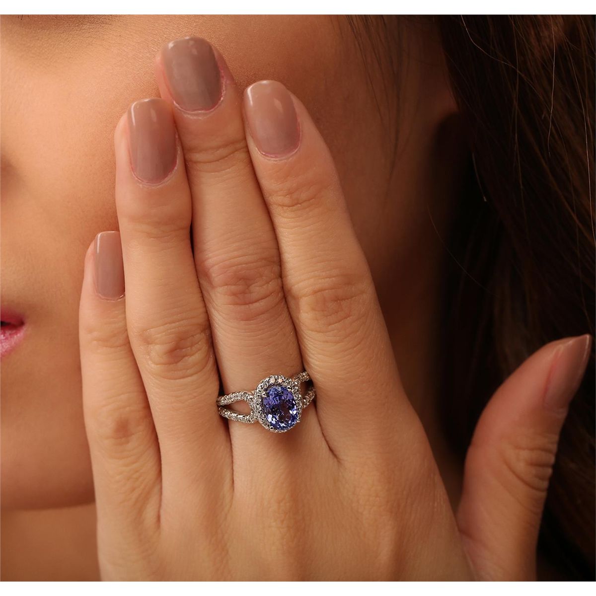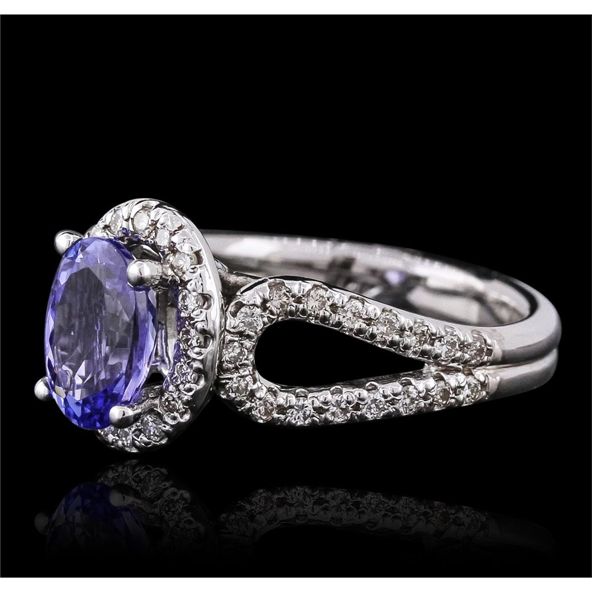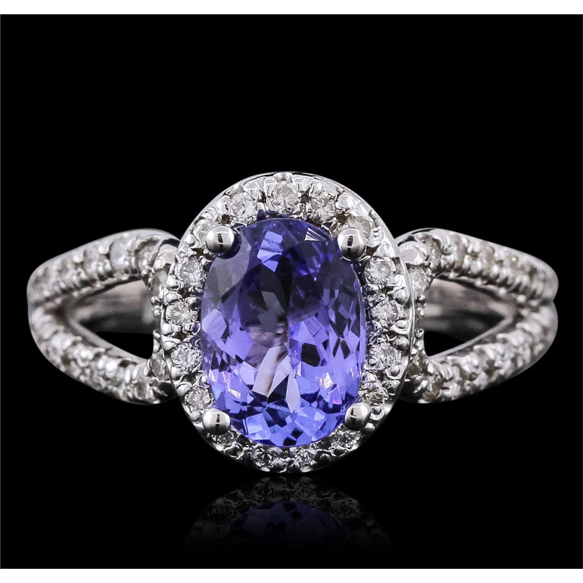 One electronically tested 14KT white gold ladies combination cast & assembled ring with a bright polish finish. Condition is new. Identified with markings of "14K". Containing: One prong set oval modified brilliant cut natural tanzanite, measuring 8.60 x 6.20 x 3.80mm, approximate weight of 1.39ct., clarity is eye clean, type I, medium light, very slightly grayish, bluish violet color, (GIA bV 4/3), cut is good. Fifty-One prong set round brilliant cut diamonds, measuring 1.50 - 1.50 x 0.90mm (depth est.) approximate total weight of 51 Stones = 0.63ct. Clarity: SI-2 to I-1. Color: I - J, Cut is Good. Colored gemstones are presumed to have been subjected to commonly used enhancement processes. All diamonds and colored gemstones are graded in the mounting, unless otherwise stated. Total Weight of Colored Stones 1.39ct. Total Weight of Diamonds 0.63ct. Total Weight of Ring 5.80 grams. GGL Appraised at $5,095.00.
