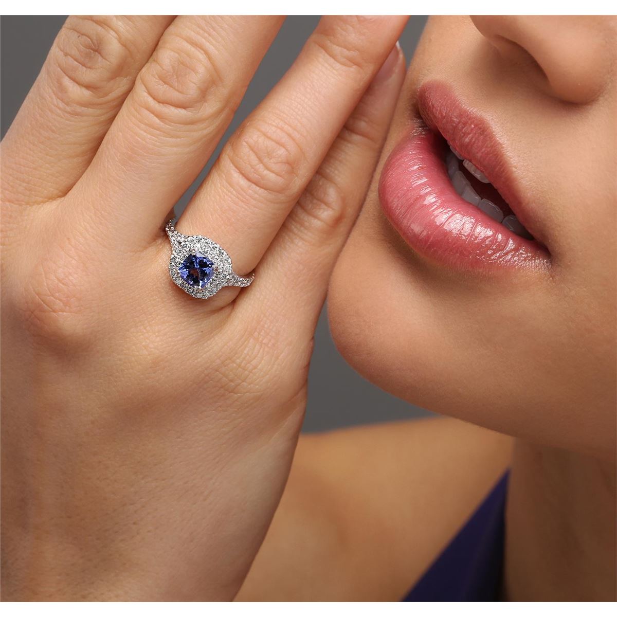 One electronically tested 14KT white gold ladies cast tanzanite and diamond ring with a bright polish finish. Identified with markings of "14KT". Condition is new. Containing: One prong set square cushion modified brilliant cut natural tanzanite, measuring 6.57 x 6.36 x 4.21mm, approximate weight of 1.39ct., clarity is eye clean, type I, medium light, very slightly grayish, violet color, (GIA V 4/3), cut is very good. Fifty-Eight prong set round brilliant cut diamonds, measuring 1.30 - 1.30 x 0.78mm (depth est.) approximate total weight of 58 Stones = 0.46ct. Clarity: SI-2 to I-1. Color: J, Cut is Good. Colored gemstones are presumed to have been subjected to commonly used enhancement processes. All diamonds and colored gemstones are graded in the mounting, unless otherwise stated. Total Weight of Colored Stones 1.39ct. Total Weight of Diamonds 0.46ct. Total Weight of Ring 4.70 grams. GGL Appraised at $3,430.00.