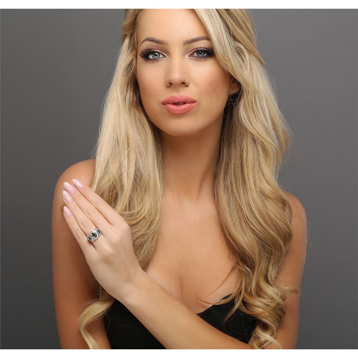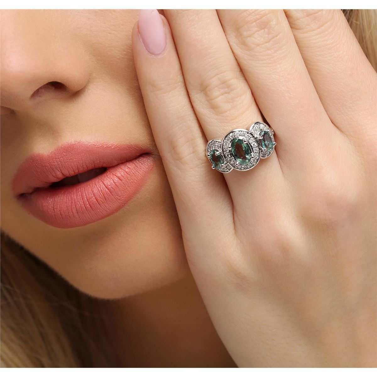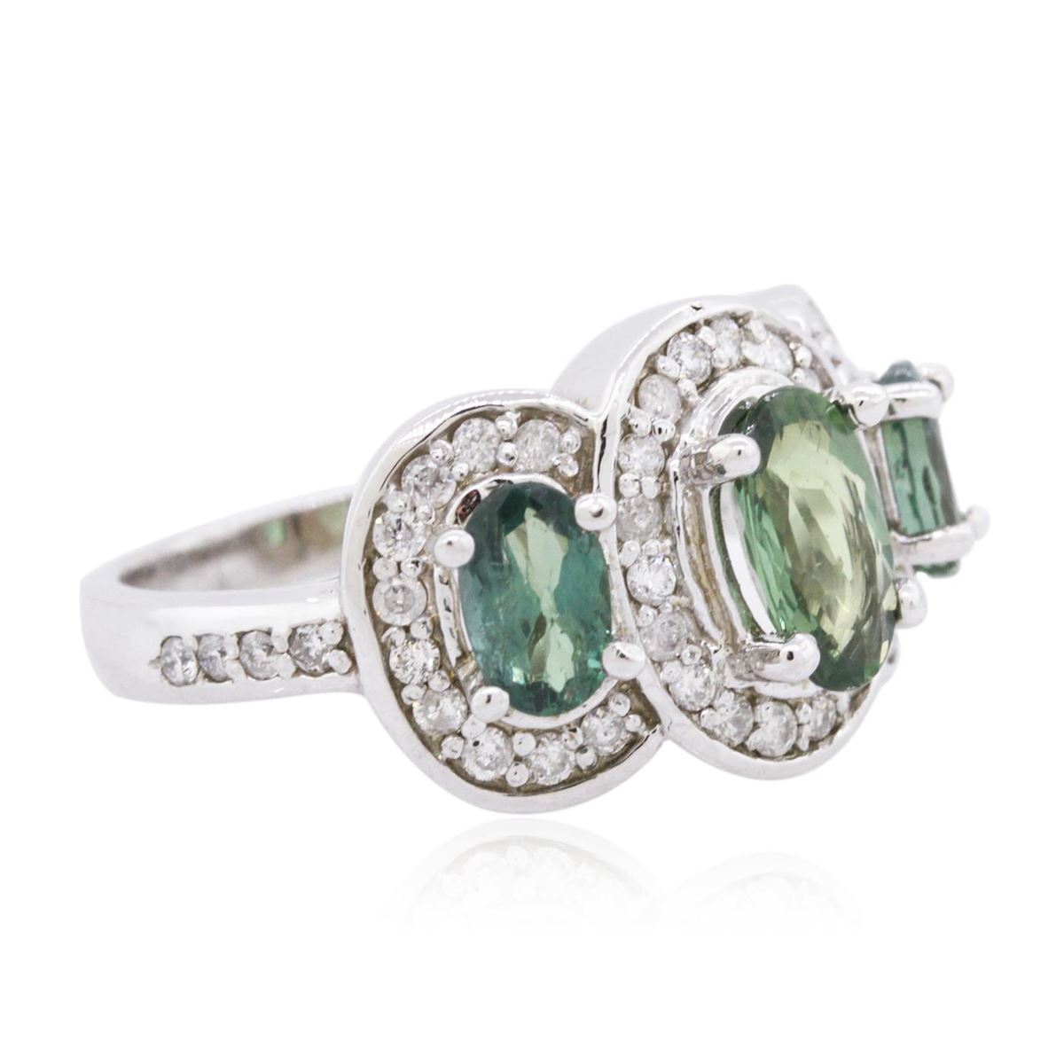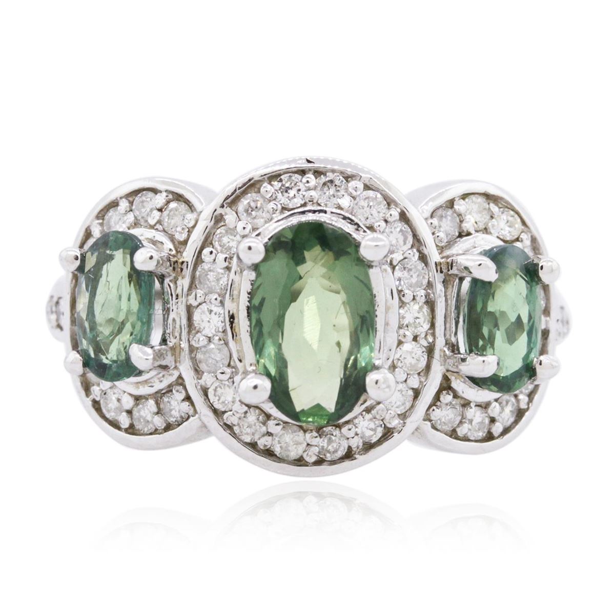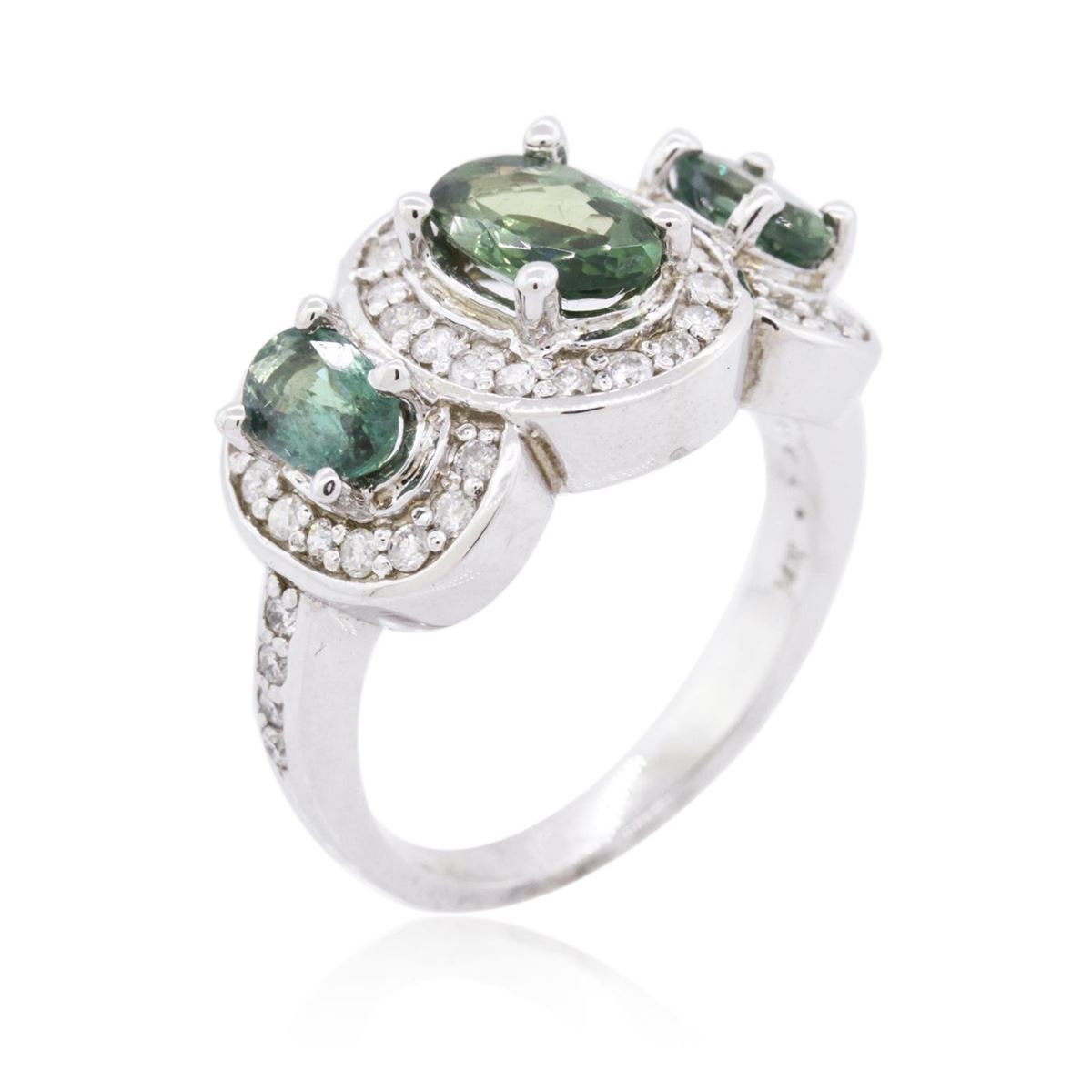 One electronically tested 14KT white gold ladies combination cast & assembled alexandrite and diamond ring with a flat shank with a bright polish finish. Identified with markings of "14K". Condition is new. Containing: One prong set oval modified brilliant cut natural alexandrite, measuring 8.17 x 4.89 x 2.06mm, approximate weight of 0.64ct., clarity is slightly included, type II, light, slightly grayish, bluish green color, (GIA bG 3/2), cut is good. Two prong set oval modified brilliant cut natural alexandrites, measuring 5.92 x 3.78 x 2.19mm, approximate total weight of 0.76ct., clarity is slightly included, type II, light, slightly grayish, bluish green color, (GIA bG 3/2), cut is good. Forty-Six prong set round brilliant cut diamonds, measuring 1.30 - 1.30 x 0.78mm (depth est.) approximate total weight of 46 Stones = 0.37ct. Clarity: I-1 to I-2. Color: I - J, Cut is Good. All diamonds and colored gemstones are graded in the mounting, unless otherwise stated. Colored gemstones are presumed to have been subjected to commonly used enhancement processes. Total Weight of Colored Stones 1.40ct. Total Weight of Diamonds 0.37ct. Total Weight of Ring 6.50 grams. GGL Appraised at $6,025.00.