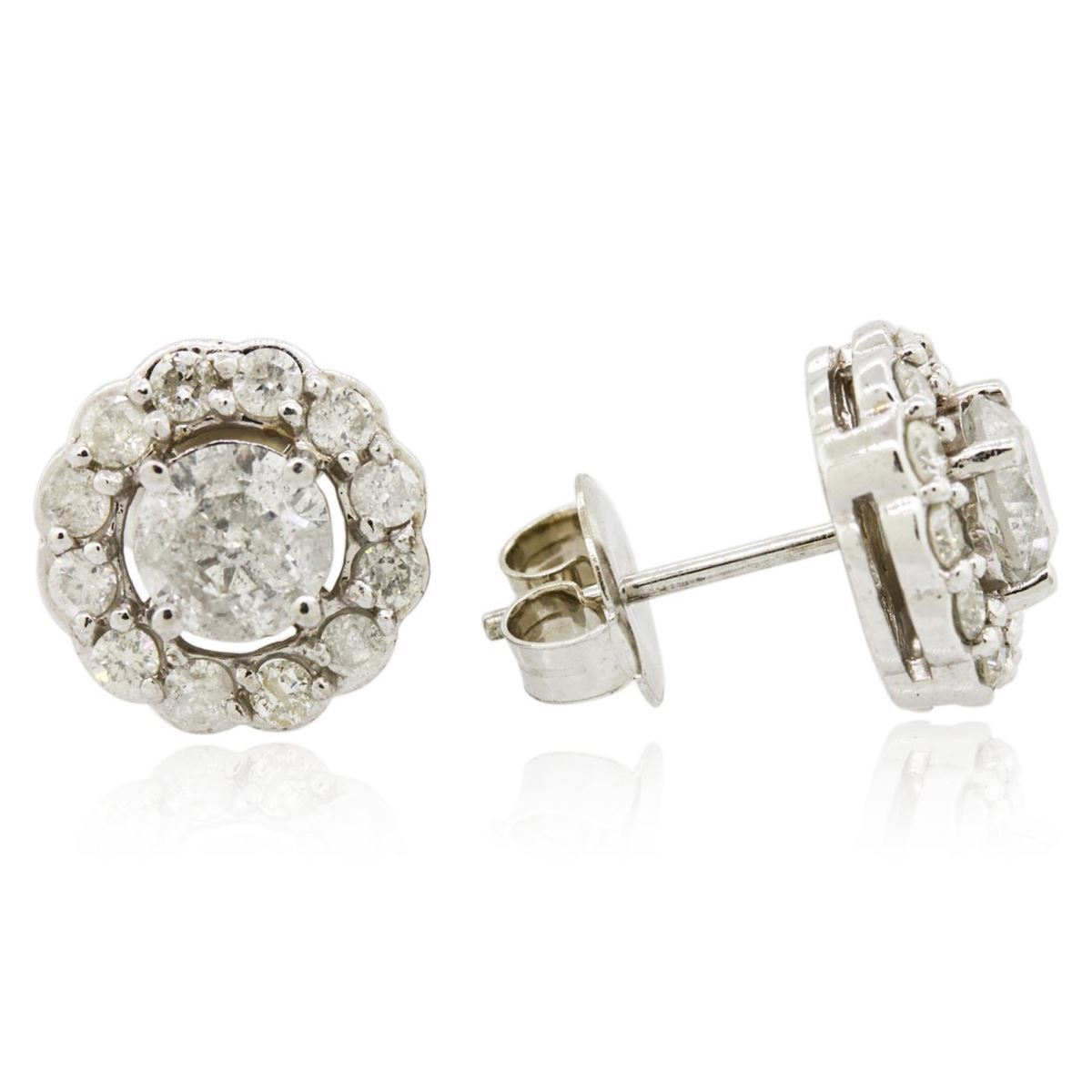 One pair electronically tested 14KT white gold ladies cast & assembled diamond floret earrings with standard backs. Condition is new, good workmanship. Bright polish finish. Identified with markings of "585". Containing: Two prong set round brilliant cut diamonds, measuring 5.70 - 5.60 x 3.39mm (depth est.) approximate. Total Weight of 2 Stones = 0.52ct. Graded in the setting. Clarity: I-2 to I-3. Color: H - I Twenty-Four prong set round brilliant cut diamonds, measuring 2.10 - 2.00 x 1.23mm (depth est.) approximate. Total Weight of 24 Stones = 0.88ct. Graded in the setting. Clarity: I-1 to I-3. Color: H - I. Total Weight of Diamonds 1.40ct. Total Weight of Earrings 4.50 grams. AIG Appraised at $3,600.00.