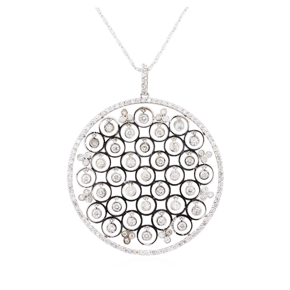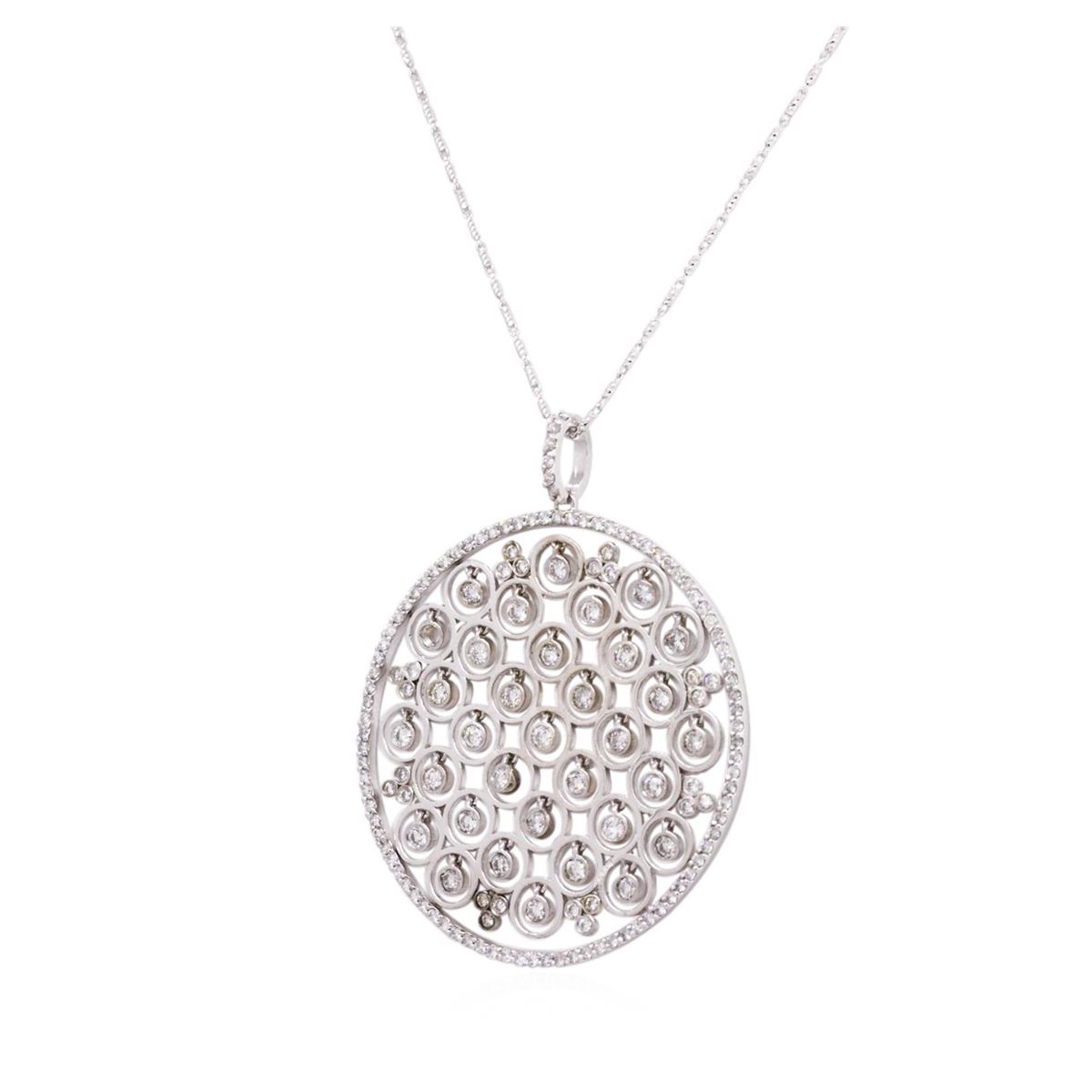 One electronically tested 14KT white gold ladies combination cast & assembled diamond pendant & chain 18.0" long, fancy link with a lobster claw clasp with a bright polish finish. Identified with markings of "K14". Condition is new. Containing: One Hundred Three prong set round brilliant cut diamonds, measuring 1.80 - 1.30 x 0.93mm (depth est.) approximate total weight of 103 Stones = 1.40ct. Clarity: SI-1 to SI-2. Color: I - J, Cut is Good. All diamonds are graded in the mounting, unless otherwise stated. Total Weight of Diamonds 1.40ct. Total Weight of Pendant & Chain 15.90 grams. GGL Appraised at $8,530.00.