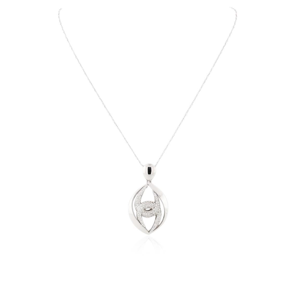 One electronically tested 14KT white gold ladies cast & assembled diamond pendant with chain. The pendant features two intertwining diamond set "u" shapes set within mirroring white gold ribbons, completed by a white gold bail. The pendant is supported by an eighteen inch length 14KT white gold designer style chain, terminating in a lobster claw clasp. Identified with markings of "14K". Condition is new, good workmanship. Containing: Ninety-Six prong set round brilliant cut diamonds, measuring 1.60 - 1.50 x 0.93mm (depth est.) approximate total weight of 96 Stones = 1.40ct. Graded in the setting. Clarity: SI-1 to I-1. Color: H - J. Total Weight of Diamonds 1.40ct. Total Weight of Pendant With Chain 13.81 grams. AIG Appraised at $6,295.00.