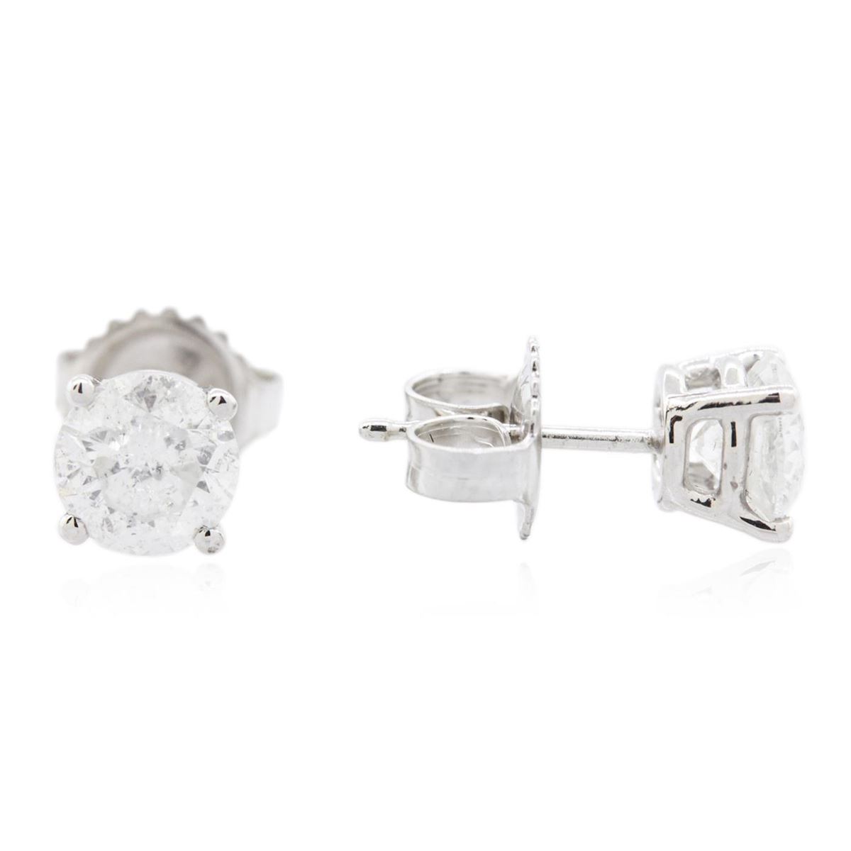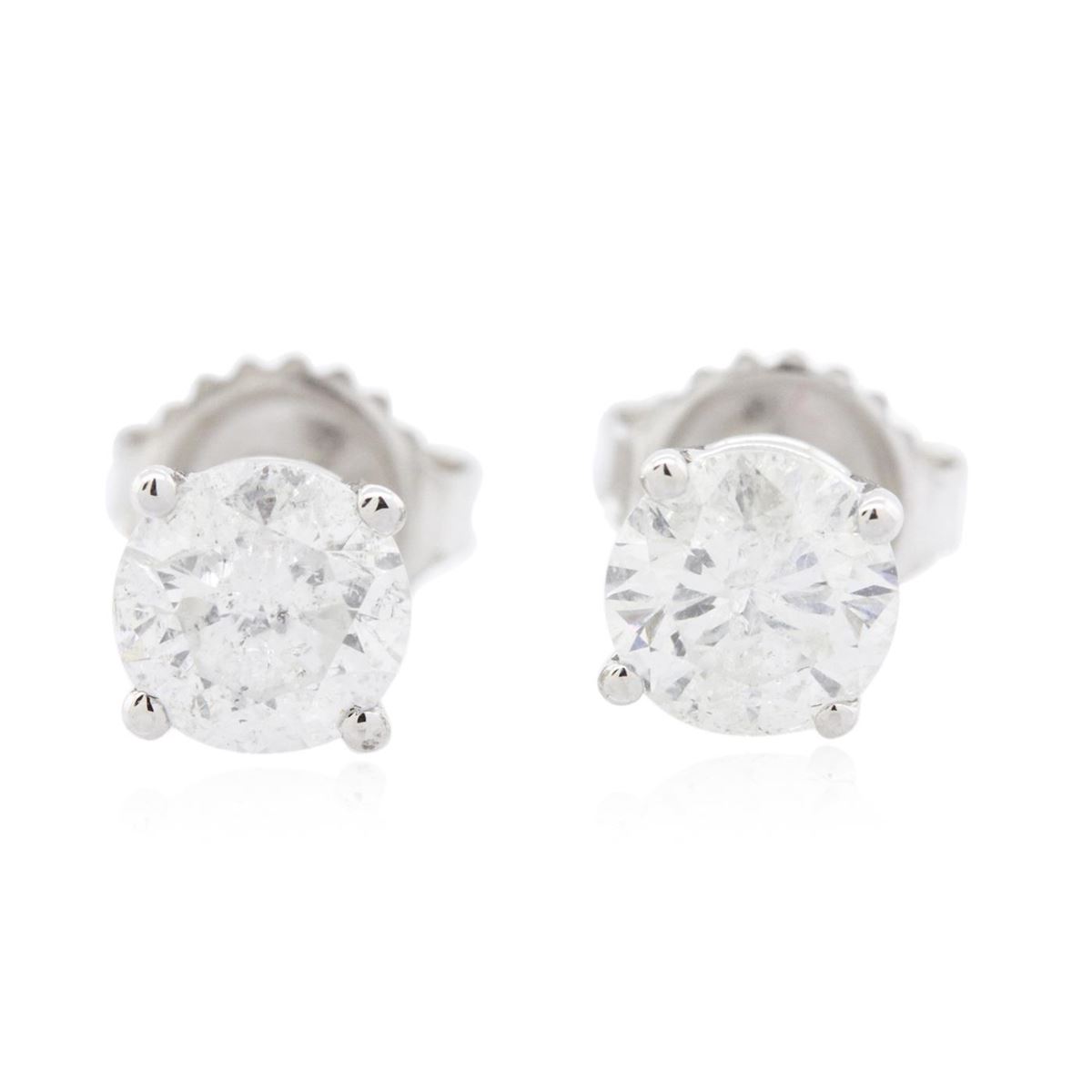One pair electronically tested 14KT white gold ladies cast stud earrings with friction posts with a bright polish finish. Identified with markings of "14K". Condition is new. Containing: One prong set round brilliant cut diamond, measuring 5.72 - 5.71 x 3.42mm (depth est.) approximate weight of 0.68ct. Clarity: I-3. Color: I, Cut is Good. One prong set round brilliant cut diamond, measuring 5.81 - 5.80 x 3.51mm (depth est.) approximate weight of 0.72ct. Clarity: I-3. Color: I, Cut is Good. All diamonds are graded in the mounting, unless otherwise stated total weight of Diamonds 1.40ct. Total Weight of Earrings 1.60 grams. GGL Appraised at $4,475.00.