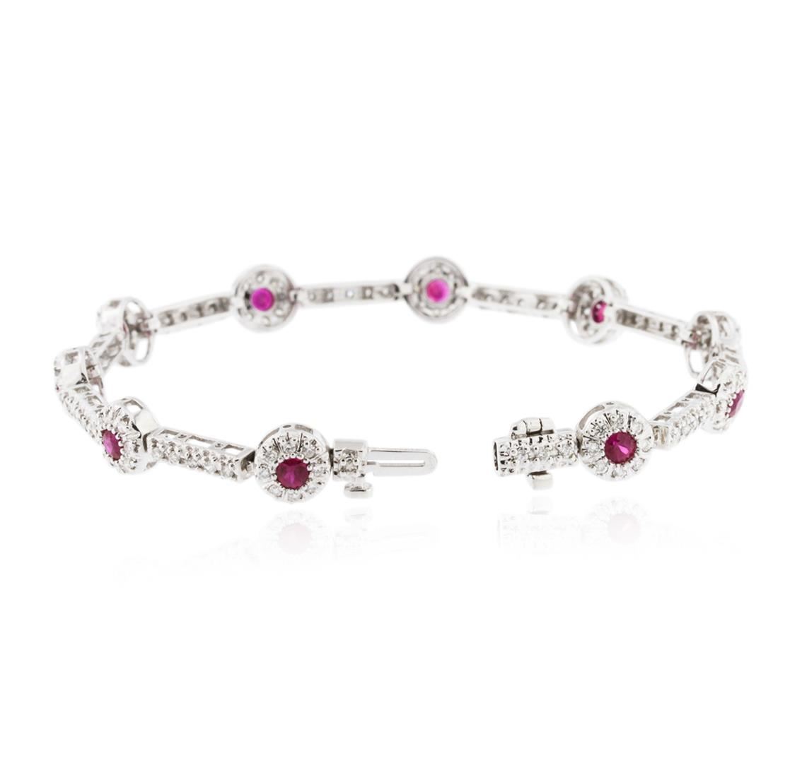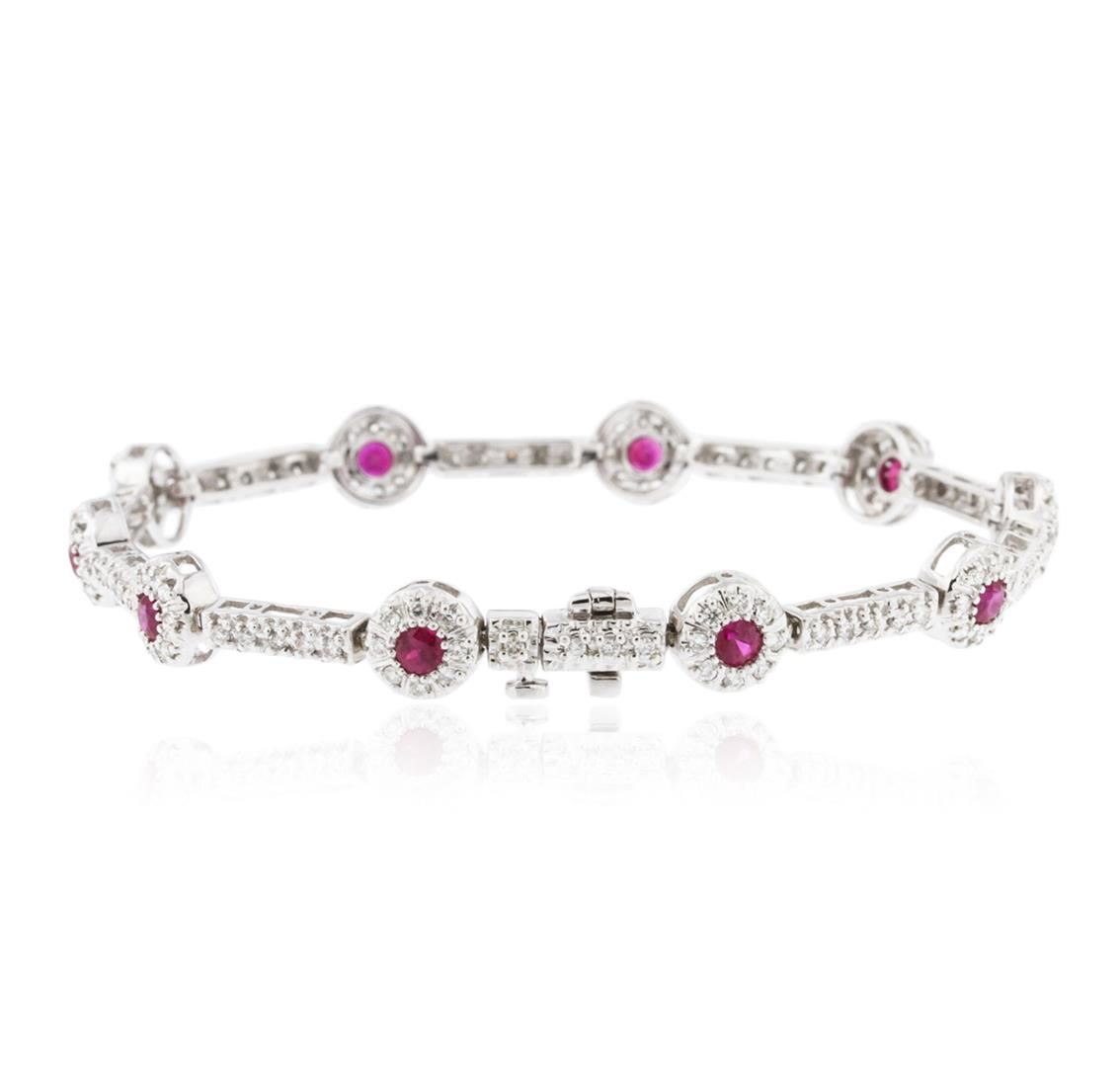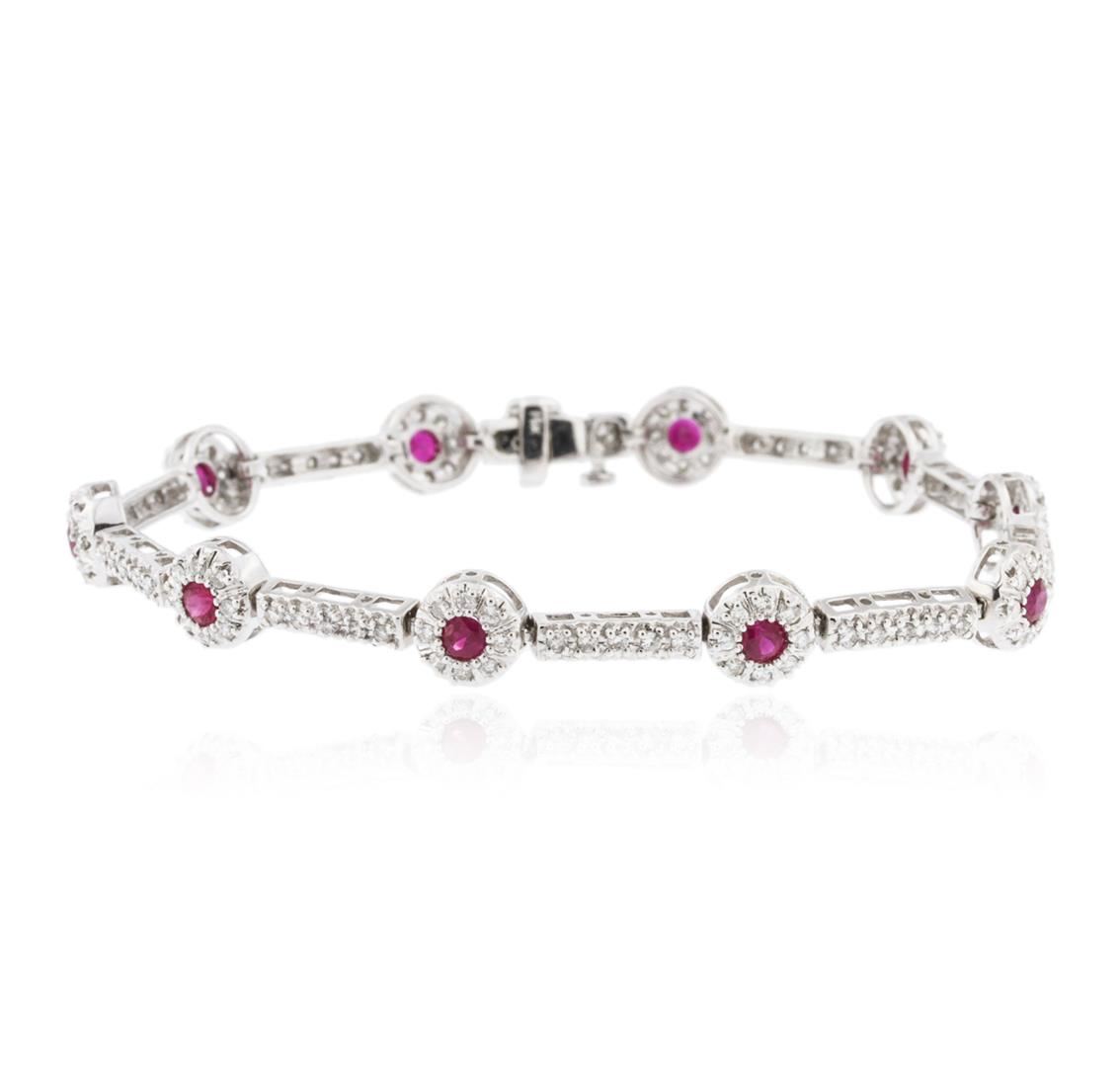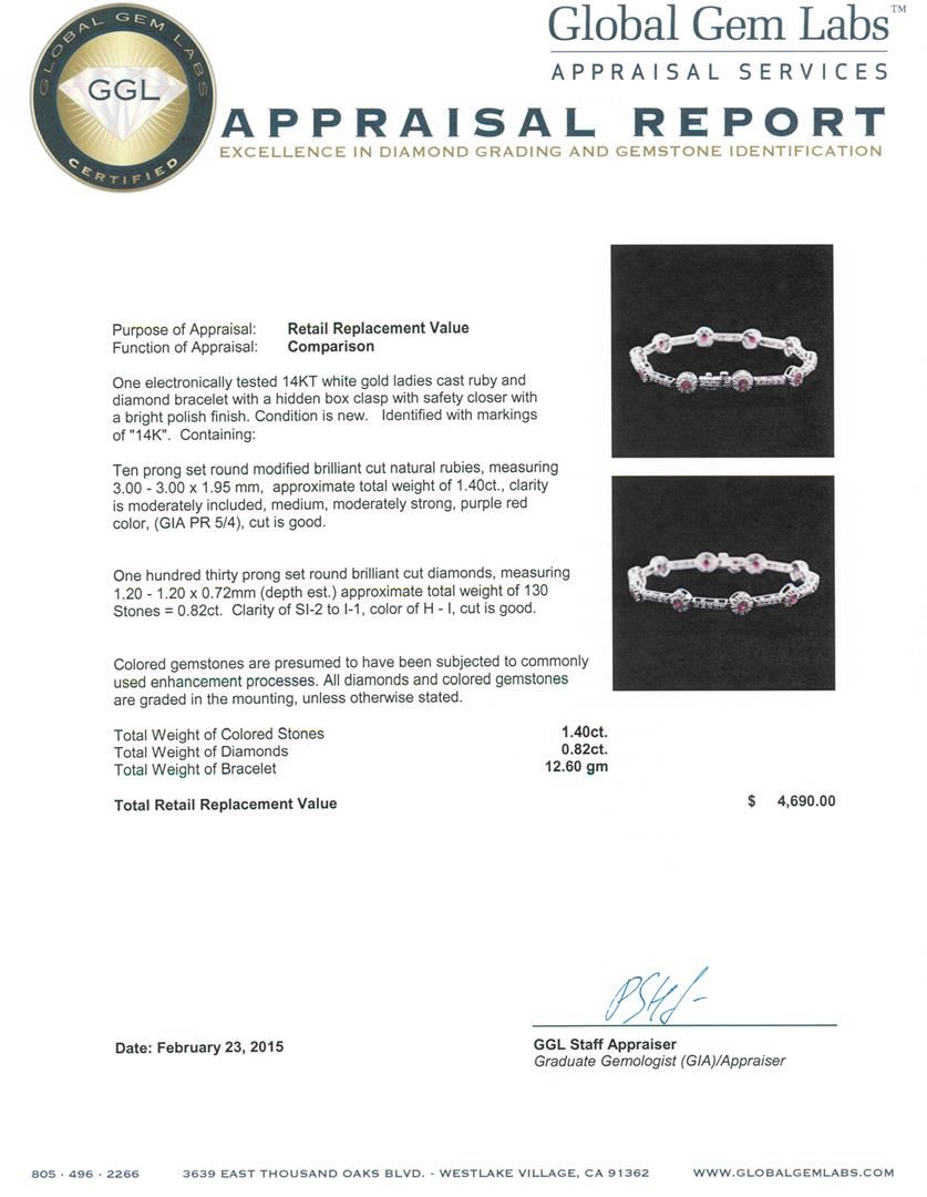 One electronically tested 14KT white gold ladies cast ruby and diamond bracelet with a hidden box clasp with safety closer with a bright polish finish. Identified with markings of "14K". Condition is new. Containing: Ten prong set round modified brilliant cut natural rubies, measuring 3.00 - 3.00 x 1.95 mm, approximate total weight of 1.40ct., clarity is moderately included, medium, moderately strong, purple red color, (GIA PR 5/4), cut is good. One Hundred Thirty prong set round brilliant cut diamonds, measuring 1.20 - 1.20 x 0.72mm (depth est.) approximate total weight of 130 Stones = 0.82ct. Clarity: SI-2 to I-1. Color: H - I, Cut is Good. Colored gemstones are presumed to have been subjected to commonly used enhancement processes. All diamonds and colored gemstones are graded in the mounting, unless otherwise stated. Total Weight of Colored Stones 1.40ct. Total Weight of Diamonds 0.82ct. Total Weight of Bracelet 12.60 grams. GGL Appraised at $4,690.00.