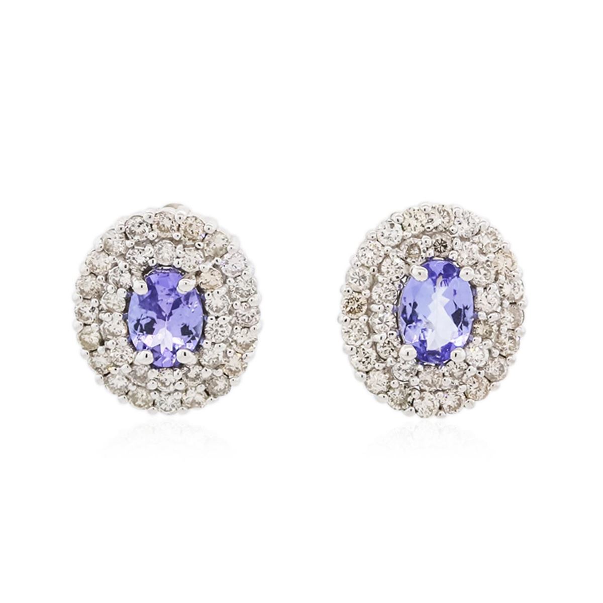 One pair electronically tested 14KT white gold Ladies combination cast & assembled stud earrings with friction posts with a bright polish finish. Condition is new. Identified with markings of "14K". Containing: Two prong set oval modified brilliant cut natural tanzanites, measuring 6.70 x 4.90 x 2.80mm, approximate. Total Weight of 1.40ct., clarity is eye clean, medium light, very slightly grayish, violet color, (GIA V 4/3), cut is good. Colored gemstones are presumed to have been subjected to commonly used color/clarity enhancement processes. Seventy-Two prong set round brilliant cut diamonds, measuring 1.50 - 1.50 x 0.90mm (depth est.) approximate. Total Weight of 72 Stones = 1.41ct. Clarity: I-1 to I-2. Color: K - L, Cut is Good. Total Weight of Colored Stones 1.40ct. Total Weight of Diamonds 1.41ct. Total Weight of Earrings 4.80 grams. GGL Appraised at $5,545.00.