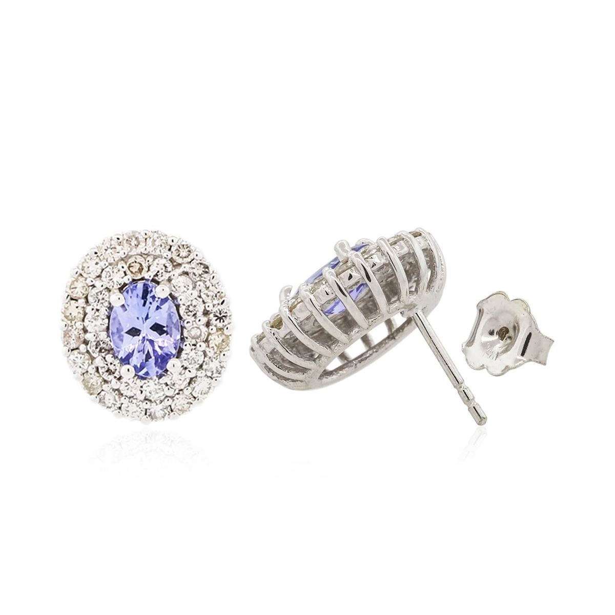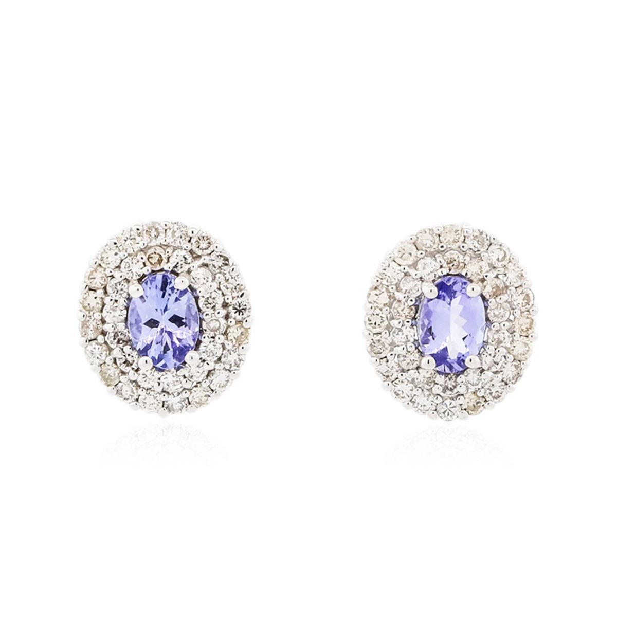 One pair electronically tested 14KT white gold Ladies combination cast & assembled stud earrings with friction posts with a bright polish finish. Condition is new. Identified with markings of "14K". Containing: Two prong set oval modified brilliant cut natural tanzanites, measuring 6.90 x 4.75 x 2.90mm, approximate. Total Weight of 1.40ct., clarity is eye clean, medium light, very slightly grayish, violet color, (GIA V 4/3), cut is good. Colored gemstones are presumed to have been subjected to commonly used color/clarity enhancement processes. Seventy-Two prong set round brilliant cut diamonds, measuring 1.50 - 1.50 x 0.90mm (depth est.) approximate. Total Weight of 72 Stones = 1.41ct. Clarity: I-1 to I-2. Color: J - L, Cut is Good. Total Weight of Colored Stones 1.40ct. Total Weight of Diamonds 1.41ct. Total Weight of Earrings 5.10 grams. GGL Appraised at $5,655.00.