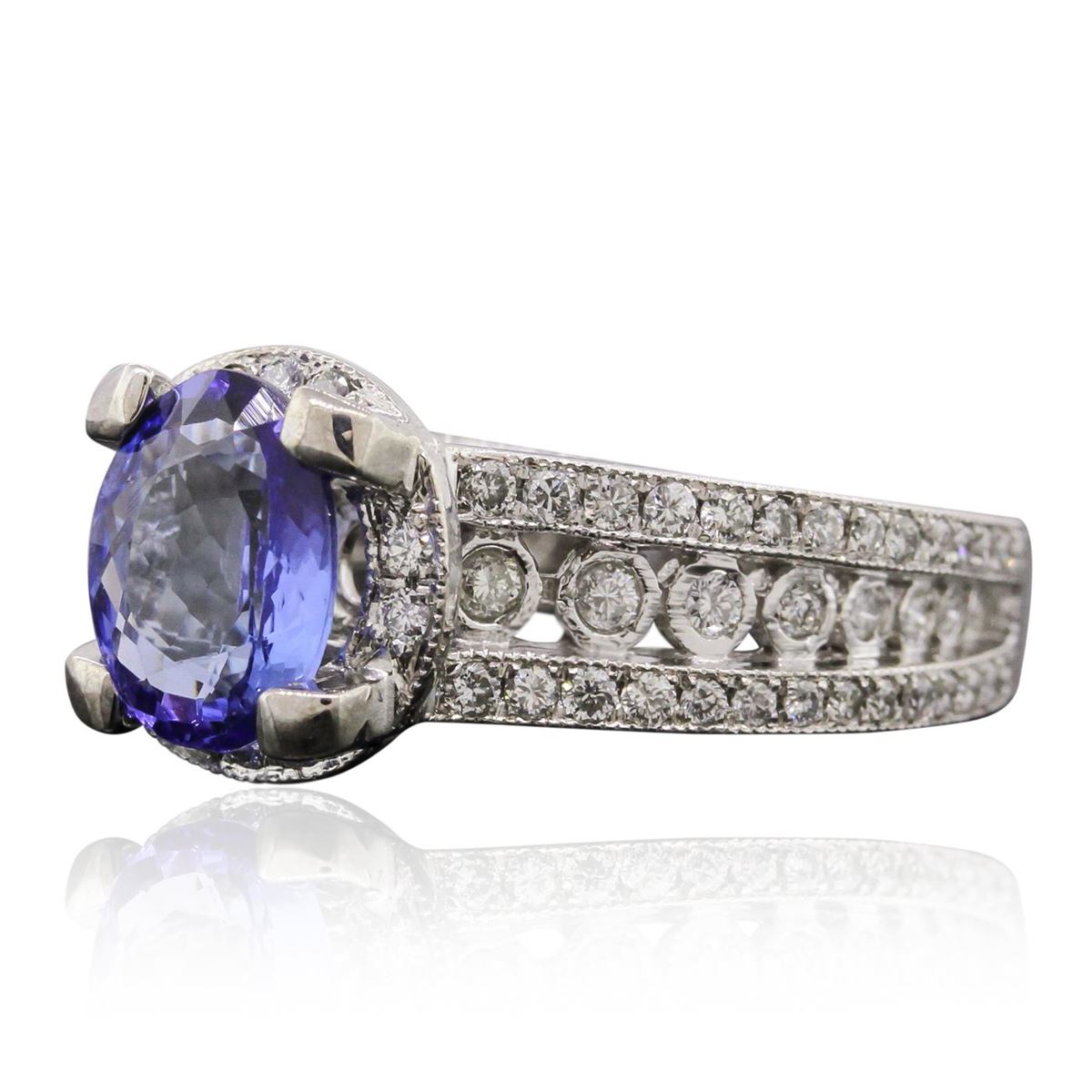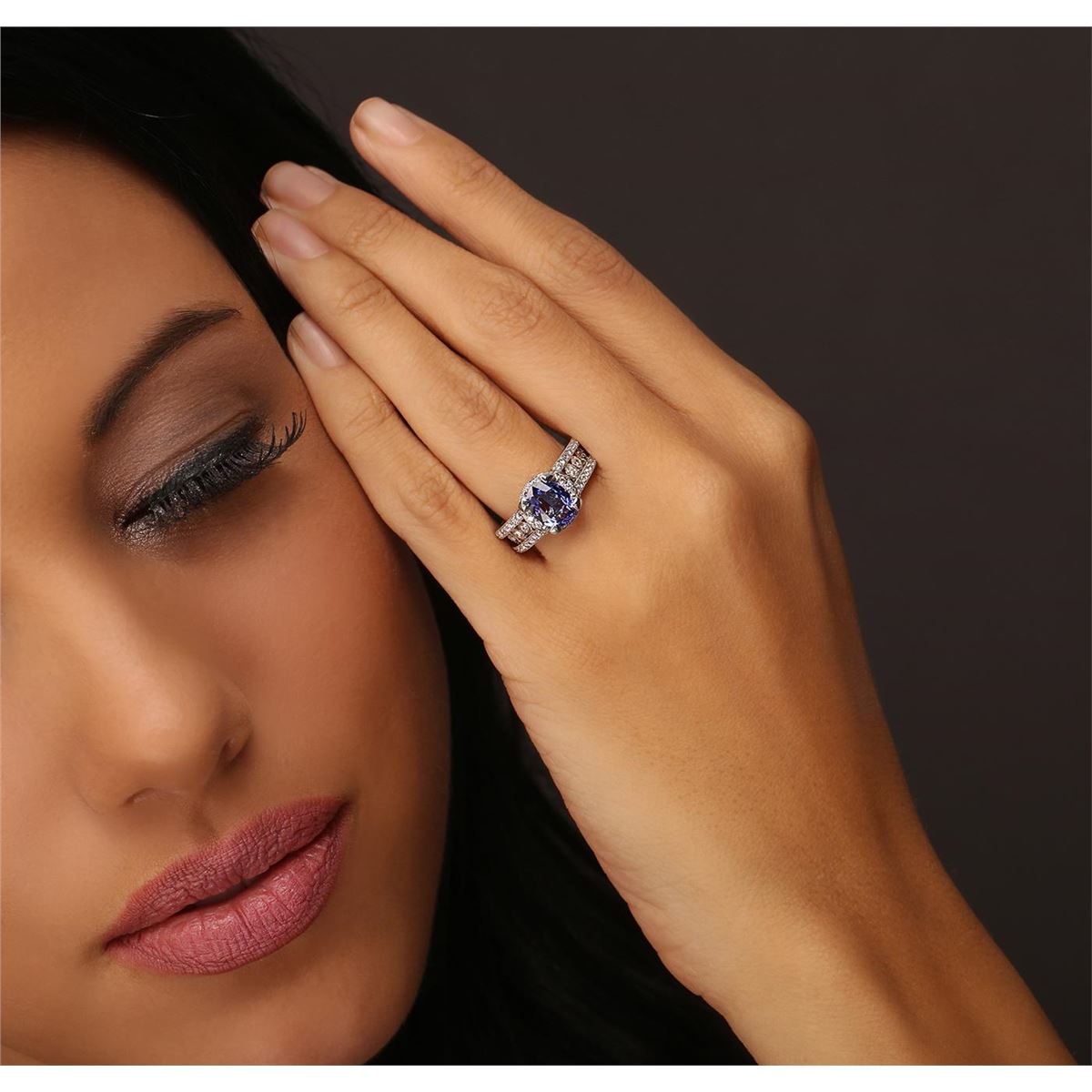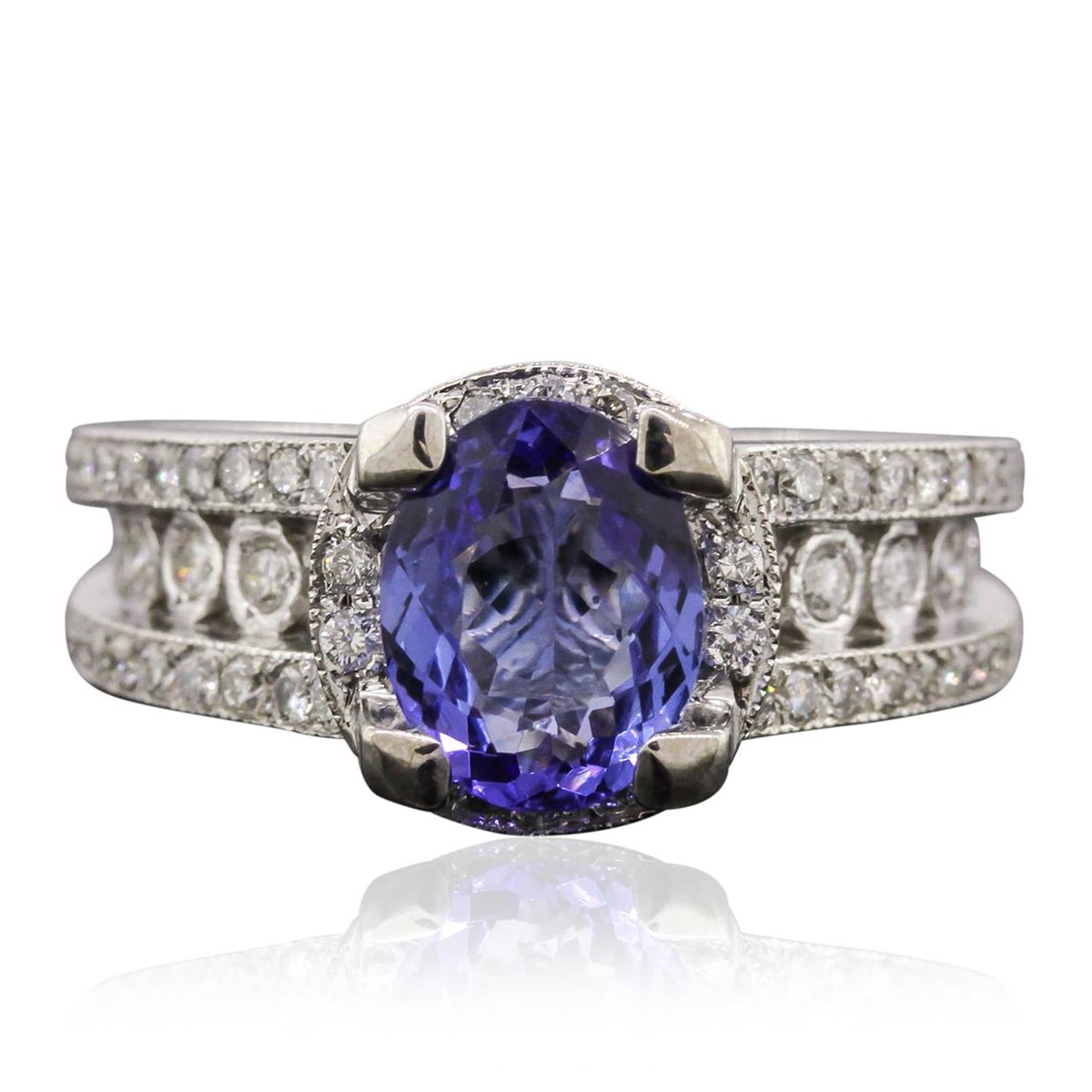 One electronically tested 14KT white gold Ladies combination cast & assembled ring with a bright polish finish. Condition is new. Identified with markings of "14K". Containing: One prong set oval modified brilliant cut natural tanzanite, measuring 8.80 x 6.90 x 3.40mm, approximate weight of 1.40ct., clarity is eye clean, type I, medium light, very slightly grayish, violet color, (GIA V 4/3), cut is good. Colored gemstones are presumed to have been subjected to commonly used color/clarity enhancement processes. Ninety-Two prong set round brilliant cut diamonds, measuring 1.50 - 1.30 x 0.84mm (depth est.) approximate total weight of 92 Stones = 0.50ct. Clarity of I-1 to I-2, Color of H - I, Cut is Good. Total Weight of Colored Stones 1.40ct. Total Weight of Diamonds 0.50ct. Total Weight of Ring 7.70 grams. GGL Appraised at $6,135.00.