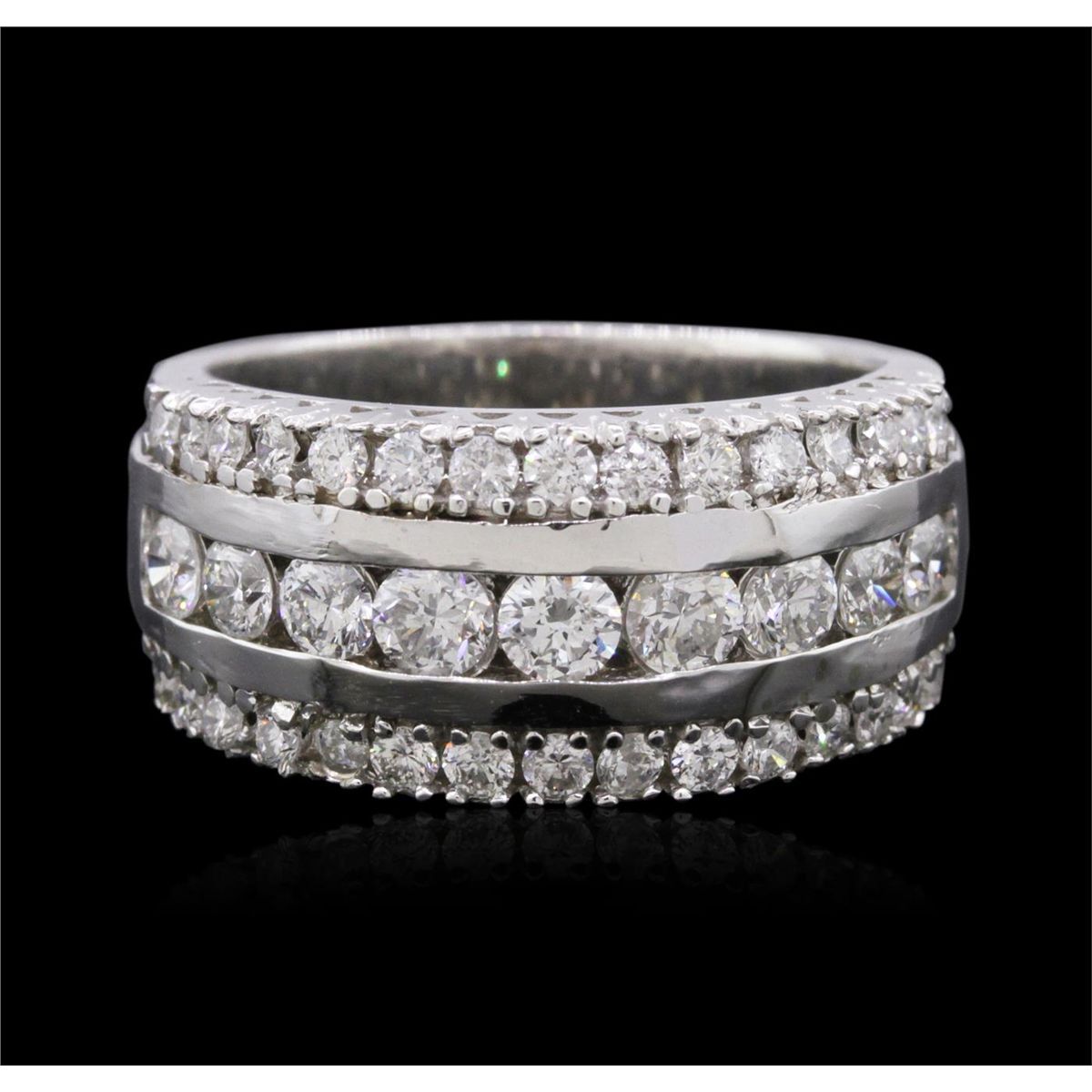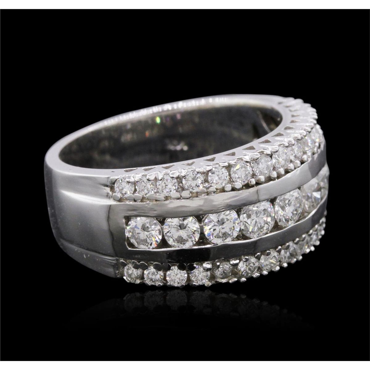 One electronically tested 14KT white gold ladies cast diamond ring with a bright polish finish. The ring features three diamond ribbons separated by white gold ribbons, terminating in a five and one-half millimeter wide band. Identified with markings of 14K. Condition is new, good workmanship. Containing: Nine channel set round brilliant cut diamonds, measuring 3.10 - 2.70 x 1.74mm (depth est.) approximate total weight of 9 Stones = 0.90ct. Graded in the setting. Clarity: SI-1 to I-1. Color: G - I Thirty prong set round brilliant cut diamonds, measuring 1.60 - 1.50 x 0.93mm (depth est.) approximate total weight of 30 Stones = 0.50ct. Graded in the setting. Clarity: SI-2 to I-2. Color: G - I. Total Weight of Diamonds 1.40ct. Total Weight of Ring 8.80 grams. AIG Appraised at $5,530.00.