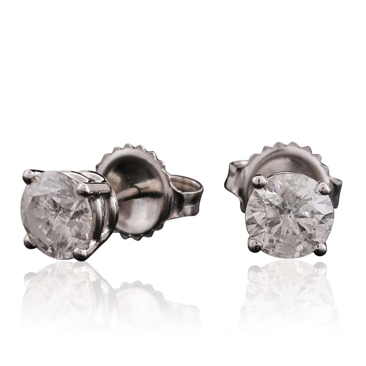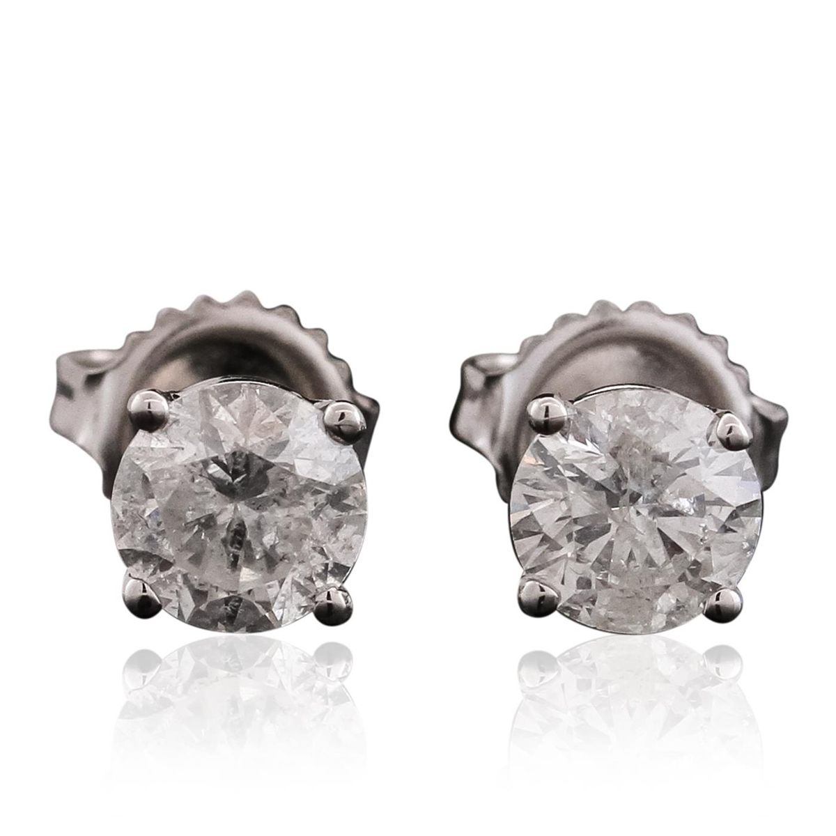 One pair electronically tested 14KT white gold ladies cast stud earrings with friction posts with a bright polish finish. Identified with markings of "14K". Condition is new. Containing: One prong set round brilliant cut diamond, measuring 5.72 - 5.71 x 3.42mm (depth est.) approximate weight of 0.68ct. Clarity: I-3. Color: I, Cut is Good. One prong set round brilliant cut diamond, measuring 5.81 - 5.80 x 3.51mm (depth est.) approximate weight of 0.72ct. Clarity: I-3. Color: I, Cut is Good. All diamonds are graded in the mounting, unless otherwise stated total weight of Diamonds 1.40ct. Total Weight of Earrings 1.60 grams. GGL Appraised at $4,475.00.