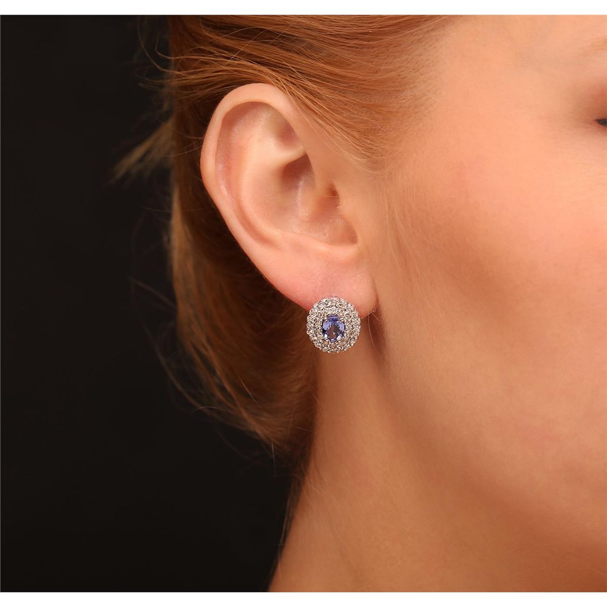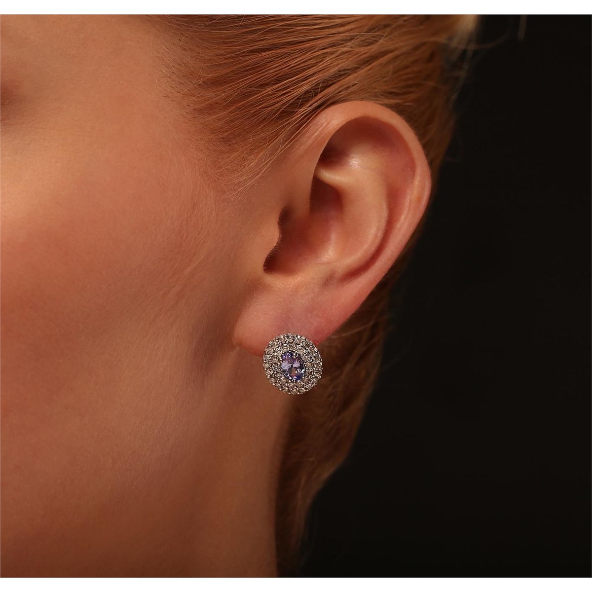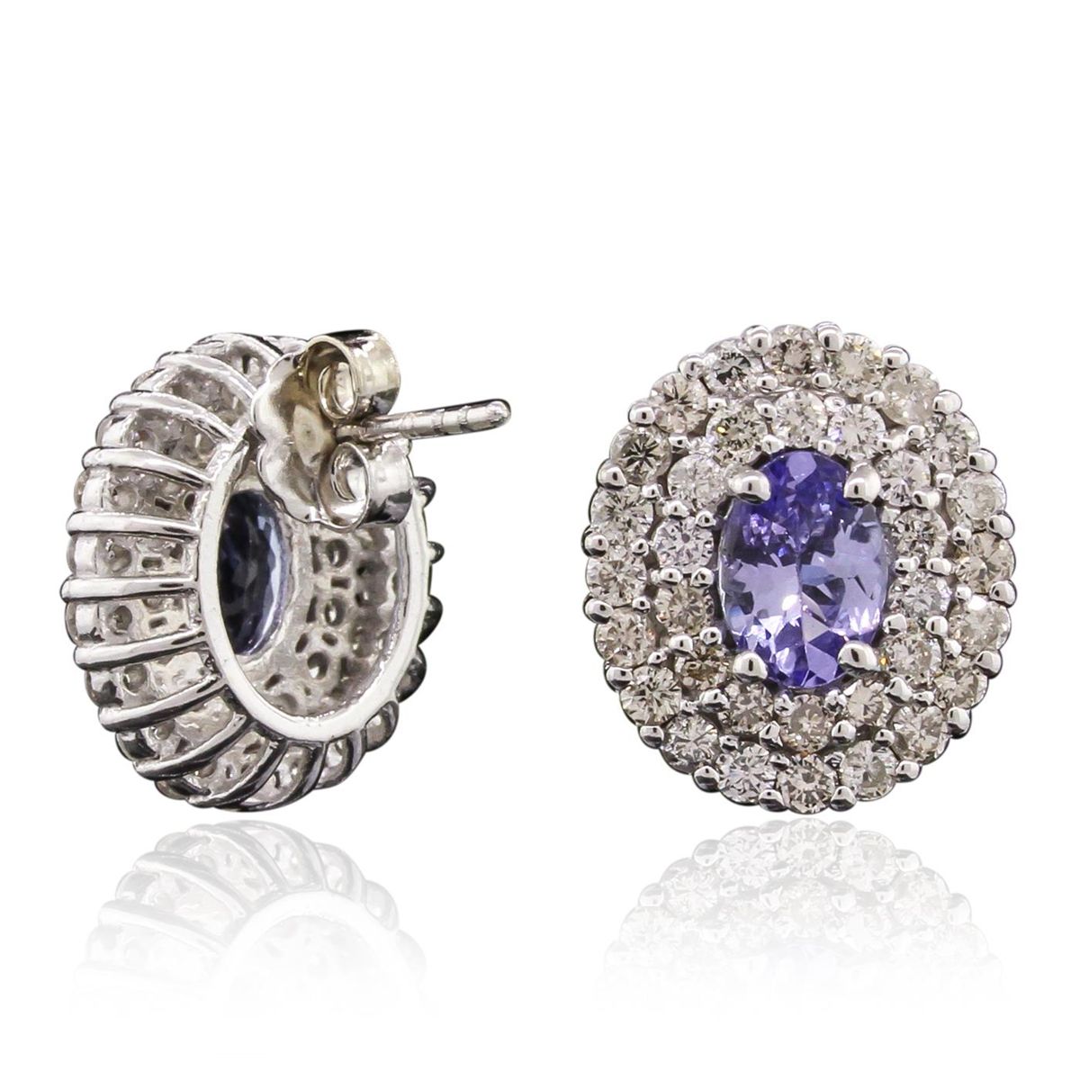 One pair electronically tested 14KT white gold Ladies combination cast & assembled stud earrings with friction posts with a bright polish finish. Condition is new. Identified with markings of "14K". Containing: Two prong set oval modified brilliant cut natural tanzanites, measuring 6.95 x 4.81 x 2.80mm, approximate. Total Weight of 1.40ct., clarity is eye clean, medium light, very slightly grayish, violet color, (GIA V 4/3), cut is good. Colored gemstones are presumed to have been subjected to commonly used color/clarity enhancement processes. Seventy-Two prong set round brilliant cut diamonds, measuring 1.50 - 1.50 x 0.90mm (depth est.) approximate. Total Weight of 72 Stones = 1.41ct. Clarity: I-1 to I-2. Color: J - K, Cut is Good. Total Weight of Colored Stones 1.40ct. Total Weight of Diamonds 1.41ct. Total Weight of Earrings 5.20 grams. GGL Appraised at $5,915.00.