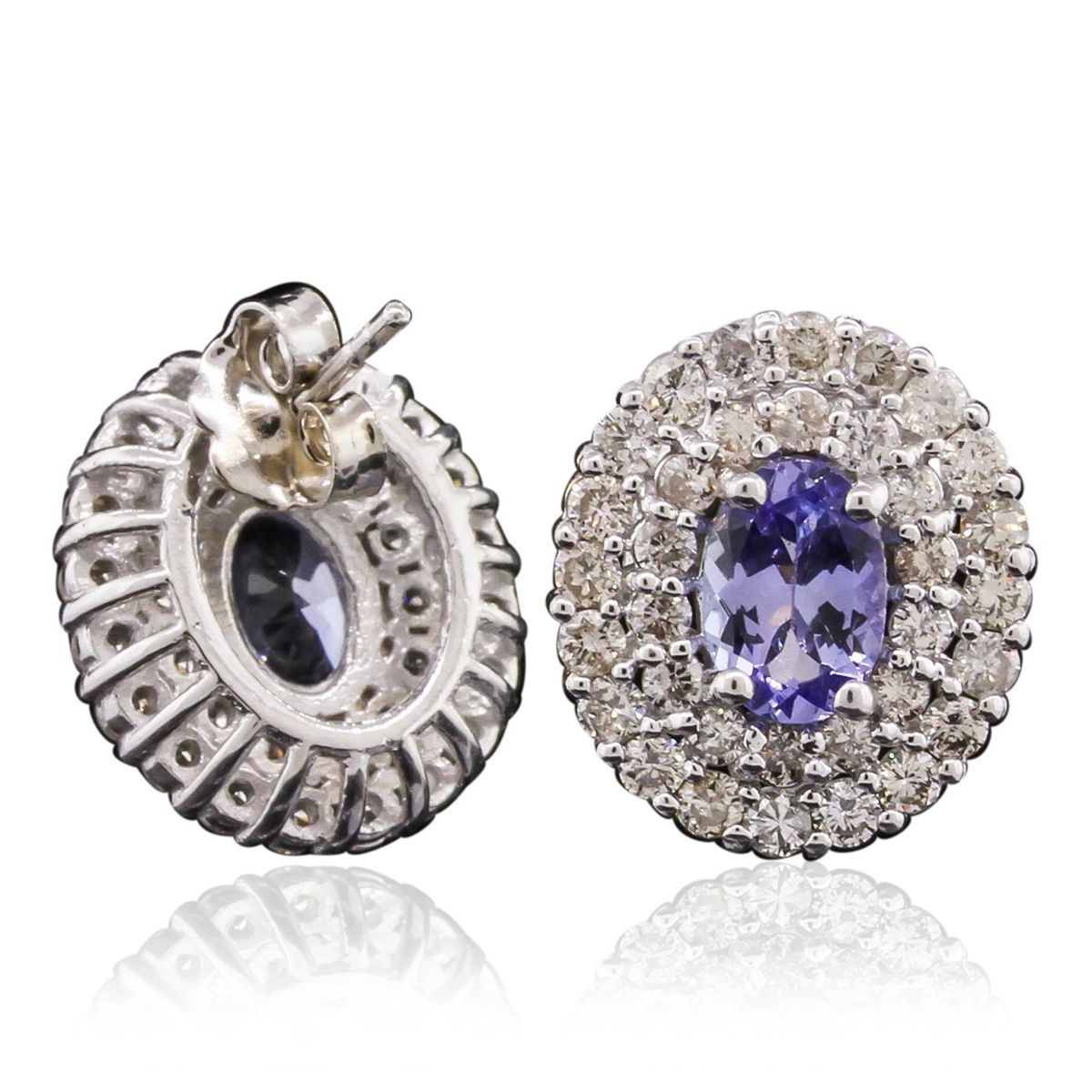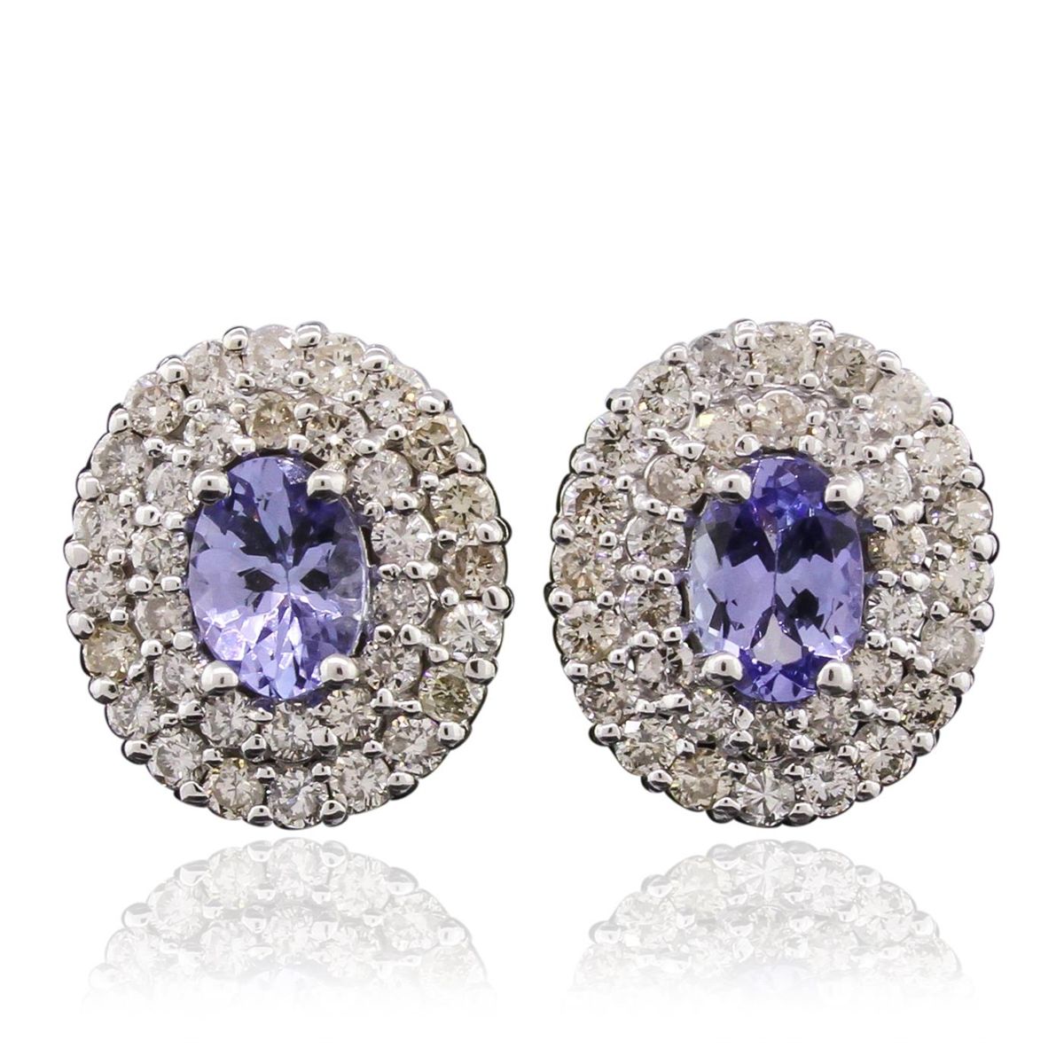 One pair electronically tested 14KT white gold Ladies combination cast & assembled stud earrings with friction posts with a bright polish finish. Condition is new. Identified with markings of "14K". Containing: Two prong set oval modified brilliant cut natural tanzanites, measuring 6.90 x 4.75 x 2.90mm, approximate. Total Weight of 1.40ct., clarity is eye clean, medium light, very slightly grayish, violet color, (GIA V 4/3), cut is good. Colored gemstones are presumed to have been subjected to commonly used color/clarity enhancement processes. Seventy-Two prong set round brilliant cut diamonds, measuring 1.50 - 1.50 x 0.90mm (depth est.) approximate. Total Weight of 72 Stones = 1.41ct. Clarity: I-1 to I-2. Color: J - L, Cut is Good. Total Weight of Colored Stones 1.40ct. Total Weight of Diamonds 1.41ct. Total Weight of Earrings 5.10 grams. GGL Appraised at $5,655.00.
