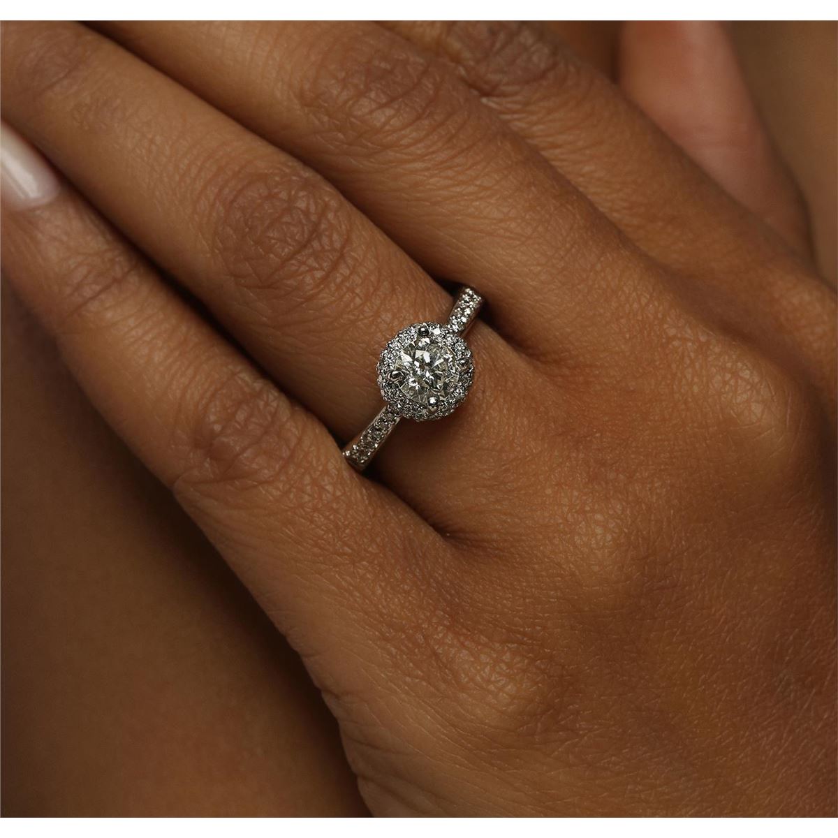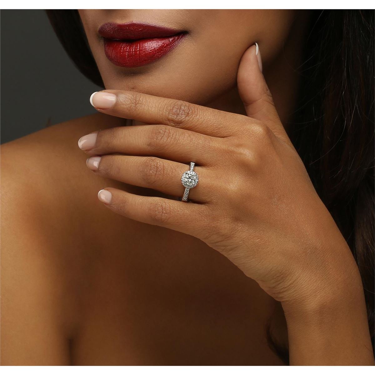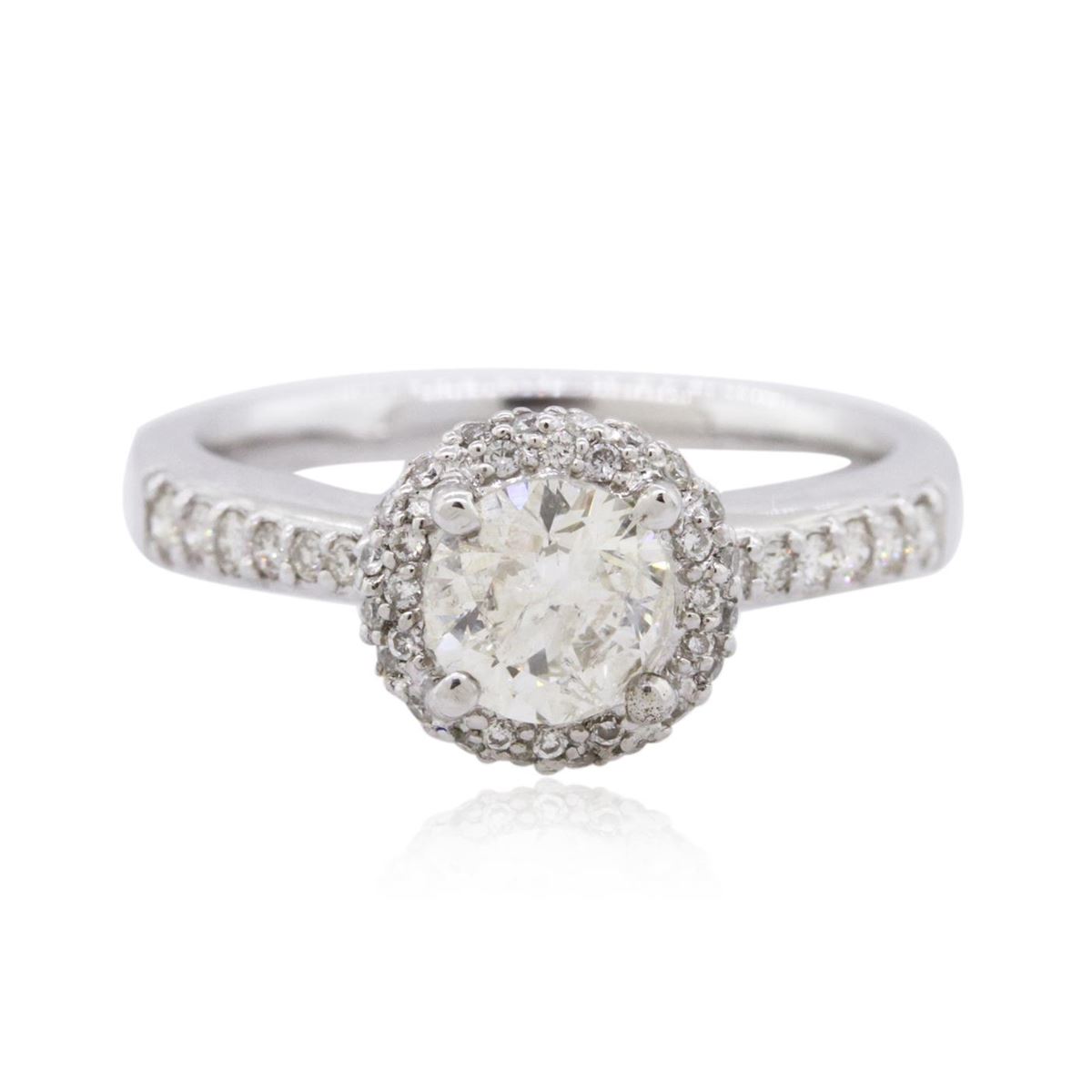 One electronically tested 14KT white gold ladies combination cast & assembled engagement ring with a flat shank with a bright polish finish. Identified with markings of "14K". Condition is new. Containing: One prong set round brilliant cut diamond, measuring 5.86 - 5.80 x 3.90mm (depth est.) approximate weight of 0.81ct. Clarity: I-1. Color: J, Cut is Good. Seventy-Five prong set round brilliant cut diamonds, measuring 1.50 - 1.10 x 0.78mm (depth est.) approximate total weight of 75 Stones = 0.60ct. Clarity: SI-1 to SI-2. Color: I - J, Cut is Good. All diamonds are graded in the mounting, unless otherwise stated. Total Weight of Diamonds 1.41ct. Total Weight of Ring 4.60 grams. GGL Appraised at $8,935.00.
