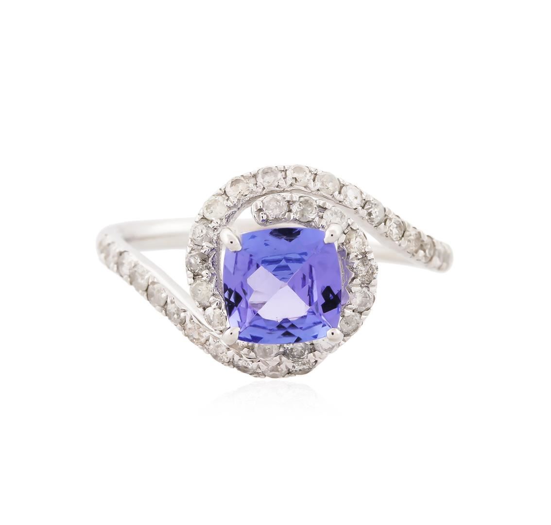 One electronically tested 14KT white gold ladies cast tanzanite and diamond ring with a bright polish finish. Identified with markings of "14K". Condition is new. Containing: One prong set square cushion modified brilliant cut natural tanzanite, measuring 6.50 x 6.50 x 4.23mm, approximate weight of 1.41ct., clarity is eye clean, type I, medium light, very slightly grayish, violet color, (GIA V 4/3), cut is good. Forty prong set round brilliant cut diamonds, measuring 1.30 - 1.30 x 0.78mm (depth est.) approximate total weight of 40 Stones = 0.70ct. Clarity: I-1 to I-2. Color: I - J. All diamonds and colored gemstones are graded in the mounting, unless otherwise stated. Colored gemstones are presumed to have been subjected to commonly used enhancement processes. Total Weight of Colored Stones 1.41ct. Total Weight of Diamonds 0.70ct. Total Weight of Ring 3.20 grams. GGL Appraised at $2,786.00.