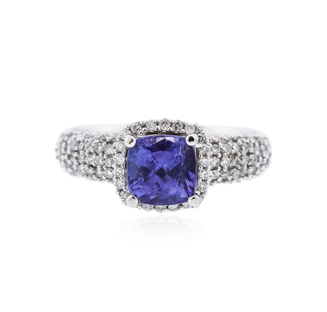 One electronically tested 14KT white gold ladies cast tanzanite and diamond ring with a bright polish finish. Identified with markings of "14K". Condition is new. Containing: One prong set square cushion modified brilliant cut natural tanzanite, measuring 6.50 x 6.50 x 4.23mm, approximate weight of 1.41ct., clarity is eye clean, type I, medium light, very slightly grayish, violet color, (GIA V 4/3), cut is good. One Hundred Fourteen prong set round brilliant cut diamonds, measuring 1.10 - 1.10 x 0.66mm (depth est.) approximate total weight of 114 Stones = 0.55ct. Clarity: SI-2 to I-2. Color: I - J. Colored gemstones are presumed to have been subjected to commonly used enhancement processes. All diamonds and colored gemstones are graded in the mounting, unless otherwise stated. Total Weight of Colored Stones 1.41ct. Total Weight of Diamonds 0.55ct. Total Weight of Ring 5.40 grams. GGL Appraised at $3,980.00.