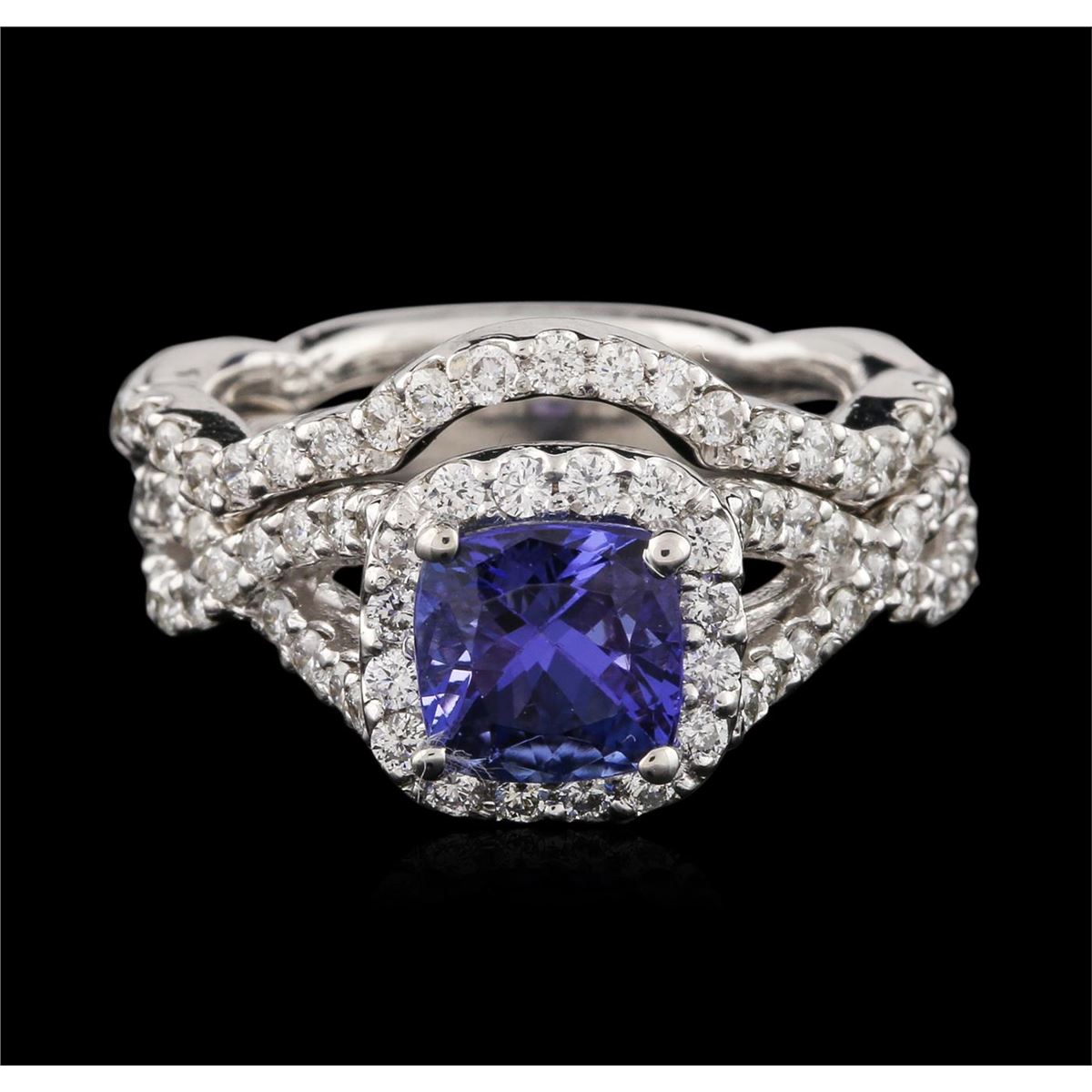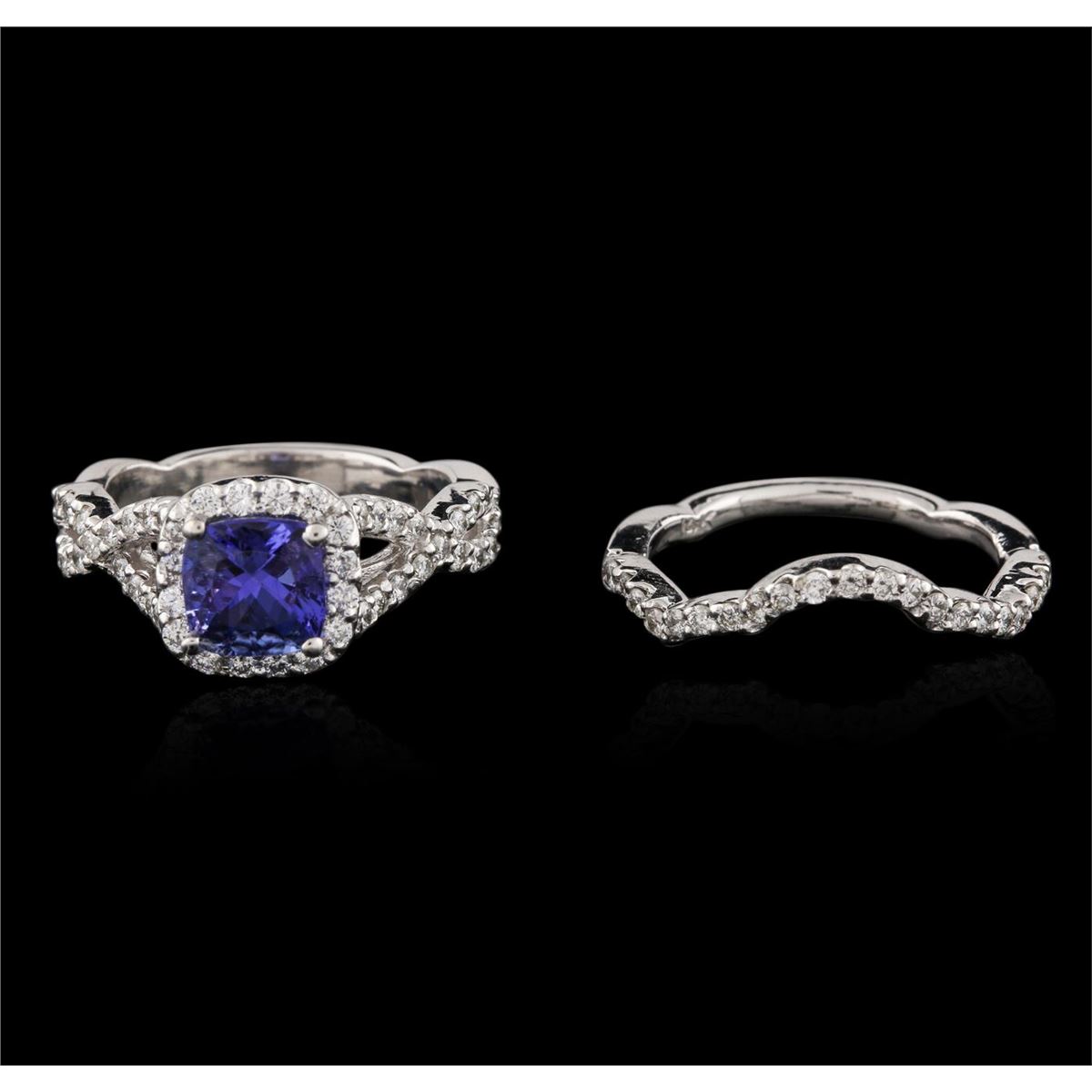 One electronically tested 14KT white gold ladies cast tanzanite and diamond engagement ring & wedding band with a bright polish finish. Identified with markings of "14K". Condition is new. Containing: One prong set square cushion modified brilliant cut natural tanzanite, measuring 6.50 x 6.50 x 4.23mm, approximate weight of 1.41ct., clarity is eye clean, type I, medium, very slightly grayish, violet color, (GIA V 5/3), cut is good. Seventy prong set round brilliant cut diamonds, measuring 1.30 - 1.30 x 0.78mm (depth est.) approximate total weight of 70 Stones = 0.56ct. Clarity: SI-2 to I-2. Color: I - J, Cut is Good. Colored gemstones are presumed to have been subjected to commonly used enhancement processes. All diamonds and colored gemstones are graded in the mounting, unless otherwise stated. Total Weight of Colored Stones 1.41ct. Total Weight of Diamonds 0.56ct. Total Weight of Engagement Ring & Wedding Band 8.40 grams. GGL Appraised at $4,810.00.
