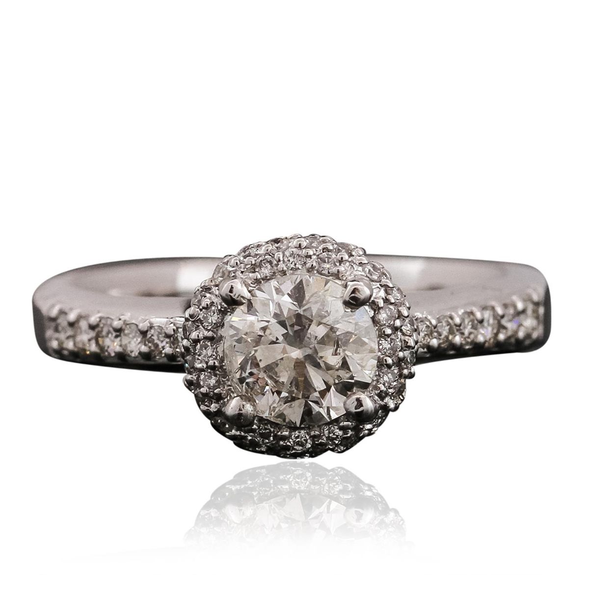 One electronically tested 14KT white gold ladies combination cast & assembled engagement ring with a flat shank with a bright polish finish. Identified with markings of "14K". Condition is new. Containing: One prong set round brilliant cut diamond, measuring 5.86 - 5.80 x 3.90mm (depth est.) approximate weight of 0.81ct. Clarity: I-1. Color: J, Cut is Good. Seventy-Five prong set round brilliant cut diamonds, measuring 1.50 - 1.10 x 0.78mm (depth est.) approximate total weight of 75 Stones = 0.60ct. Clarity: SI-1 to SI-2. Color: I - J, Cut is Good. All diamonds are graded in the mounting, unless otherwise stated. Total Weight of Diamonds 1.41ct. Total Weight of Ring 4.60 grams. GGL Appraised at $8,935.00.
