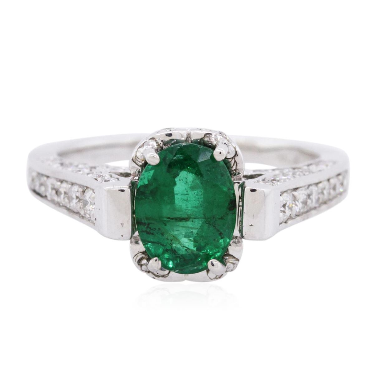 One electronically tested 14KT white gold ladies combination cast & assembled emerald and diamond ring with a cathedral shank with a bright polish finish. Identified with markings of "14K". Condition is new. Containing: One prong set oval modified step cut natural emerald, measuring 8.12 x 6.26 x 4.90mm, approximate weight of 1.42ct., clarity is moderately included, type III, medium, moderately strong, green color, (GIA G 5/4), cut is good. Seventy prong set round brilliant cut diamonds, measuring 1.80 - 1.30 x 0.93mm (depth est.) approximate total weight of 70 Stones = 0.95ct. Clarity: SI-2 to I-1. Color: I - J, Cut is Good. All diamonds and colored gemstones are graded in the mounting, unless otherwise stated. Colored gemstones are presumed to have been subjected to commonly used enhancement processes. Total Weight of Colored Stones 1.42ct. Total Weight of Diamonds 0.95ct. Total Weight of Ring 5.00 grams. GGL Appraised at $5,100.00.