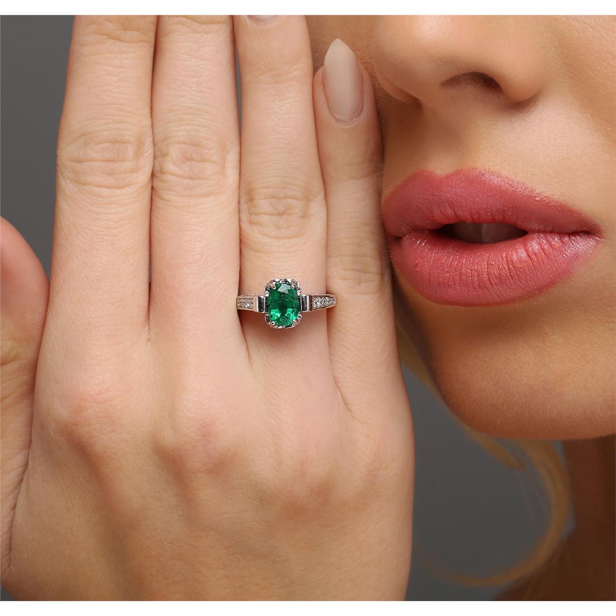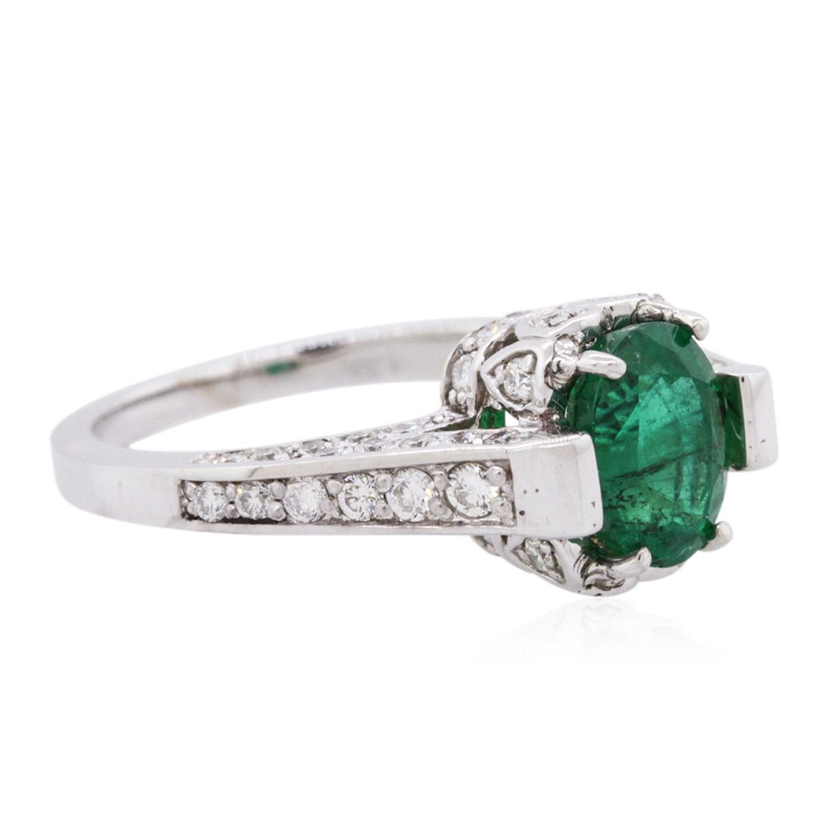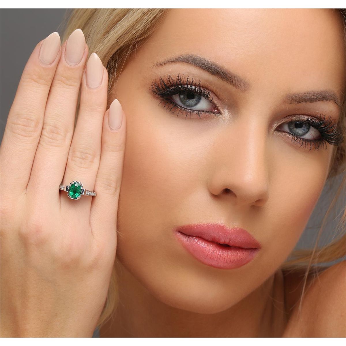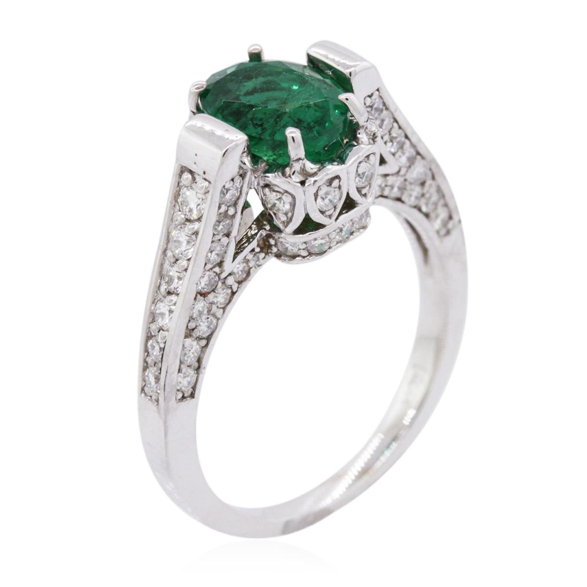 One electronically tested 14KT white gold ladies combination cast & assembled emerald and diamond ring with a cathedral shank with a bright polish finish. Identified with markings of "14K". Condition is new. Containing: One prong set oval modified step cut natural emerald, measuring 8.12 x 6.26 x 4.90mm, approximate weight of 1.42ct., clarity is moderately included, type III, medium, moderately strong, green color, (GIA G 5/4), cut is good. Seventy prong set round brilliant cut diamonds, measuring 1.80 - 1.30 x 0.93mm (depth est.) approximate total weight of 70 Stones = 0.95ct. Clarity: SI-2 to I-1. Color: I - J, Cut is Good. All diamonds and colored gemstones are graded in the mounting, unless otherwise stated. Colored gemstones are presumed to have been subjected to commonly used enhancement processes. Total Weight of Colored Stones 1.42ct. Total Weight of Diamonds 0.95ct. Total Weight of Ring 5.00 grams. GGL Appraised at $5,100.00.