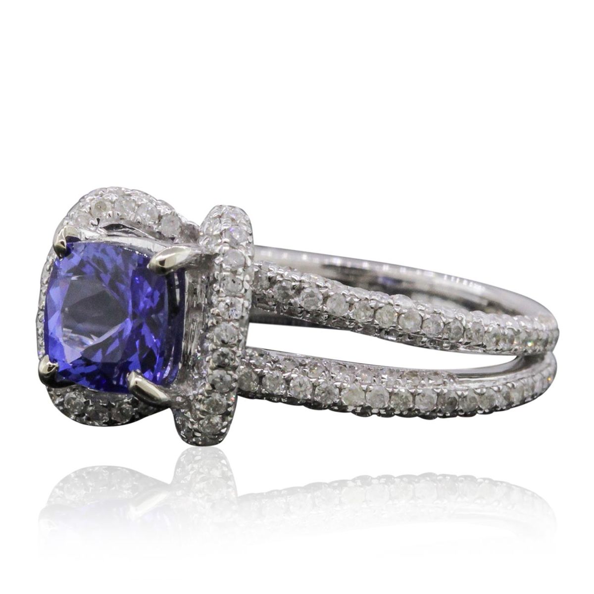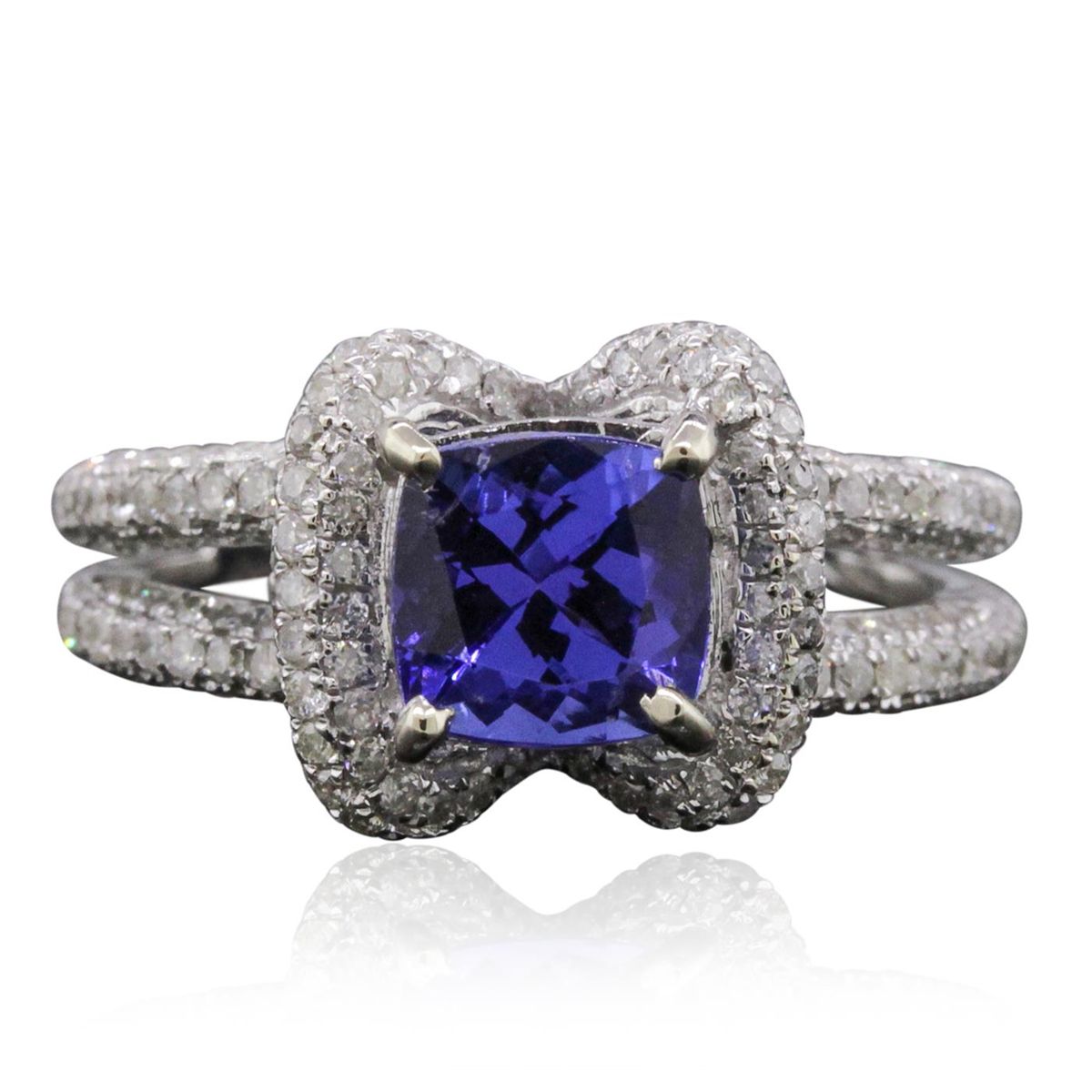 One electronically tested 14KT white gold ladies combination cast & assembled tanzanite and diamond ring with a split shank with a bright polish finish. Identified with markings of "14K". Condition is new. Containing: One prong set square cushion modified brilliant cut natural tanzanite, measuring 6.53 x 6.51 x 4.24mm, approximate weight of 1.42ct., clarity is eye clean, type I, medium, moderately strong, bluish violet color, (GIA bV 5/4), cut is good. Three Hundred Two prong set round brilliant cut diamonds, measuring 1.10 - 1.10 x 0.66mm (depth est.) approximate total weight of 302 Stones = 1.45ct. Clarity: I-1 to I-2. Color: I - J, Cut is Good. Colored gemstones are presumed to have been subjected to commonly used enhancement processes. All diamonds and colored gemstones are graded in the mounting, unless otherwise stated. Total Weight of Colored Stones 1.42ct. Total Weight of Diamonds 1.45ct. Total Weight of Ring 5.80 grams. GGL Appraised at $6,190.00.