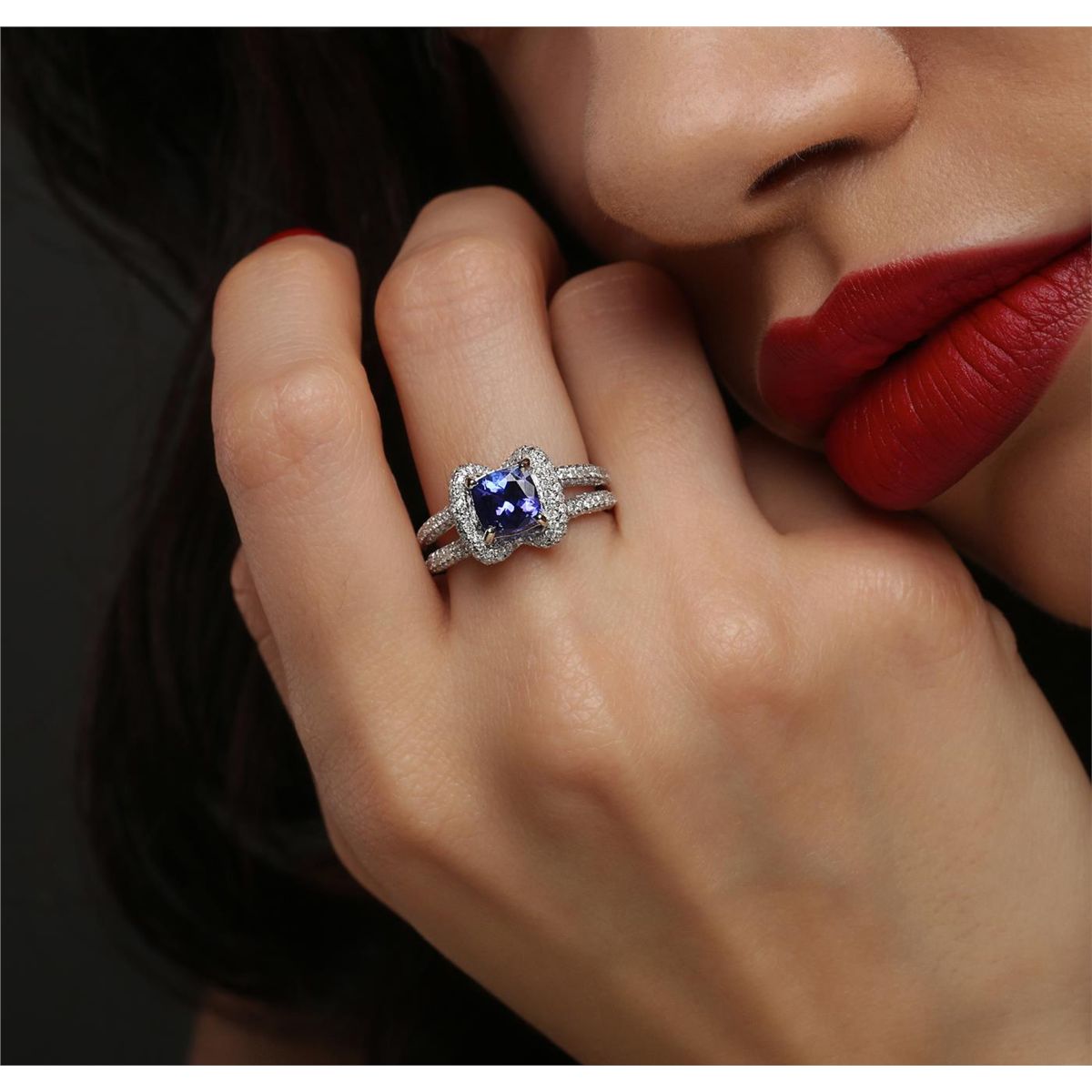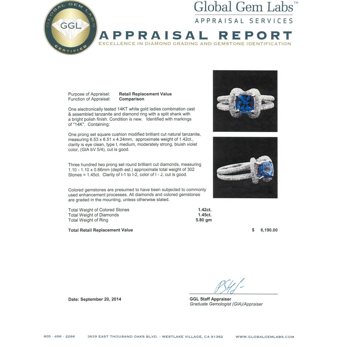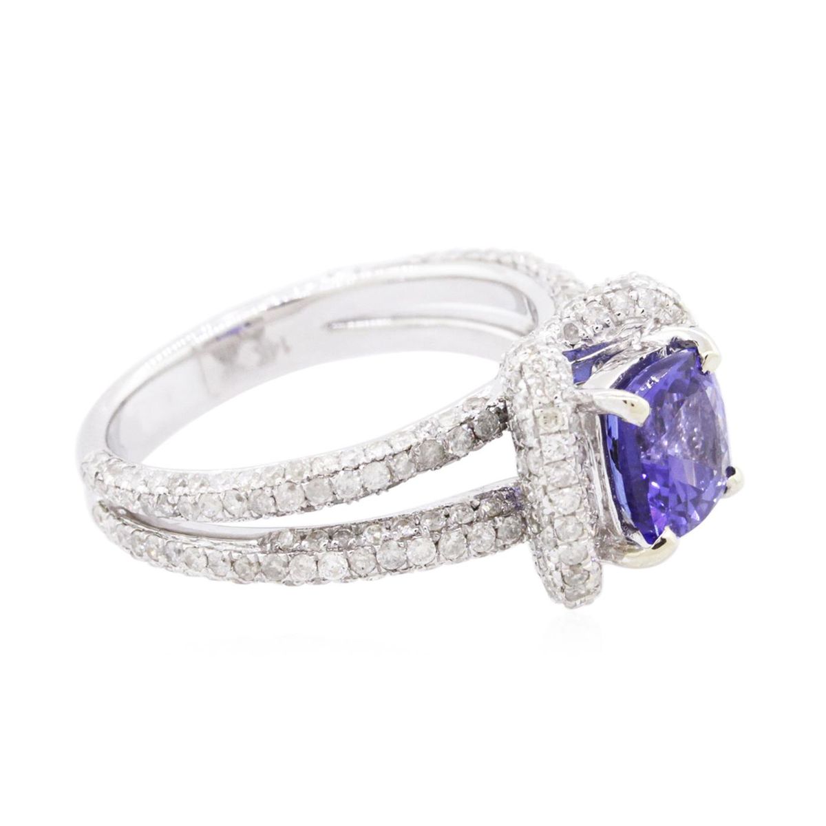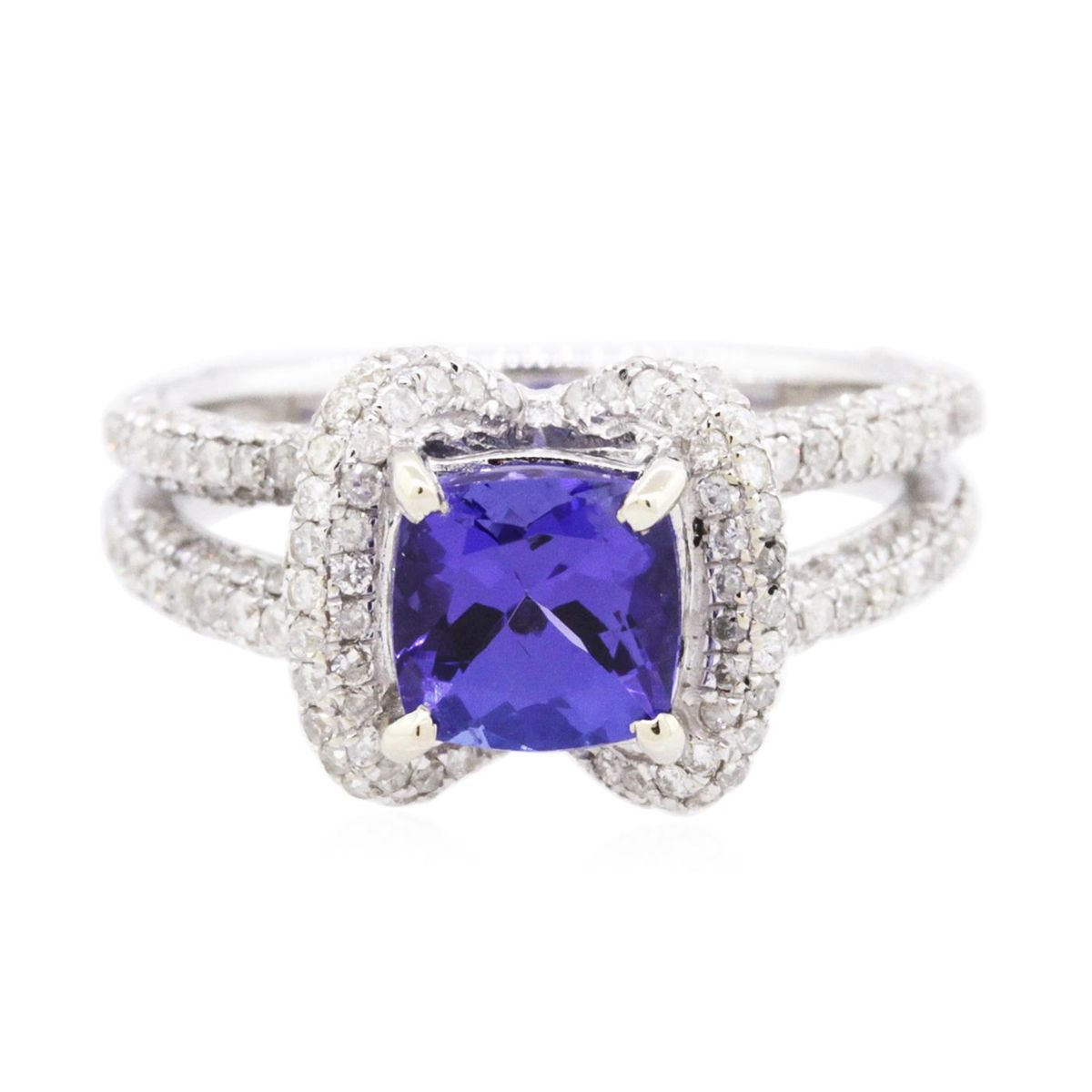 One electronically tested 14KT white gold ladies combination cast & assembled tanzanite and diamond ring with a split shank with a bright polish finish. Identified with markings of "14K". Condition is new. Containing: One prong set square cushion modified brilliant cut natural tanzanite, measuring 6.53 x 6.51 x 4.24mm, approximate weight of 1.42ct., clarity is eye clean, type I, medium, moderately strong, bluish violet color, (GIA bV 5/4), cut is good. Three Hundred Two prong set round brilliant cut diamonds, measuring 1.10 - 1.10 x 0.66mm (depth est.) approximate total weight of 302 Stones = 1.45ct. Clarity: I-1 to I-2. Color: I - J, Cut is Good. Colored gemstones are presumed to have been subjected to commonly used enhancement processes. All diamonds and colored gemstones are graded in the mounting, unless otherwise stated. Total Weight of Colored Stones 1.42ct. Total Weight of Diamonds 1.45ct. Total Weight of Ring 5.80 grams. GGL Appraised at $6,190.00.