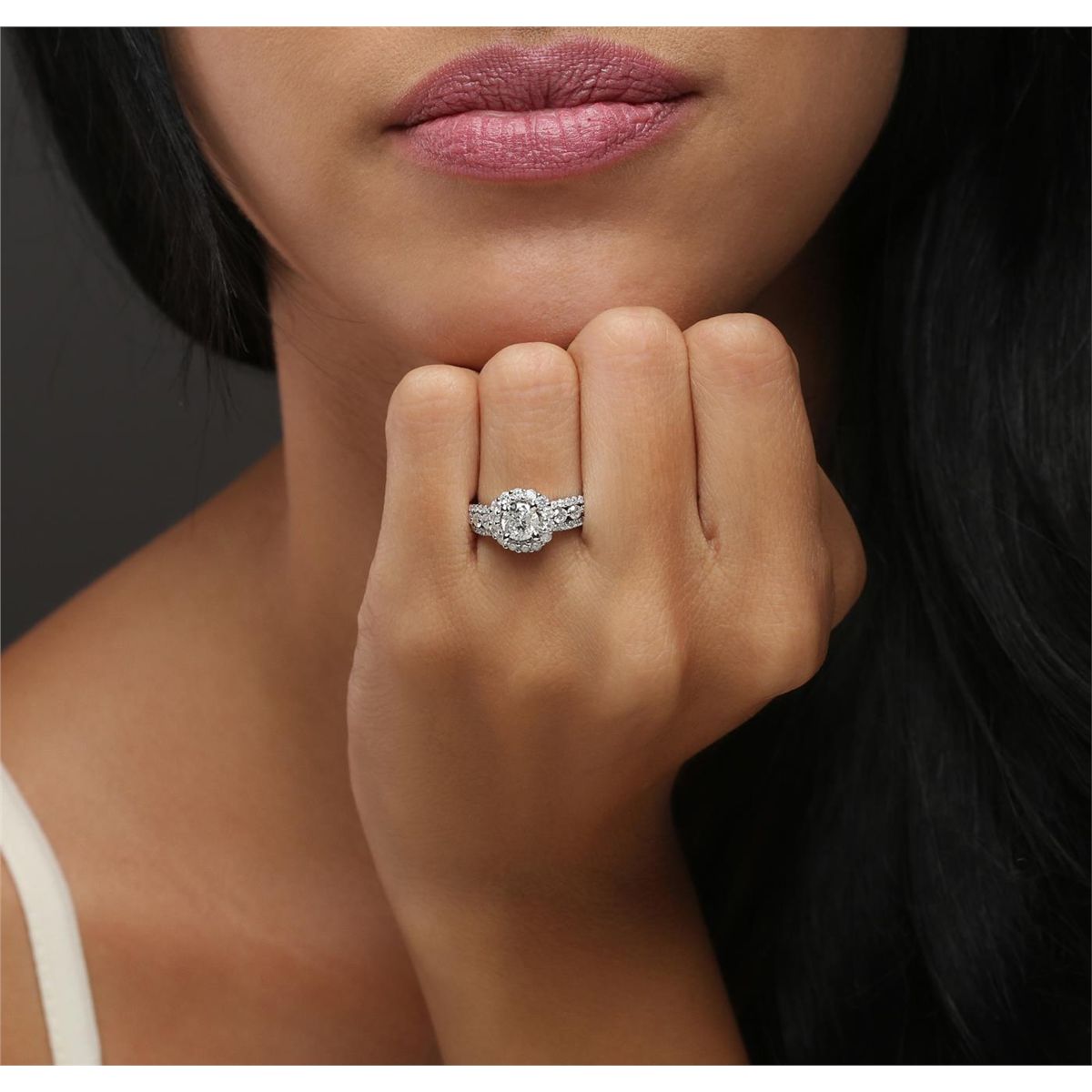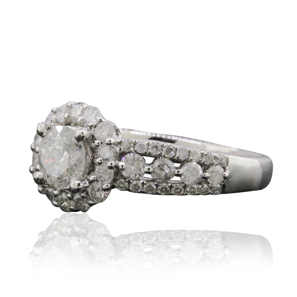 One electronically tested 14KT white gold ladies combination cast & assembled engagement ring with a split shank with a bright polish finish. Identified with markings of "14K". Condition is new. Containing: One prong set round brilliant cut diamond, measuring 5.50 - 5.50 x 3.60mm (depth est.) approximate weight of 0.66ct. Clarity: I-2. Color: J, Cut is Good. Twenty-Two prong set round brilliant cut diamonds, measuring 2.20 - 1.80 x 1.20mm (depth est.) approximate total weight of 22 Stones = 0.64ct. Clarity: SI-1 to I-1. Color: I - J, Cut is Good. Thirty-Two prong set round brilliant cut diamonds, measuring 1.00 - 1.00 x 0.60mm (depth est.) approximate total weight of 32 Stones = 0.12ct. Clarity: I-1 to I-2. Color: I - J, Cut is Good. All diamonds are graded in the mounting, unless otherwise stated. Total Weight of Diamonds 1.42ct. Total Weight of Ring 4.70 grams. GGL Appraised at $6,595.00.