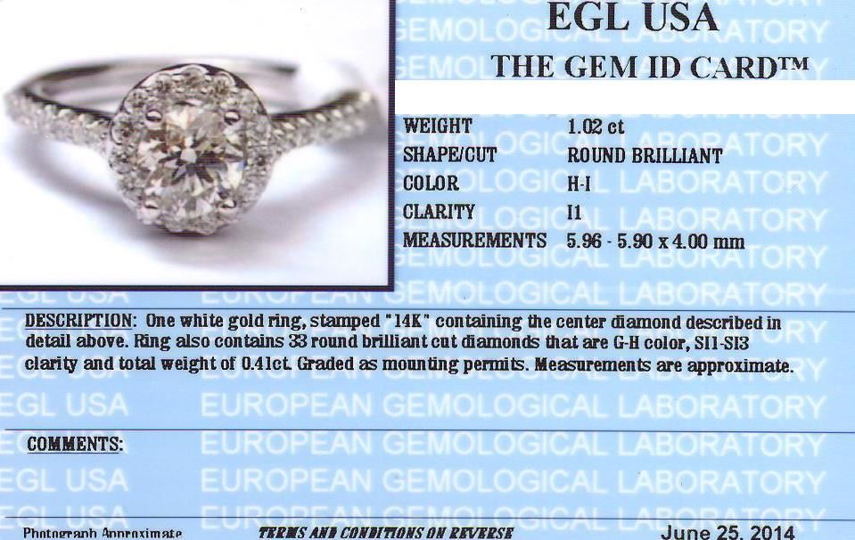 One electronically tested 14KT white gold Ladies combination cast & assembled engagement ring with a bright polish finish. Condition is new. Identified with markings of "14K". Containing: One prong set round brilliant cut diamond, measuring 5.96 - 5.90 x 4.00mm (depth est.) approximate. Total Weight of 1.02ct. Clarity: I-1. Color: H, Cut is Good. Thirty-Three prong set round brilliant cut diamonds, measuring 1.50 - 1.50 x 0.90mm (depth est.) approximate. Total Weight of 33 Stones = 0.41ct. Clarity: SI-1 to SI-3. Color: G - H, Cut is Good. EGL USA GEM ID# US 911348440D. All diamonds are graded in the mounting, unless otherwise stated. Total Weight of Diamonds 1.43ct. Total Weight of Engagement Ring 4.20 grams. GGL Appraised at $17,645.00.