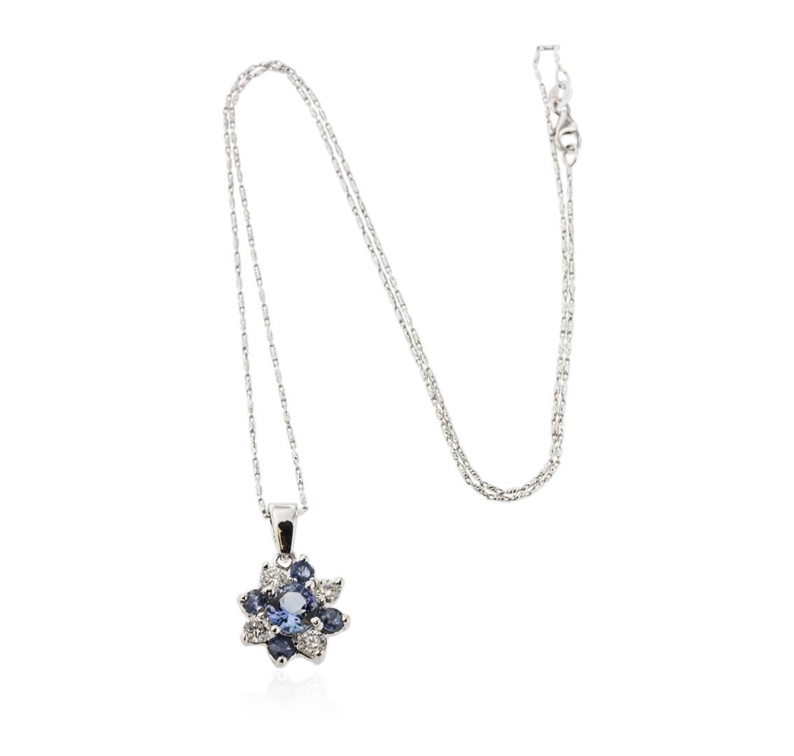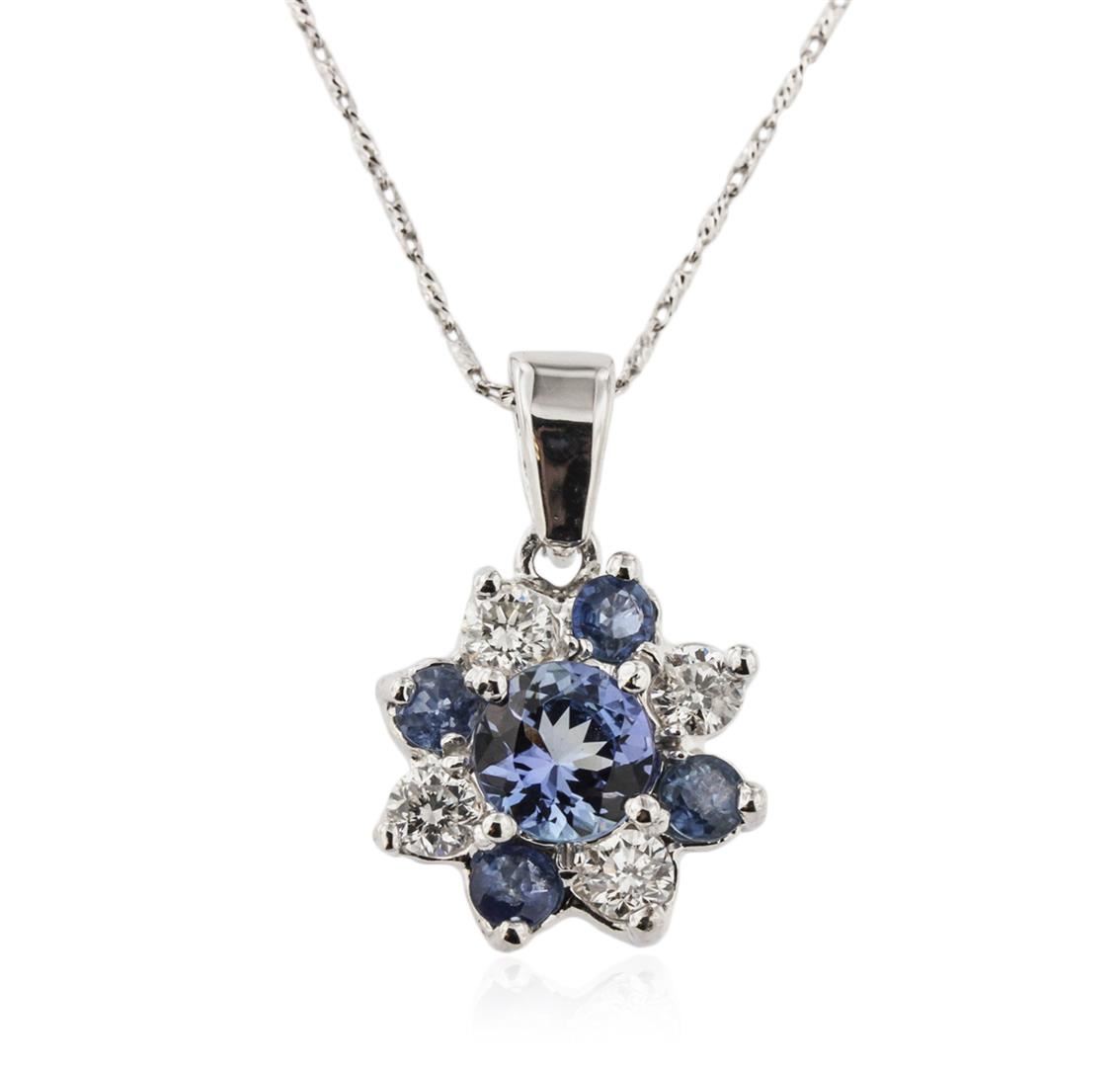 One electronically tested 14KT white gold ladies combination cast & assembled tanzanite, sapphire and diamond pendant & chain 18.0" long, with a lobster claw clasp with a bright polish finish. Identified with markings of "14K". Condition is new. Containing: One prong set round modified brilliant cut natural tanzanite, measuring 6.90 - 6.90 x 4.49 mm, approximate weight of 1.43ct., clarity is eye clean, type I, medium light, moderately strong, violet color, (GIA V 4/4), cut is good. Four prong set round modified brilliant cut natural blue sapphires, measuring 4.00 - 4.00 x 2.60 mm, approximate total weight of 1.32ct., clarity is heavily included, type II, medium light, very slightly grayish, violetish blue color, (GIA vB 4/3). Four prong set round brilliant cut diamonds, measuring 3.50 - 3.50 x 2.10mm (depth est.) approximate total weight of 4 Stones = 0.63ct. Clarity of SI-1 to SI-2, Color of I - J, Cut is Good. All diamonds and colored gemstones are graded in the mounting, unless otherwise stated. Colored gemstones are presumed to have been subjected to commonly used enhancement processes. Total Weight of Colored Stones 2.75ct. Total Weight of Diamonds 0.63ct. Total Weight of Pendant & Chain 6.20 grams. GGL Appraised at $4,270.00.