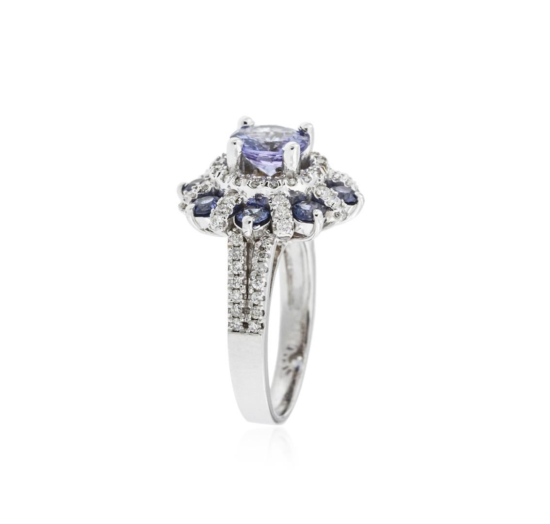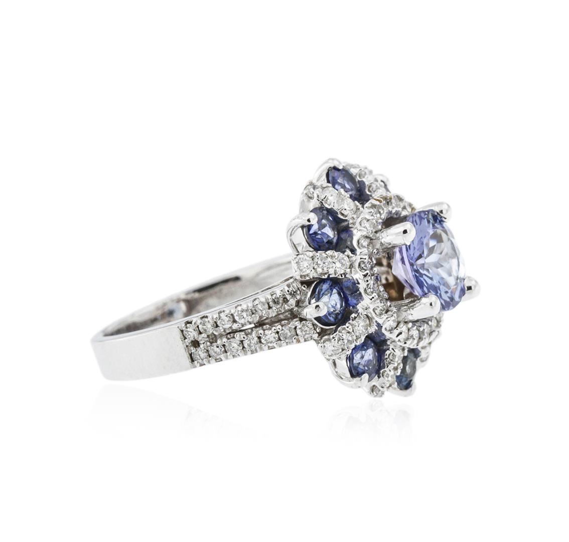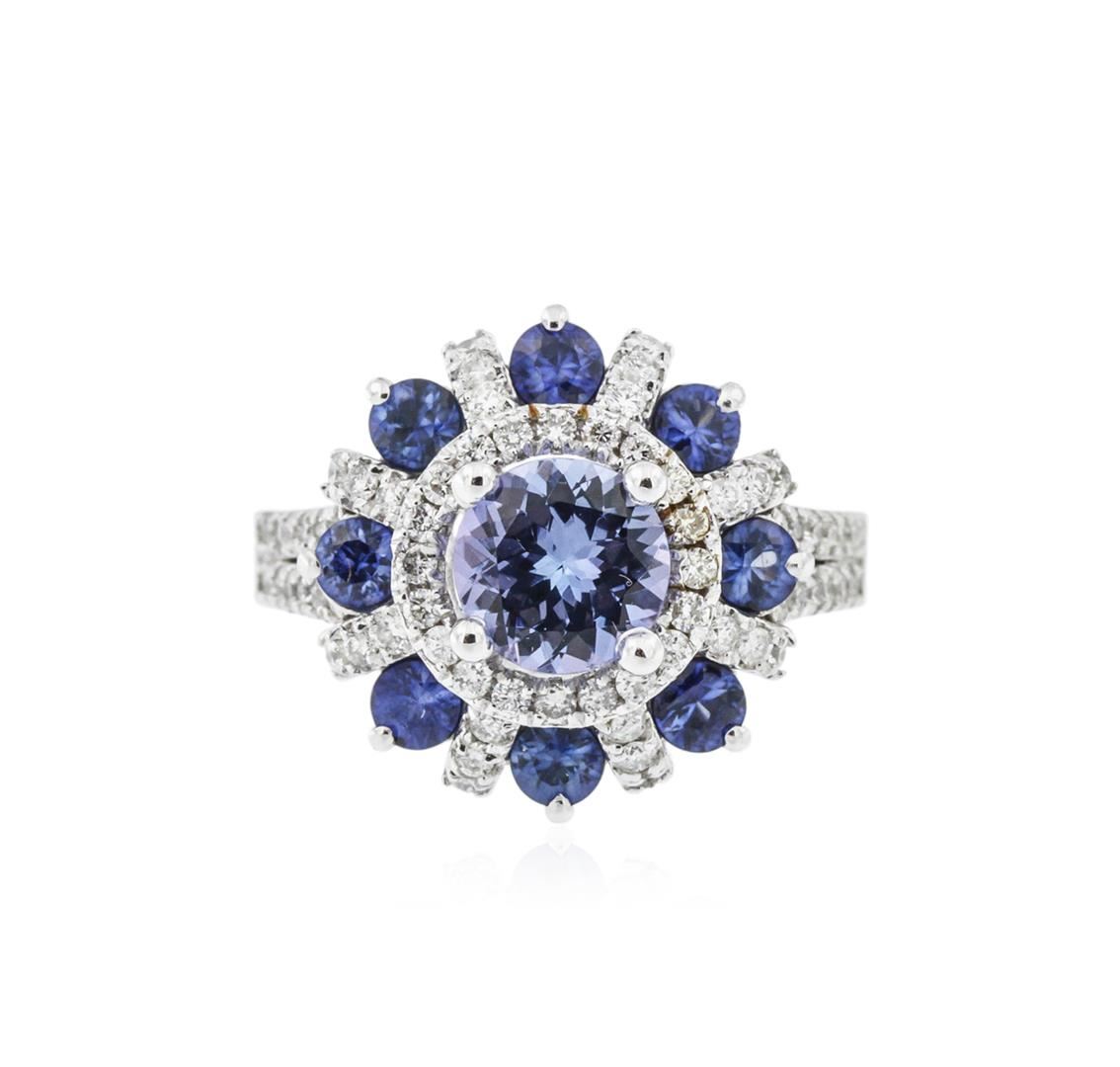 One electronically tested 14KT white gold ladies cast tanzanite, sapphire and diamond ring with a bright polish finish. Identified with markings of "14K". Condition is new. Containing: One prong set round modified brilliant cut natural tanzanite, measuring 6.90 - 6.90 x 4.49 mm, approximate weight of 1.43ct., clarity is eye clean, type I, medium light, very slightly grayish, violet color, (GIA V 4/3), cut is good. Eight prong set round modified brilliant cut natural blue sapphires, measuring 3.00 - 3.00 x 1.95 mm, approximate total weight of 1.12ct., clarity is slightly included, type II, medium, moderately strong, blue color, (GIA B 5/4), cut is good. Seventy-Two prong set round brilliant cut diamonds, measuring 1.30 - 1.30 x 0.78mm (depth est.) approximate total weight of 72 Stones = 0.58ct. Clarity of SI-2 to I-2, Color of I - J, Cut is Good. Colored gemstones are presumed to have been subjected to commonly used enhancement processes. All diamonds and colored gemstones are graded in the mounting, unless otherwise stated. Total Weight of Colored Stones 2.55ct. Total Weight of Diamonds 0.58ct. Total Weight of Ring 6.50 grams. GGL Appraised at $4,425.00.