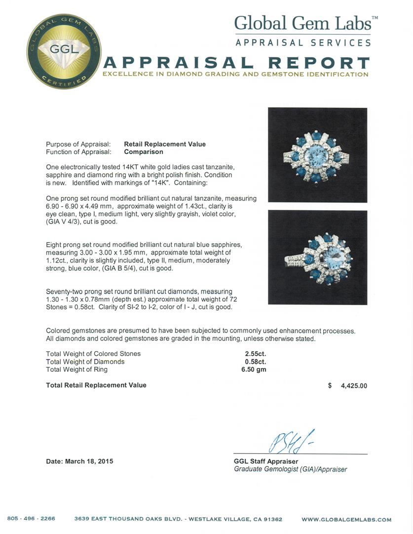 One electronically tested 14KT white gold ladies cast tanzanite, sapphire and diamond ring with a bright polish finish. Identified with markings of "14K". Condition is new. Containing: One prong set round modified brilliant cut natural tanzanite, measuring 6.90 - 6.90 x 4.49 mm, approximate weight of 1.43ct., clarity is eye clean, type I, medium light, very slightly grayish, violet color, (GIA V 4/3), cut is good. Eight prong set round modified brilliant cut natural blue sapphires, measuring 3.00 - 3.00 x 1.95 mm, approximate total weight of 1.12ct., clarity is slightly included, type II, medium, moderately strong, blue color, (GIA B 5/4), cut is good. Seventy-Two prong set round brilliant cut diamonds, measuring 1.30 - 1.30 x 0.78mm (depth est.) approximate total weight of 72 Stones = 0.58ct. Clarity of SI-2 to I-2, Color of I - J, Cut is Good. Colored gemstones are presumed to have been subjected to commonly used enhancement processes. All diamonds and colored gemstones are graded in the mounting, unless otherwise stated. Total Weight of Colored Stones 2.55ct. Total Weight of Diamonds 0.58ct. Total Weight of Ring 6.50 grams. GGL Appraised at $4,425.00.