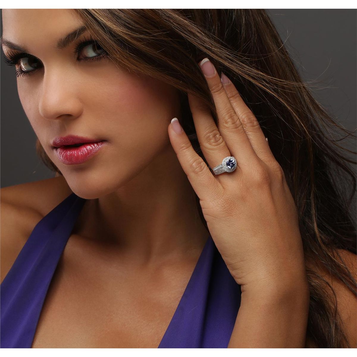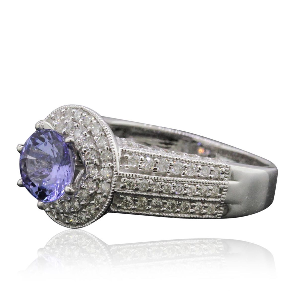 One electronically tested 14KT white gold ladies combination cast & assembled tanzanite and diamond ring with a flat shank with a bright polish finish. Identified with markings of "14K". Condition is new. Containing: One prong set round modified brilliant cut natural tanzanite, measuring 6.90 - 6.90 x 4.49 mm, approximate weight of 1.43ct., clarity is eye clean, type I, medium light, very slightly grayish, violet color, (GIA V 4/3), cut is very good. One Hundred Seventeen prong set round brilliant cut diamonds, measuring 1.10 - 1.10 x 0.66mm (depth est.) approximate total weight of 117 Stones = 0.56ct. Clarity: I-1 to I-2. Color: I - J, Cut is Good. Colored gemstones are presumed to have been subjected to commonly used enhancement processes. All diamonds and colored gemstones are graded in the mounting, unless otherwise stated. Total Weight of Colored Stones 1.43ct. Total Weight of Diamonds 0.56ct. Total Weight of Ring 5.50 grams. GGL Appraised at $5,390.00.