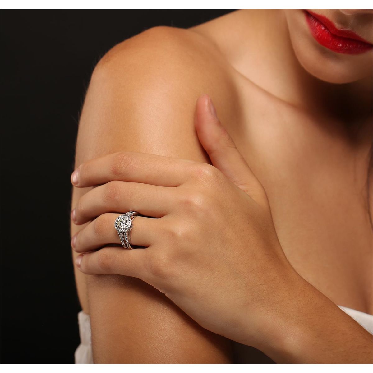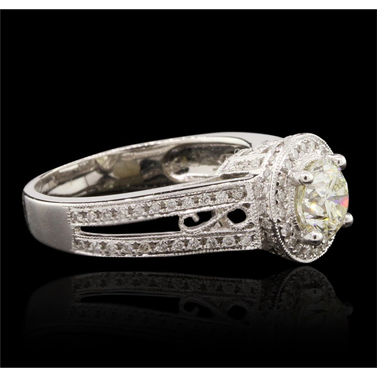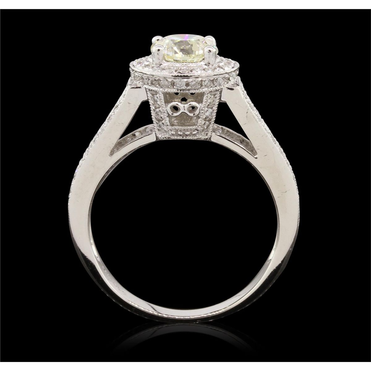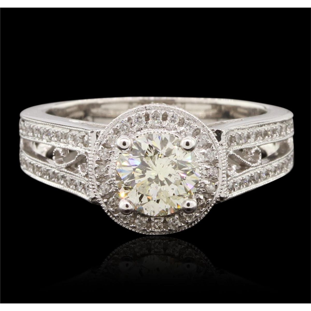 One electronically tested 14KT white gold ladies cast diamond unity ring. The featured diamond is set within a diamond bezel supported by diamond set split shoulders, completed by a three millimeter wide band. Bright polish finish with milgrain detailing throughout. Identified with markings of "14K 585". Condition is new, good workmanship. Containing: One prong set round brilliant cut diamond, measuring 6.30 - 6.30 x 4.05mm (depth est.), 5.00%. GTCF approximate weight of 1.05ct with a strong blue fluorescence. Graded in the setting. Clarity: I-1 . Depth: 64.3%. Table 58.7%. Ninety-Eight bead set round brilliant cut diamonds, measuring 1.00 - 1.00 x 0.60mm (depth est.) approximate. Total Weight of 98 Stones = 0.38ct. Graded in the setting. Clarity: SI-2 to I-2 . Color: H - J. Total Weight of Diamonds 1.43ct. AIG Appraised at $11,360.00.
