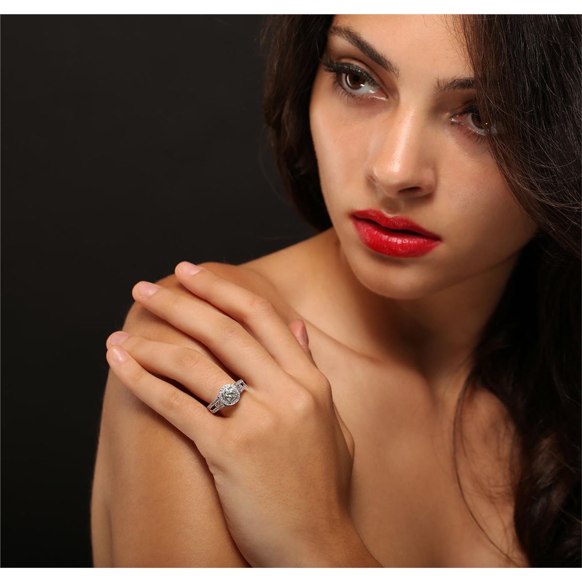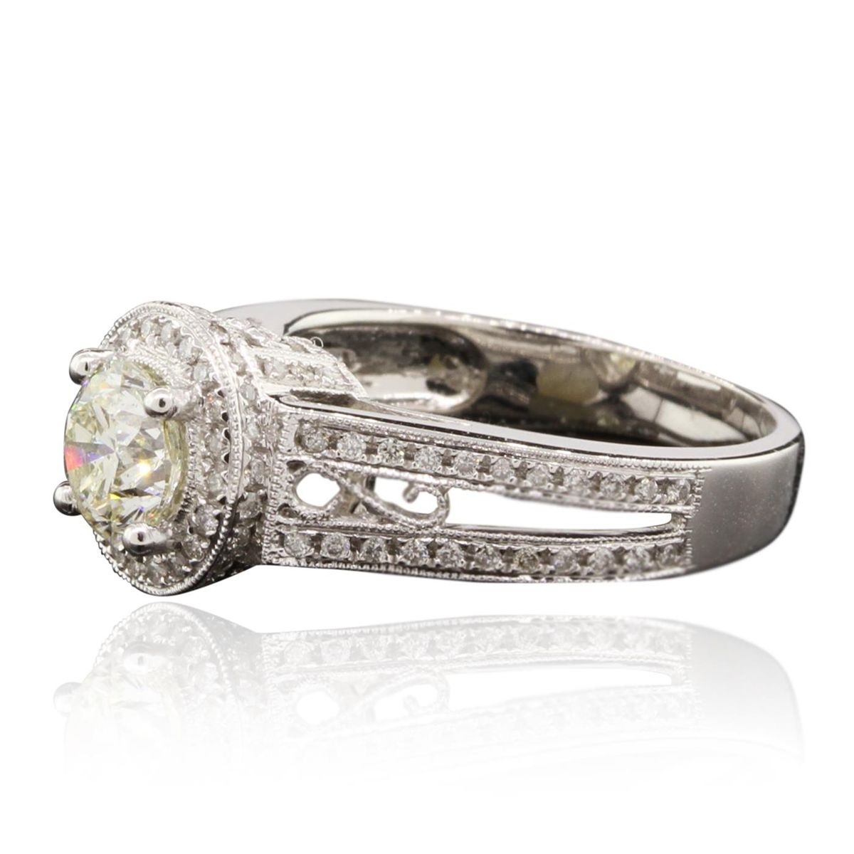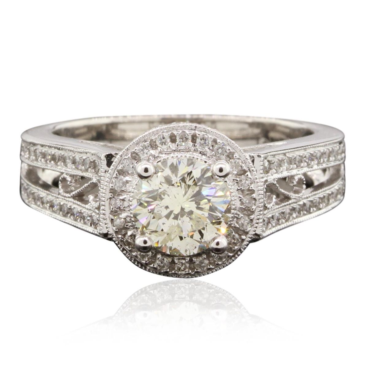 One electronically tested 14KT white gold ladies cast diamond unity ring. The featured diamond is set within a diamond bezel supported by diamond set split shoulders, completed by a three millimeter wide band. Bright polish finish with milgrain detailing throughout. Identified with markings of "14K 585". Condition is new, good workmanship. Containing: One prong set round brilliant cut diamond, measuring 6.30 - 6.30 x 4.05mm (depth est.), 5.00%. GTCF approximate weight of 1.05ct with a strong blue fluorescence. Graded in the setting. Clarity: I-1 . Depth: 64.3%. Table 58.7%. Ninety-Eight bead set round brilliant cut diamonds, measuring 1.00 - 1.00 x 0.60mm (depth est.) approximate. Total Weight of 98 Stones = 0.38ct. Graded in the setting. Clarity: SI-2 to I-2 . Color: H - J. Total Weight of Diamonds 1.43ct. AIG Appraised at $11,360.00.