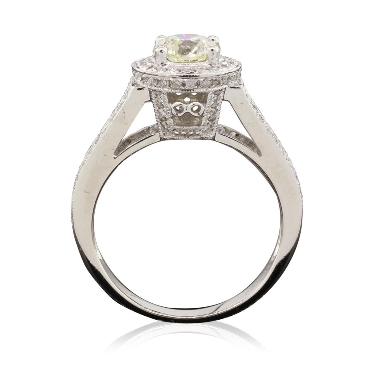 One electronically tested 14KT white gold ladies cast diamond unity ring. The featured diamond is set within a diamond bezel supported by diamond set split shoulders, completed by a three millimeter wide band. Bright polish finish with milgrain detailing throughout. Identified with markings of "14K 585". Condition is new, good workmanship. Containing: One prong set round brilliant cut diamond, measuring 6.30 - 6.30 x 4.05mm (depth est.), 5.00%. GTCF approximate weight of 1.05ct with a strong blue fluorescence. Graded in the setting. Clarity: I-1 . Depth: 64.3%. Table 58.7%. Ninety-Eight bead set round brilliant cut diamonds, measuring 1.00 - 1.00 x 0.60mm (depth est.) approximate. Total Weight of 98 Stones = 0.38ct. Graded in the setting. Clarity: SI-2 to I-2 . Color: H - J. Total Weight of Diamonds 1.43ct. AIG Appraised at $11,360.00.