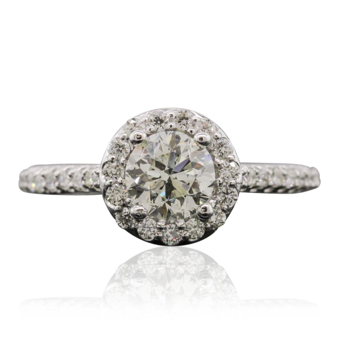 One electronically tested 14KT white gold Ladies combination cast & assembled engagement ring with a bright polish finish. Condition is new. Identified with markings of "14K". Containing: One prong set round brilliant cut diamond, measuring 5.96 - 5.90 x 4.00mm (depth est.) approximate. Total Weight of 1.02ct. Clarity: I-1. Color: H, Cut is Good. Thirty-Three prong set round brilliant cut diamonds, measuring 1.50 - 1.50 x 0.90mm (depth est.) approximate. Total Weight of 33 Stones = 0.41ct. Clarity: SI-1 to SI-3. Color: G - H, Cut is Good. EGL USA GEM ID# US 911348440D. All diamonds are graded in the mounting, unless otherwise stated. Total Weight of Diamonds 1.43ct. Total Weight of Engagement Ring 4.20 grams. GGL Appraised at $17,645.00.