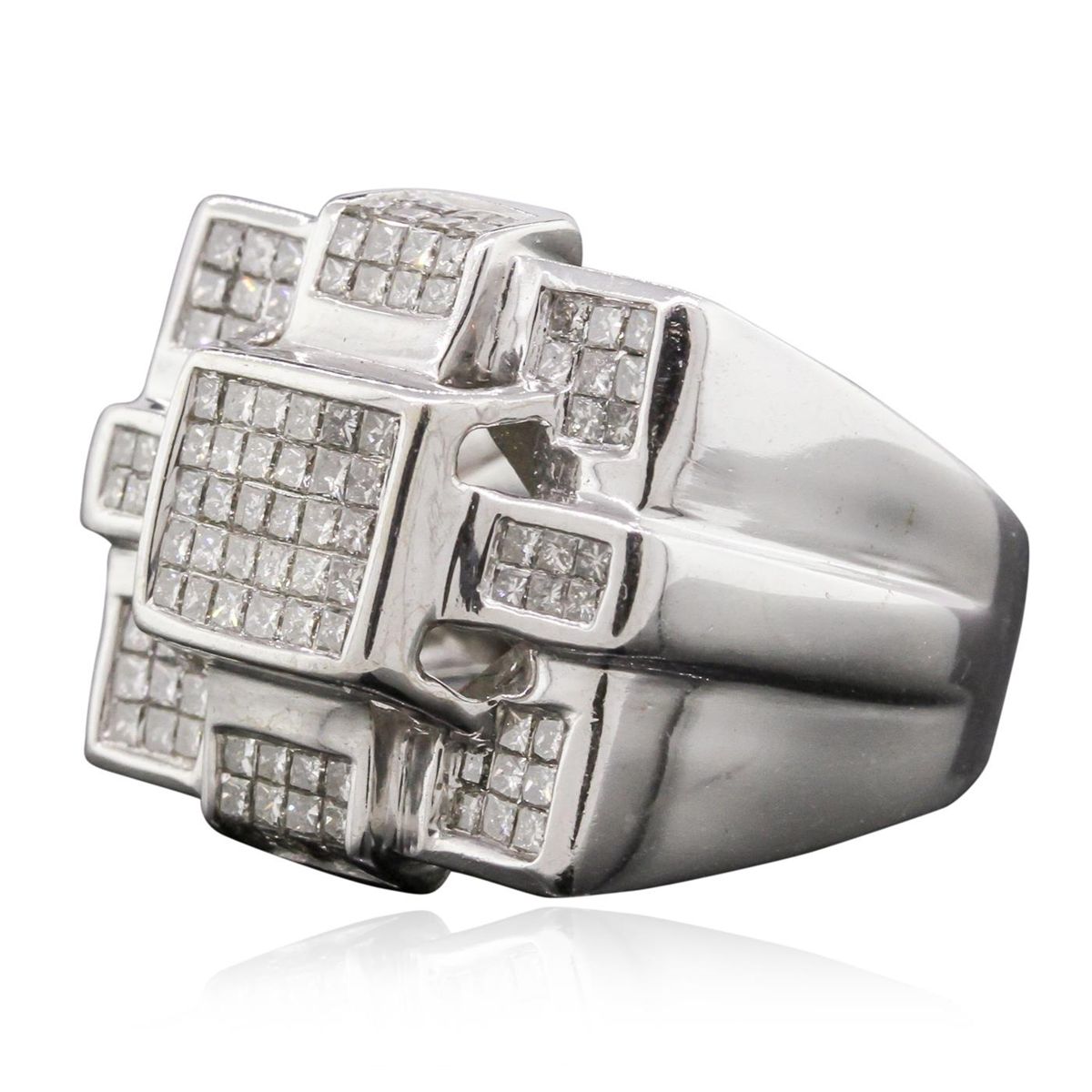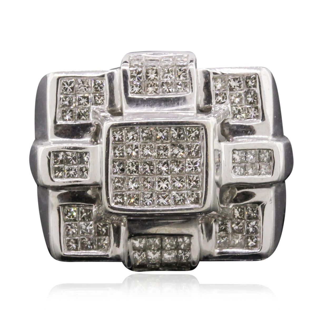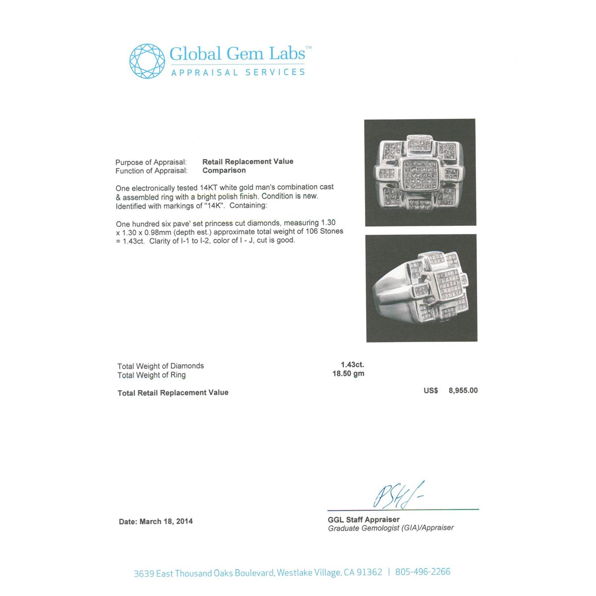 One electronically tested 14KT white gold man's combination cast & assembled ring with a bright polish finish. Condition is new. Identified with markings of "14K". Containing: One Hundred Six pave' set princess cut diamonds, measuring 1.30 x 1.30 x 0.98mm (depth est.) approximate. Total Weight of 106 Stones = 1.43ct. Clarity: I-1 to I-2. Color: I - J, Cut is Good. Total Weight of Diamonds 1.43ct. Total Weight of Ring 18.50gm. GGL Appraised at $8,955.00.