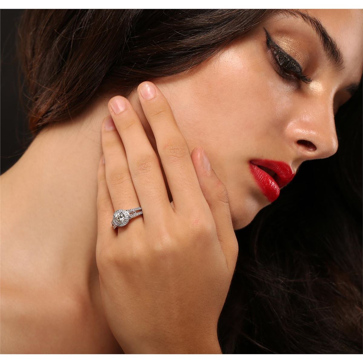 One electronically tested 14KT white gold ladies cast diamond unity ring. The featured diamond is set within a diamond bezel supported by diamond set split shoulders, completed by a three millimeter wide band. Bright polish finish with milgrain detailing throughout. Identified with markings of "14K 585". Condition is new, good workmanship. Containing: One prong set round brilliant cut diamond, measuring 6.30 - 6.30 x 4.05mm (depth est.), 5.00%. GTCF approximate weight of 1.05ct with a strong blue fluorescence. Graded in the setting. Clarity: I-1 . Depth: 64.3%. Table 58.7%. Ninety-Eight bead set round brilliant cut diamonds, measuring 1.00 - 1.00 x 0.60mm (depth est.) approximate. Total Weight of 98 Stones = 0.38ct. Graded in the setting. Clarity: SI-2 to I-2 . Color: H - J. Total Weight of Diamonds 1.43ct. AIG Appraised at $11,360.00.