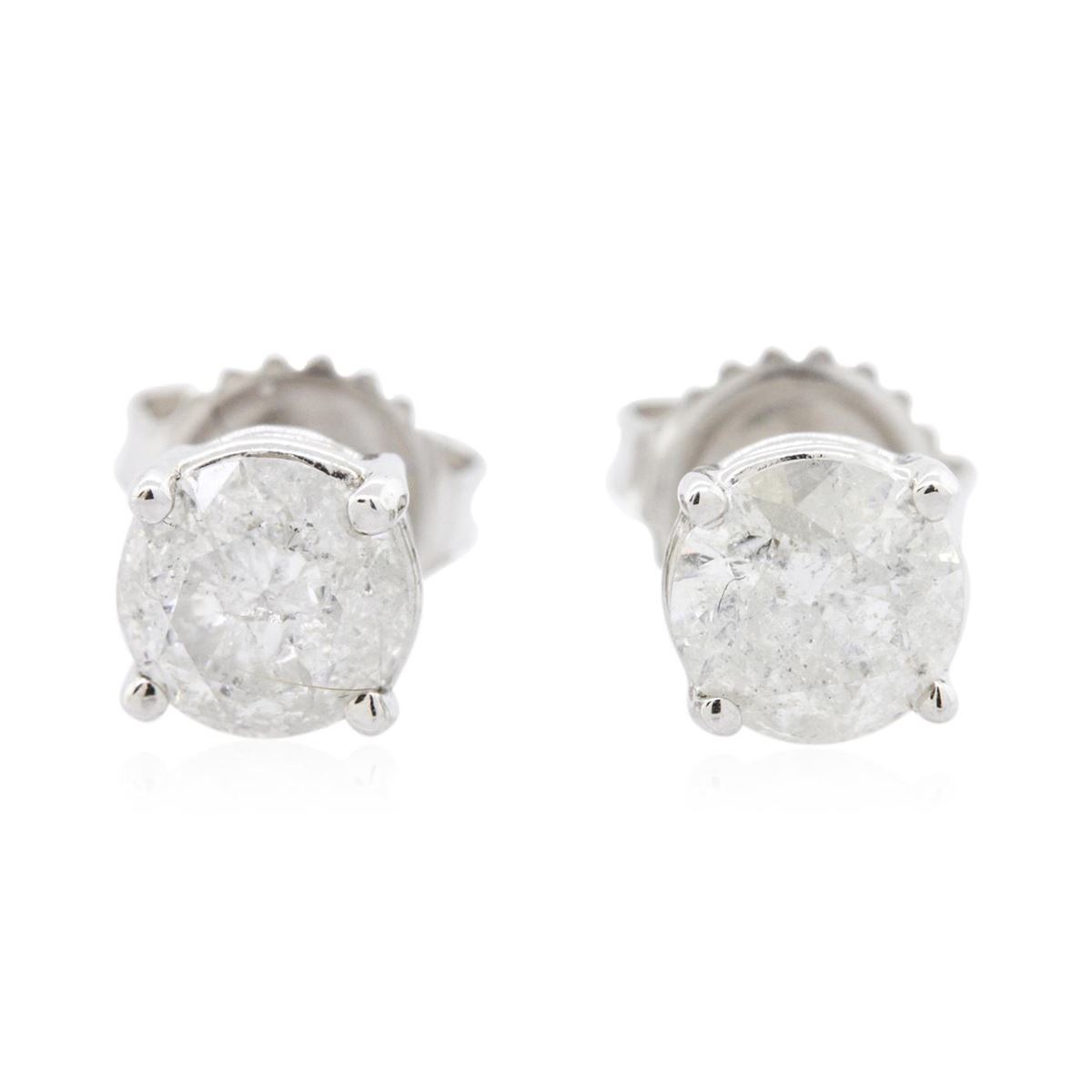 One pair electronically tested 14KT white gold ladies cast stud earrings with friction posts with a bright polish finish. Identified with markings of "14K". Condition is new. Containing: One prong set round brilliant cut diamond, measuring 5.81 - 5.81 x 3.47mm (depth est.) approximate weight of 0.72ct. Clarity: I-3. Color: J, Cut is Good. One prong set round brilliant cut diamond, measuring 5.81 - 5.81 x 3.51mm (depth est.) approximate weight of 0.72ct. Clarity: I-3. Color: J, Cut is Good. All diamonds are graded in the mounting, unless otherwise stated total weight of Diamonds 1.44ct. Total Weight of Earrings 1.60 grams. GGL Appraised at $4,790.00.
