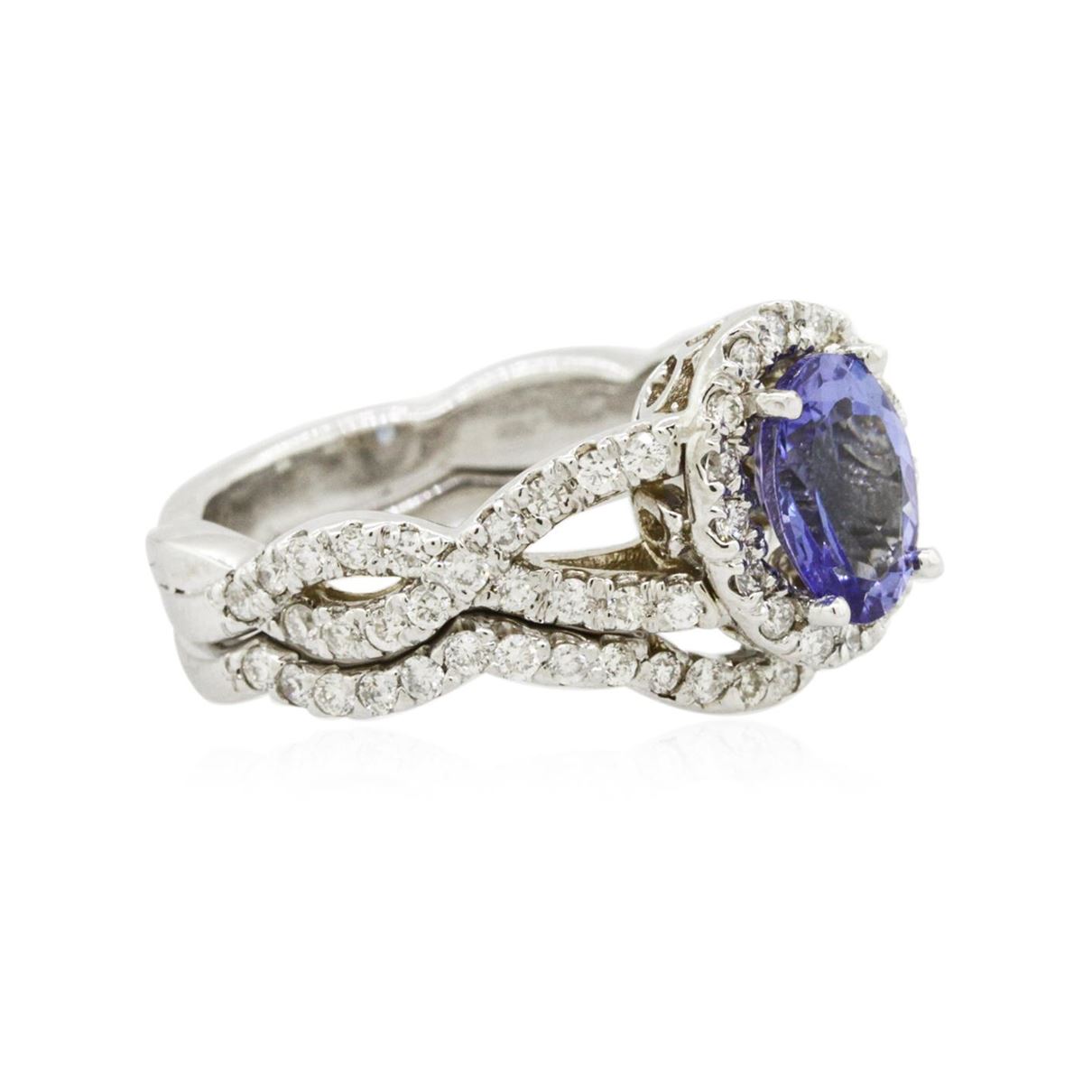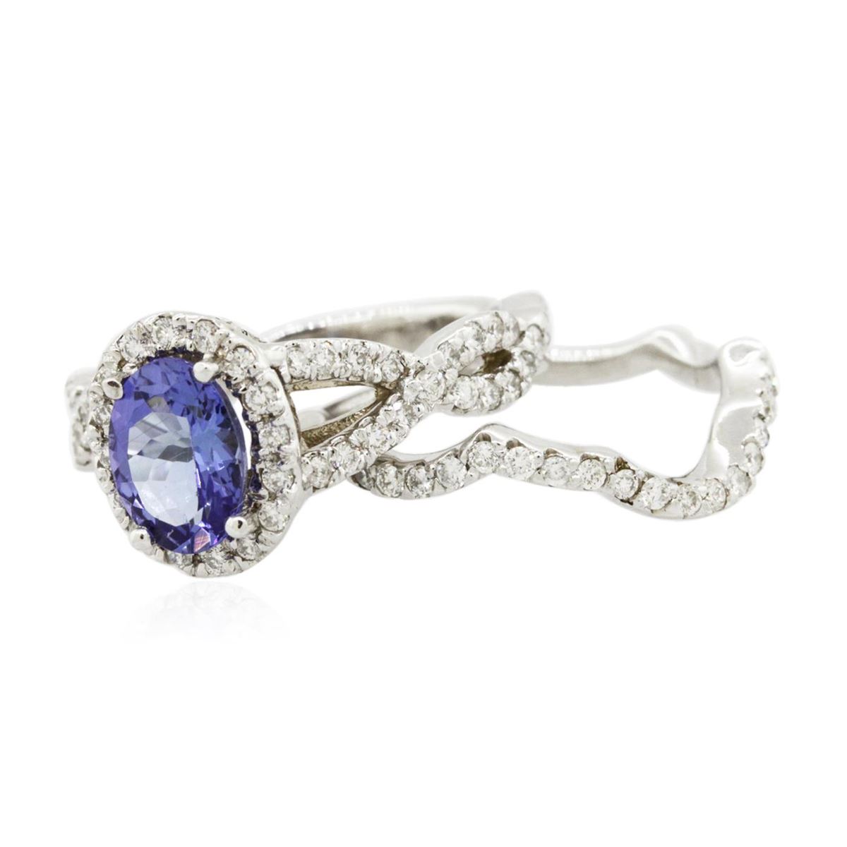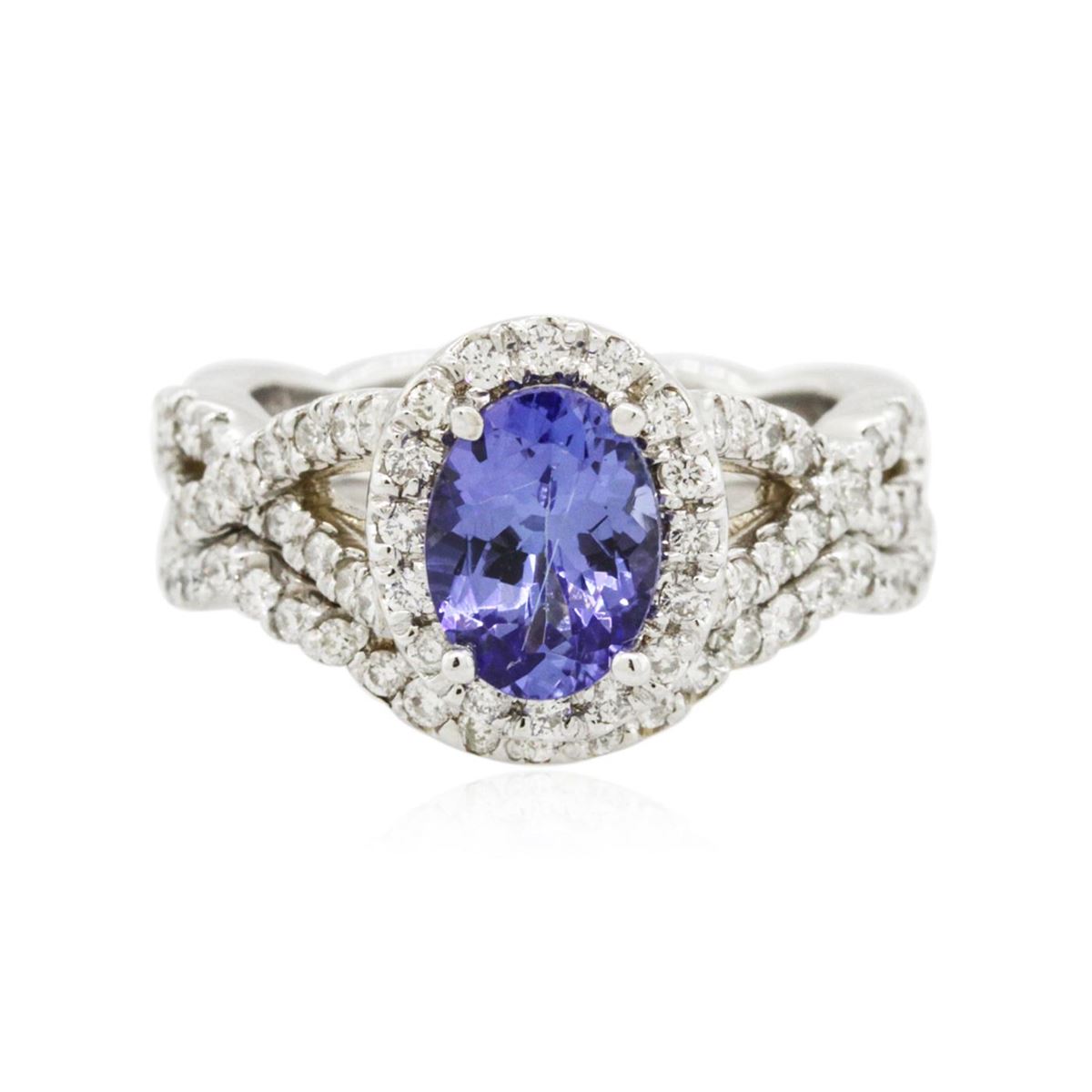 One electronically tested 14KT white gold ladies cast tanzanite and diamond ring and guard with a bright polish finish. Identified with markings of "14K". Condition is new. Containing: One prong set oval modified brilliant cut natural tanzanite, measuring 8.20 x 6.20 x 4.03mm, approximate weight of 1.44ct., clarity is eye clean, type I, medium light, very slightly grayish, violet color, (GIA V 4/3), cut is good. Seventy-Five prong set round brilliant cut diamonds, measuring 1.30 - 1.30 x 0.78mm (depth est.) approximate total weight of 75 Stones = 0.60ct. Clarity: I-1 to I-2. Color: I - J, Cut is Good. Colored gemstones are presumed to have been subjected to commonly used enhancement processes. All diamonds and colored gemstones are graded in the mounting, unless otherwise stated. Total Weight of Colored Stones 1.44ct. Total Weight of Diamonds 0.60ct. Total Weight of Ring And Guard 7.90 grams. GGL Appraised at $5,095.00.
