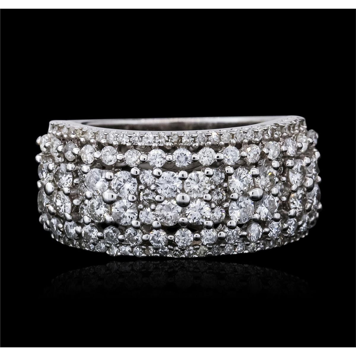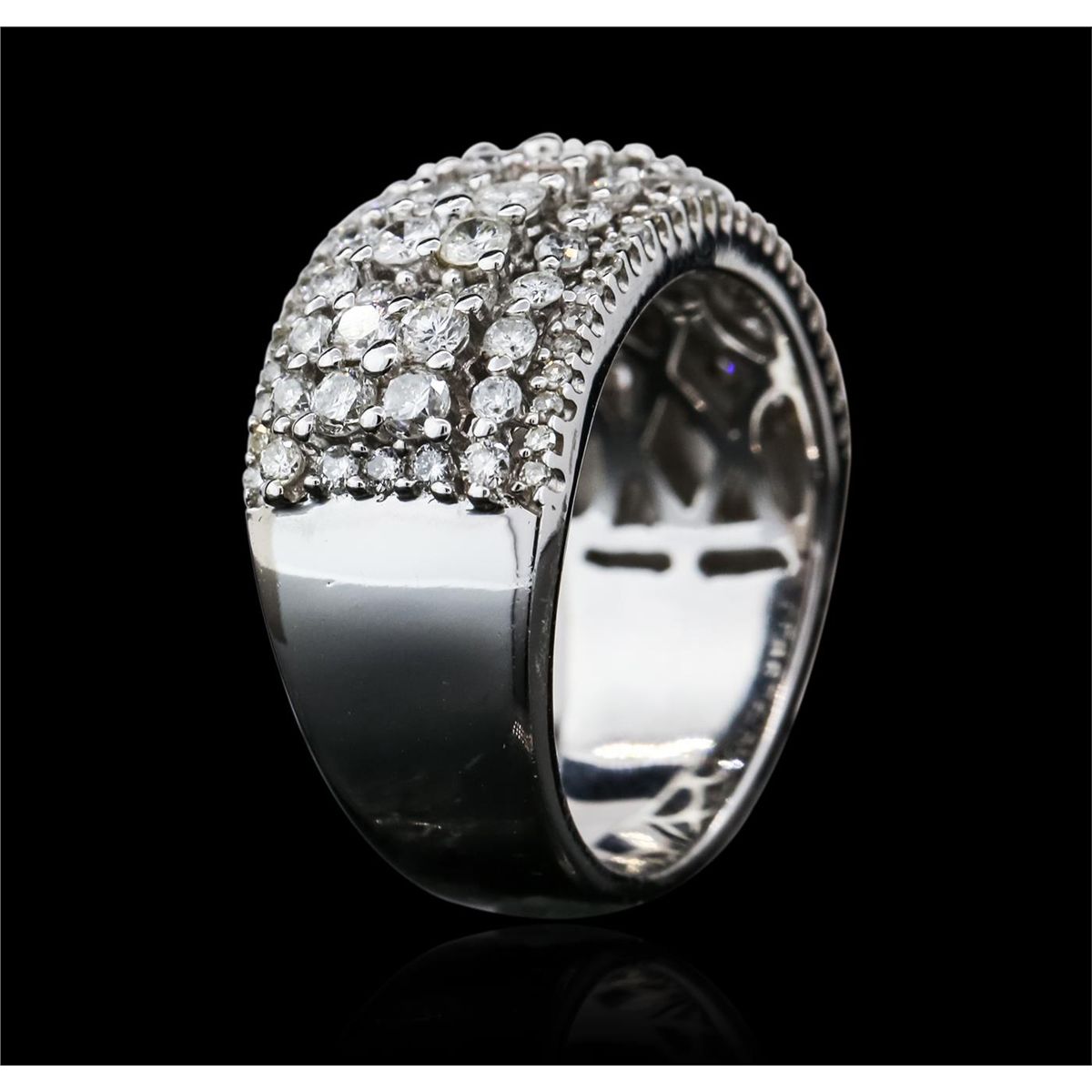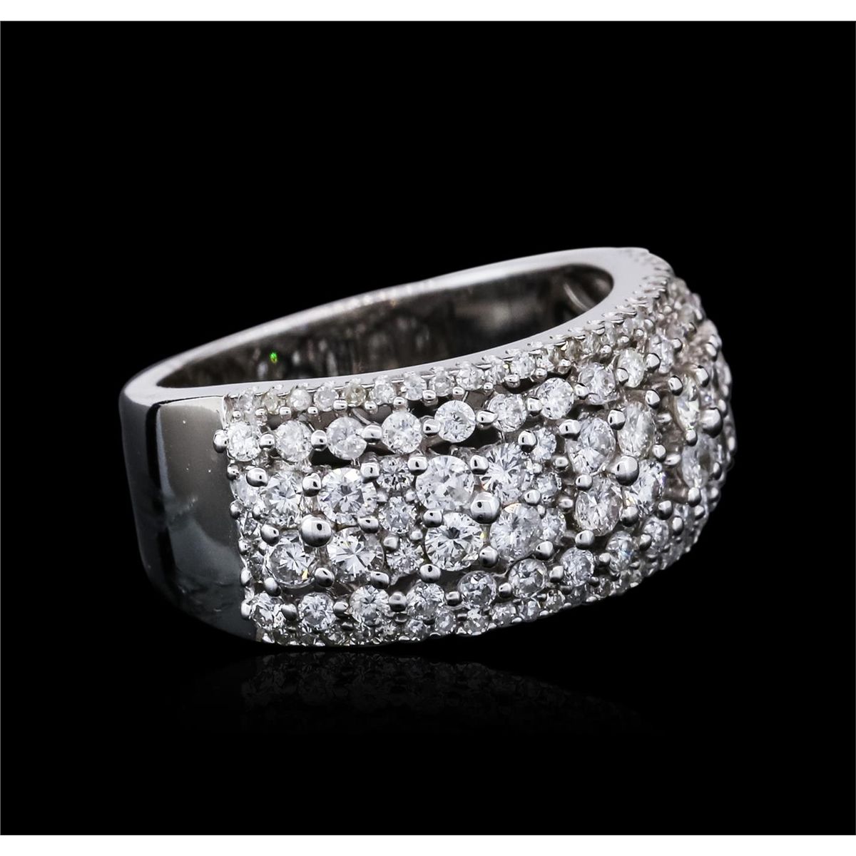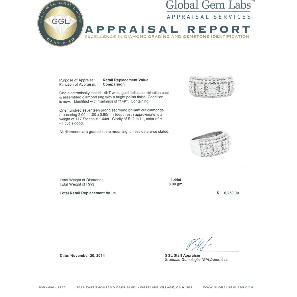 One electronically tested 14KT white gold ladies combination cast & assembled diamond ring with a bright polish finish. Identified with markings of "14K". Condition is new. Containing: One Hundred Seventeen prong set round brilliant cut diamonds, measuring 2.00 - 1.00 x 0.90mm (depth est.) approximate total weight of 117 Stones = 1.44ct. Clarity: SI-2 to I-1. Color: H - I, Cut is Good. All diamonds are graded in the mounting, unless otherwise stated. Total Weight of Diamonds 1.44ct. Total Weight of Ring 8.90 grams. GGL Appraised at $6,250.00.