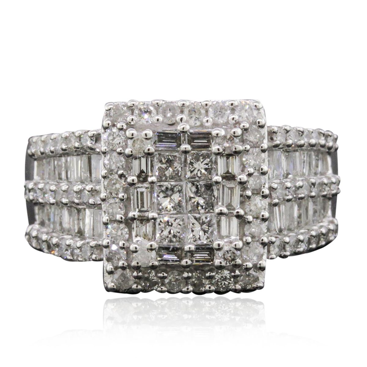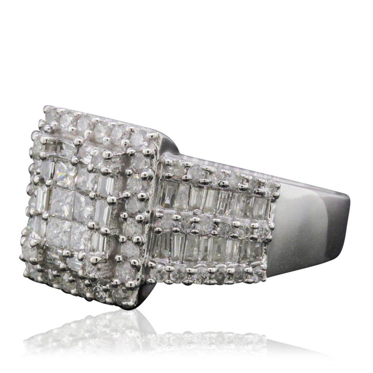 One ring featuring: 14KT white gold weighing 6.23 grams containing six princess cut diamonds with a total weight of 0.28cts, 41 baguette cut diamonds with a total weight of 0.50cts, and 64 round cut diamonds with a total weight of 0.66cts.