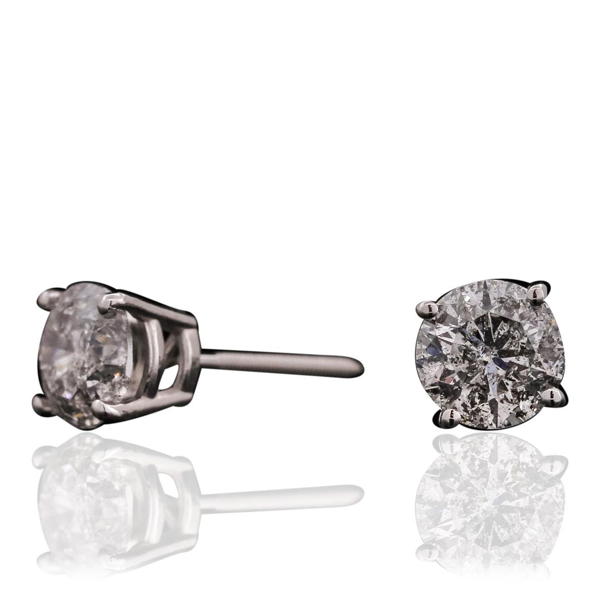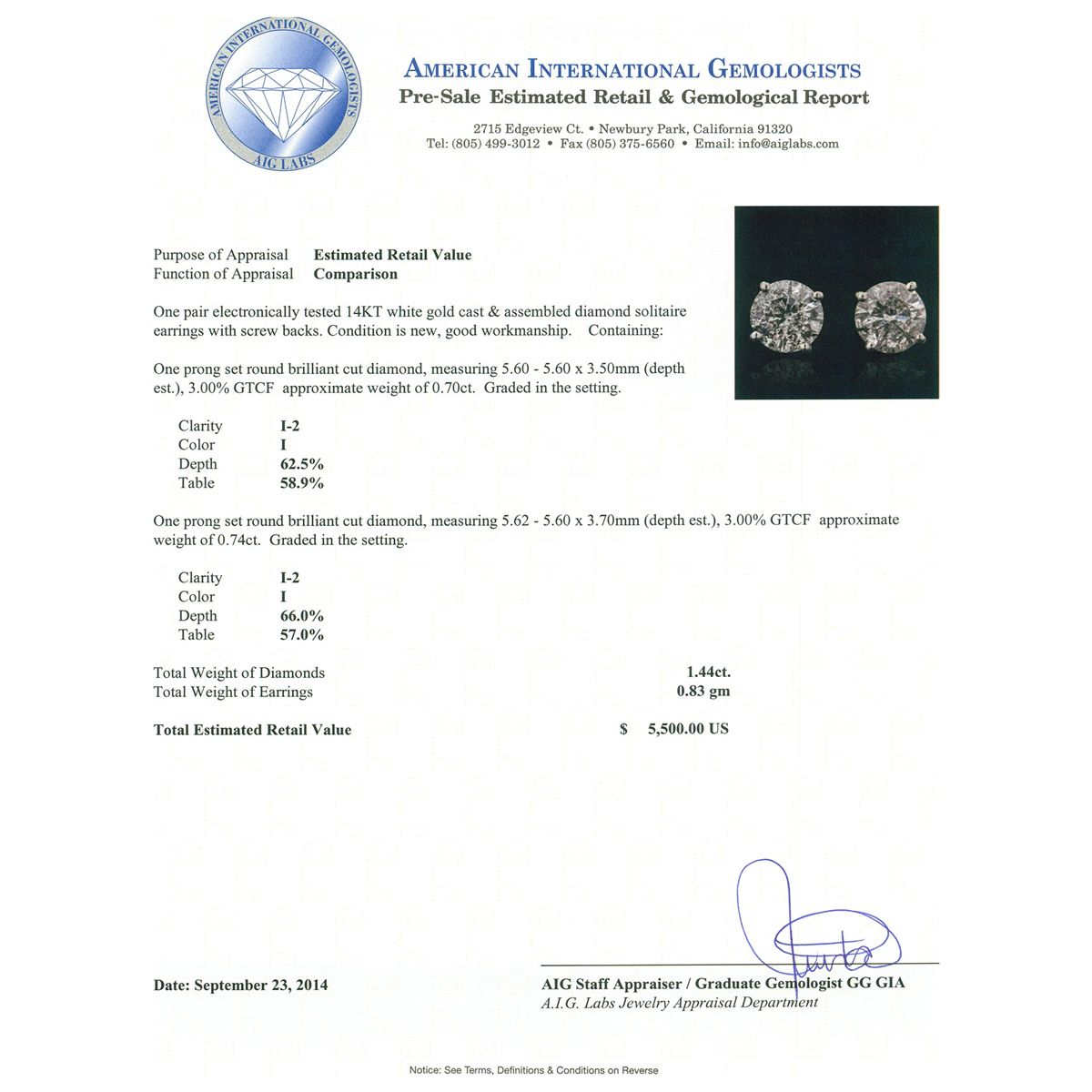 One pair electronically tested 14KT white gold cast & assembled diamond solitaire earrings with screw backs. Condition is new, good workmanship. Containing: One prong set round brilliant cut diamond, measuring 5.60 - 5.60 x 3.50mm (depth est.), 3.00% GTCF approximate weight of 0.70ct. Graded in the setting. Clarity: I-2. Color: I. Depth 62.5%. Table 58.9%. One prong set round brilliant cut diamond, measuring 5.62 - 5.60 x 3.70mm (depth est.), 3.00% GTCF approximate weight of 0.74ct. Graded in the setting. Clarity: I-2. Color: I. Depth 66.0%. Table 57.0%. Total Weight of Diamonds 1.44ct. Total Weight of Earrings 0.83 grams. AIG Appraised at $5,500.00.